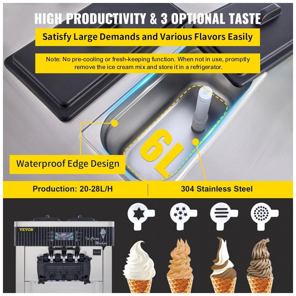 Máquina de Sorvete Hard Serve Comercial VEVOR Prata Cilindro 6L Alta Produção 18L/h 1780W Modelo BQL-128YH