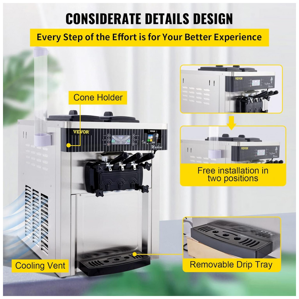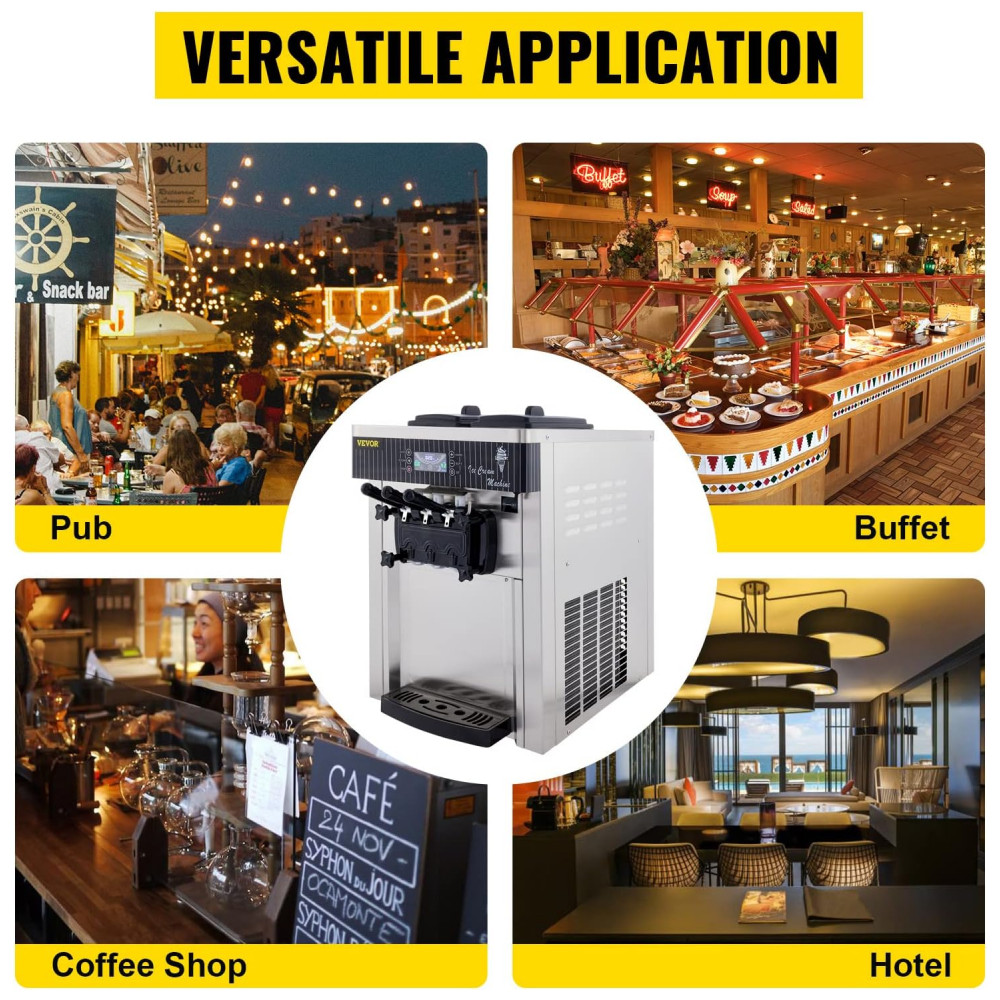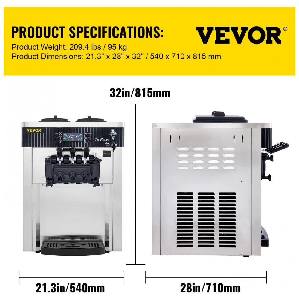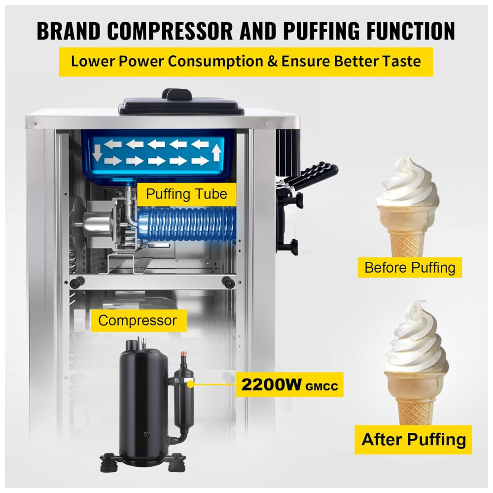 A máquina de sorvete hard serve comercial VEVOR BQL-128YH possui compressor de alto desempenho com potência total de 1780W e cilindro refrigerado de 6 litros fabricado em aço inoxidável SUS304 grau alimentício, garantindo resistência e facilidade de limpeza. O equipamento oferece produção de até 18 litros por hora com tecnologia avançada de agitação tripla e puffing, que proporcionam textura cremosa e homogênea ao sorvete.