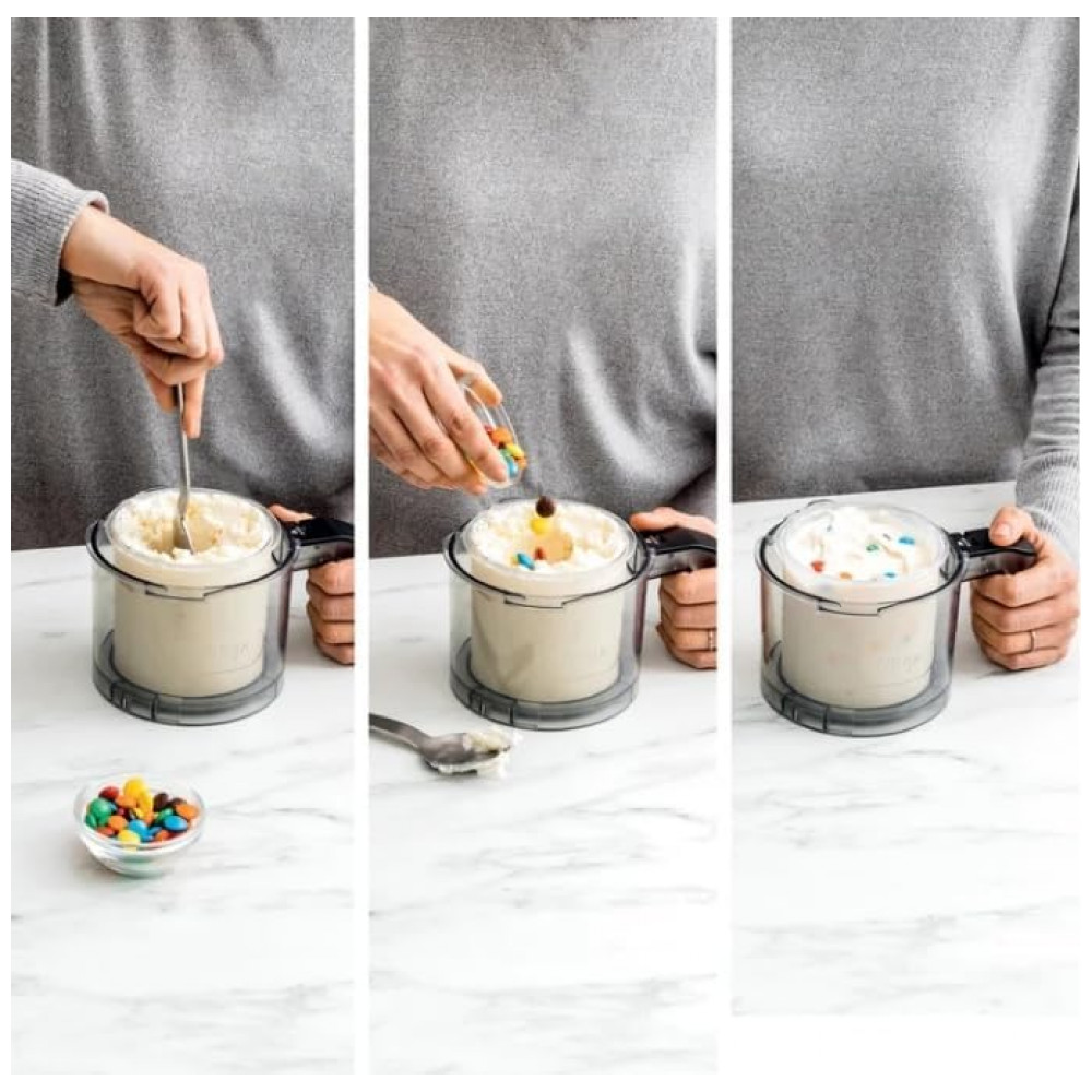 O conjunto possui capacidade XL, acompanhado de três potes deluxe com capacidade nominal de 24 oz cada, equivalente a aproximadamente 710 ml por pote, oferecendo cerca de 50% mais volume por batelada em comparação a modelos padrão da mesma linha do fabricante. A unidade base integra painel de controle digital com programas pré-configurados para os principais tipos de sobremesa congelada, permitindo a seleção simples do modo de preparo e do tipo de saída.