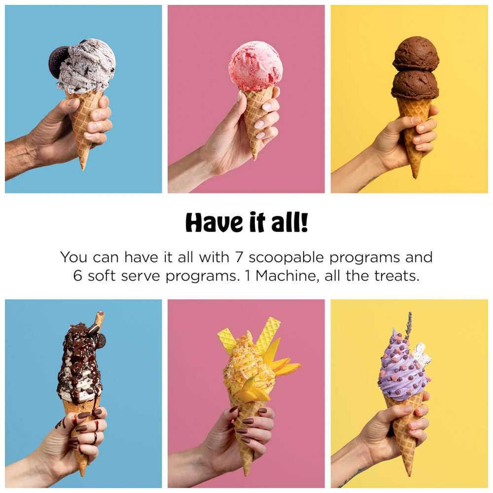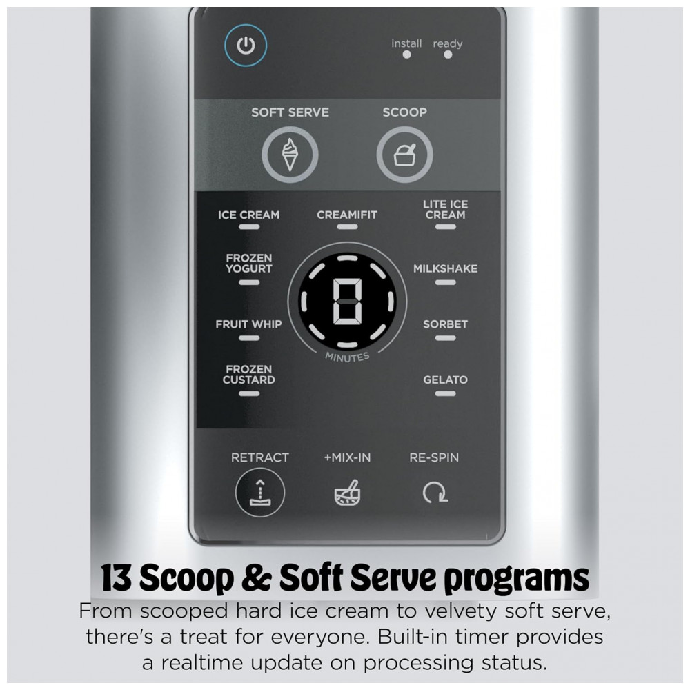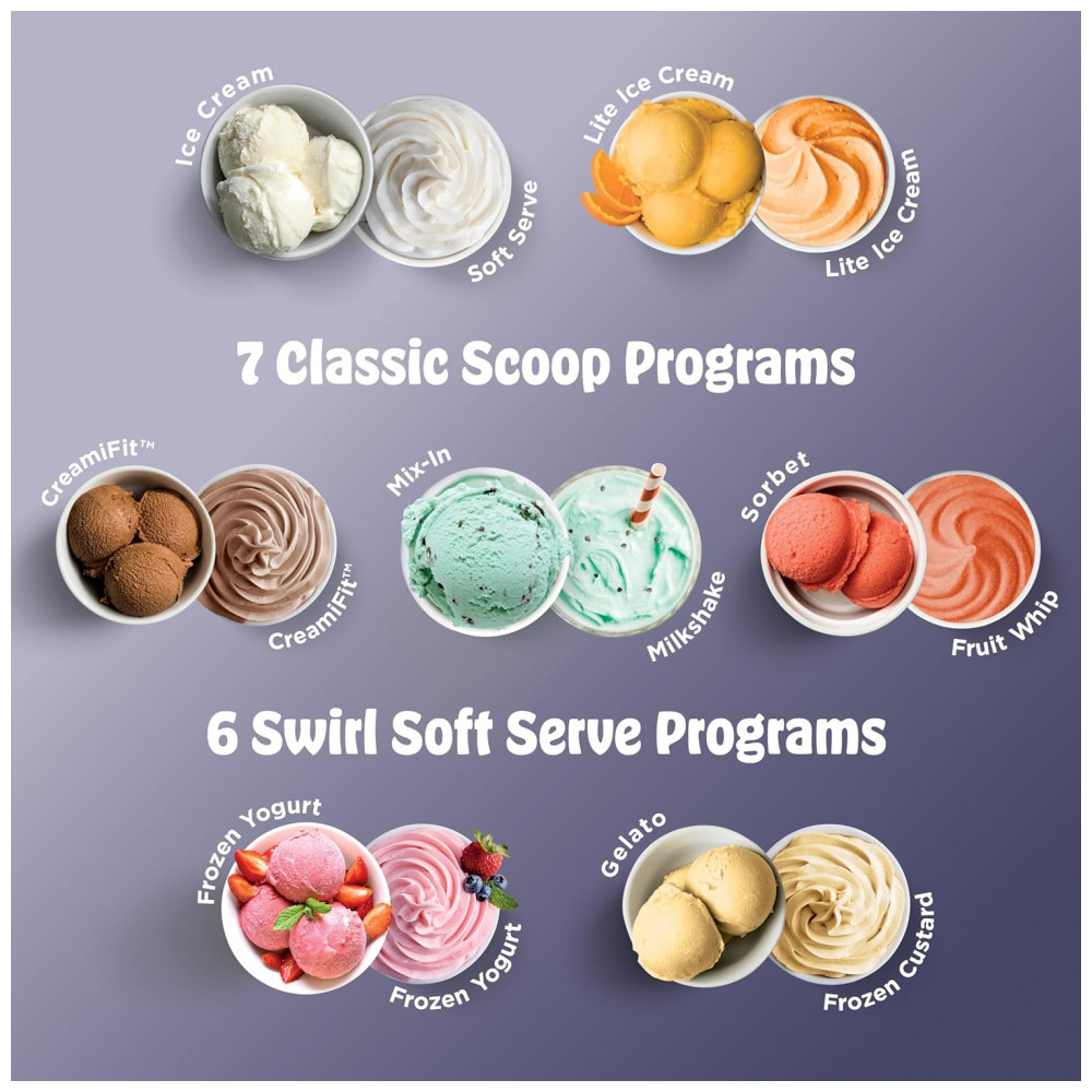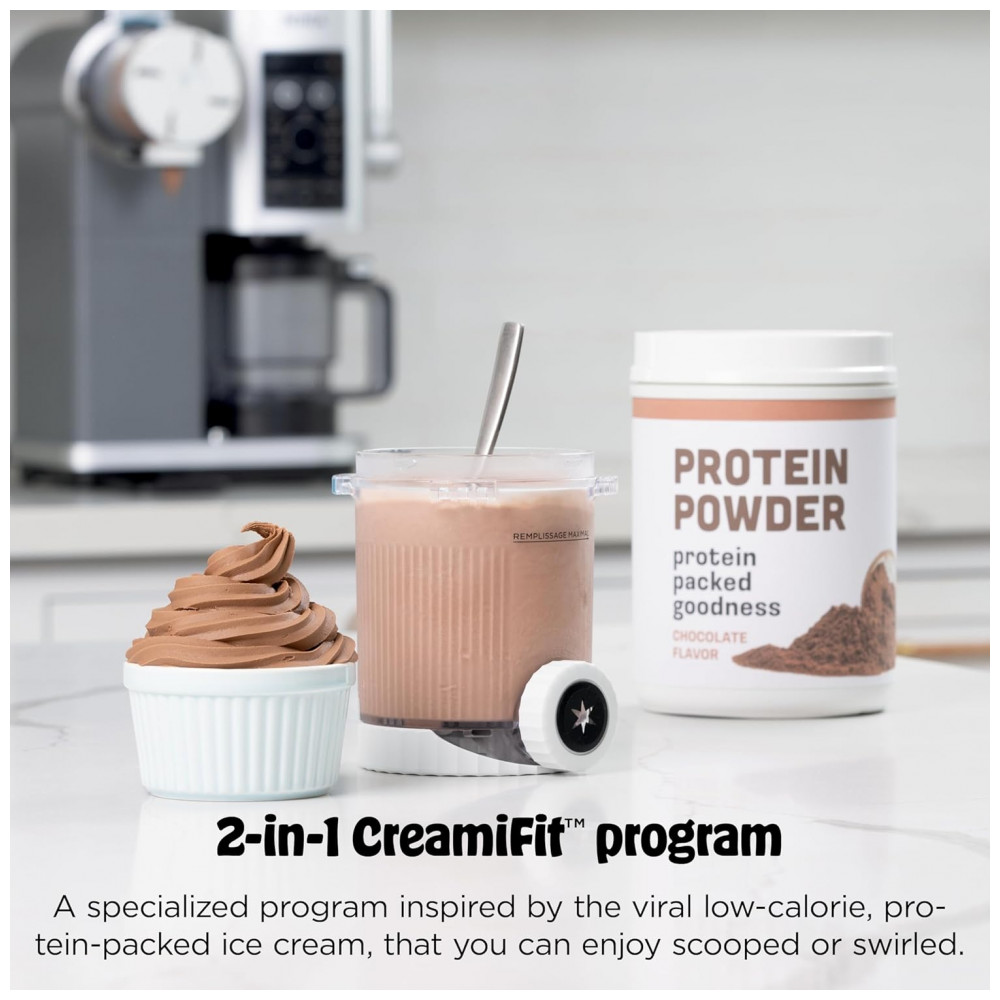 O equipamento traz 13 programas de um toque, incluindo funções específicas de soft serve, sorvete clássico, sorbet, iogurte congelado, sobremesas com menor teor calórico e modo CreamiFit focado em receitas com maior teor de proteína. Cada ciclo é otimizado para velocidade e tempo, ajustando o processamento conforme o tipo de sobremesa desejada.