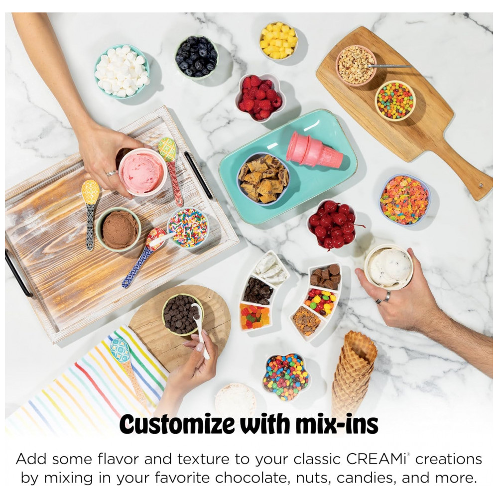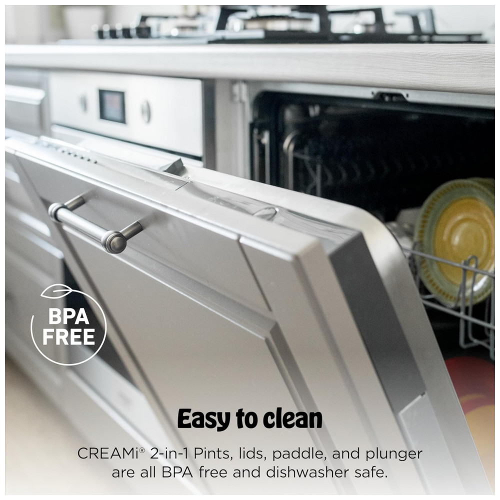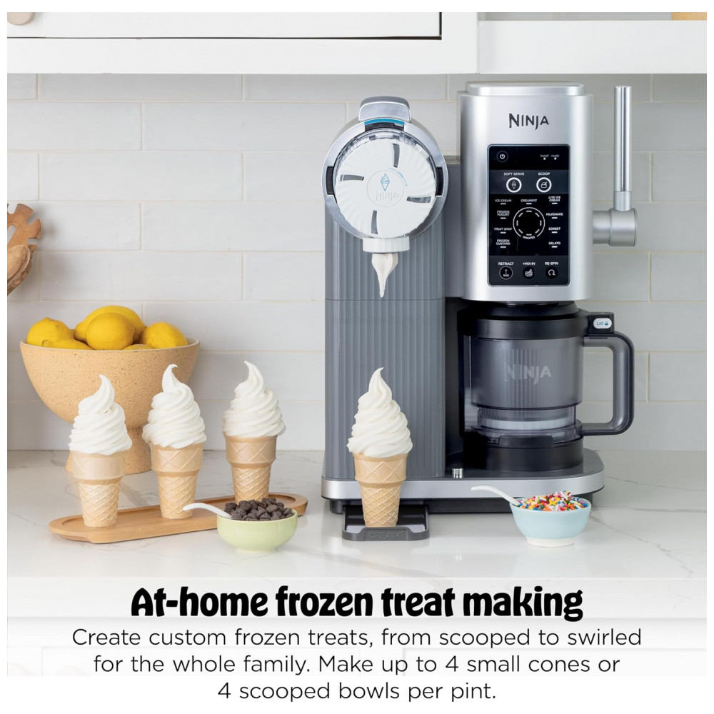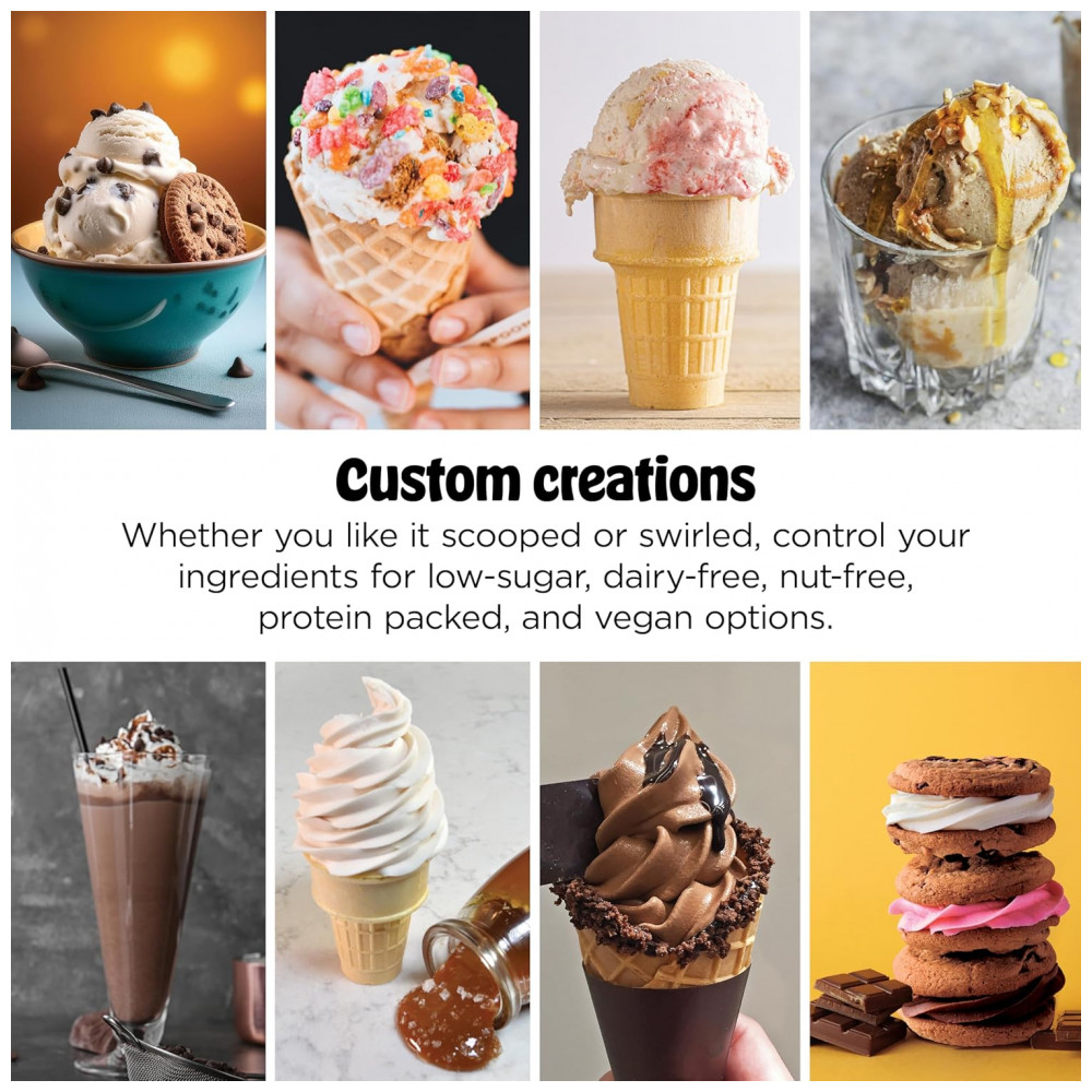 O equipamento traz 13 programas de um toque, incluindo funções específicas de soft serve, sorvete clássico, sorbet, iogurte congelado, sobremesas com menor teor calórico e modo CreamiFit focado em receitas com maior teor de proteína. Cada ciclo é otimizado para velocidade e tempo, ajustando o processamento conforme o tipo de sobremesa desejada.