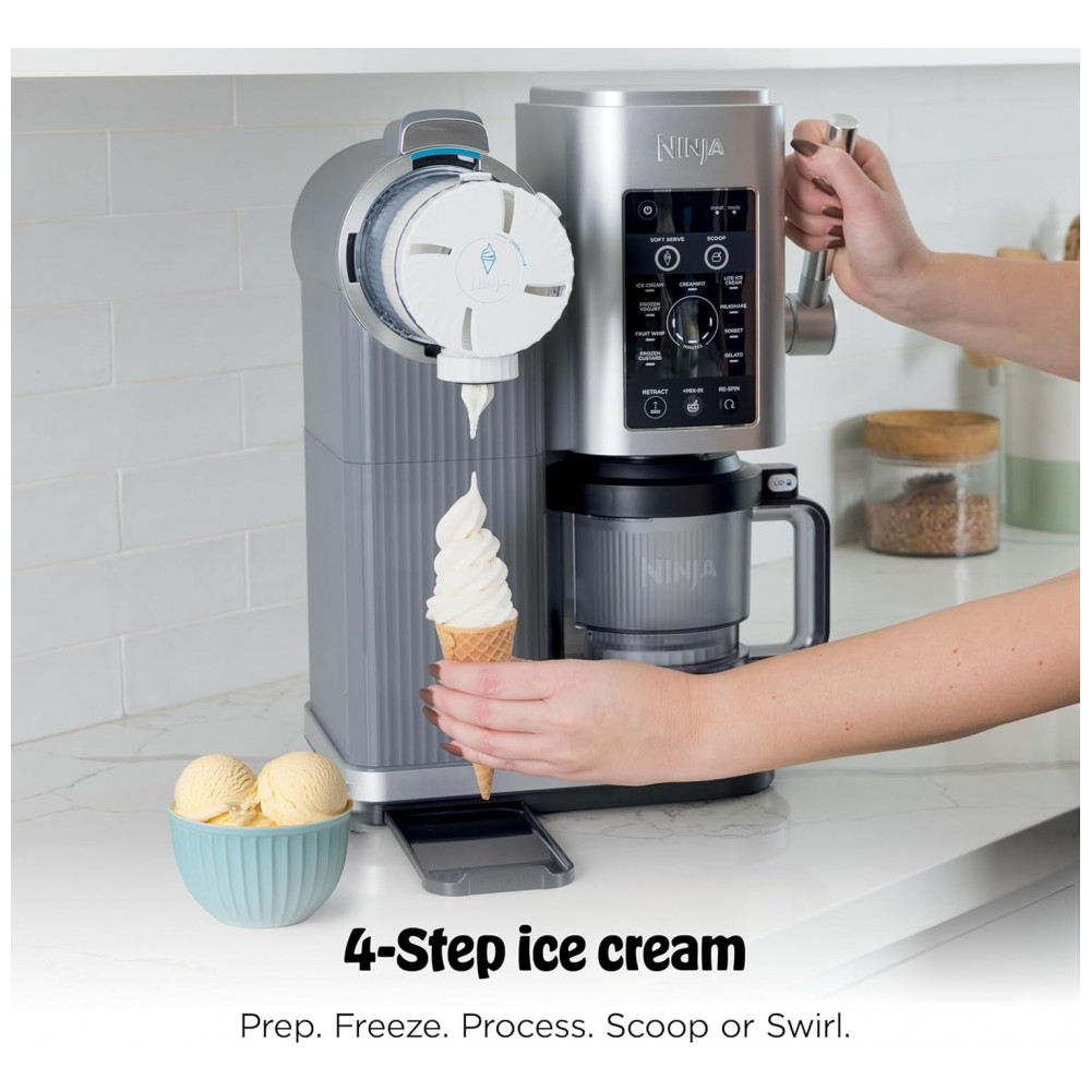 A máquina de sorvete Ninja CREAMi Scoop & Swirl NC701 foi desenvolvida para preparar sorvetes, soft serve, sorbets, milk-shakes, iogurte congelado e outras sobremesas geladas a partir de bases congeladas em recipientes dedicados. Ela utiliza motor de 800 W para acionar o conjunto de lâmina Creamerizer, que processa o bloco congelado até atingir textura cremosa, em ciclos automáticos pré-programados.