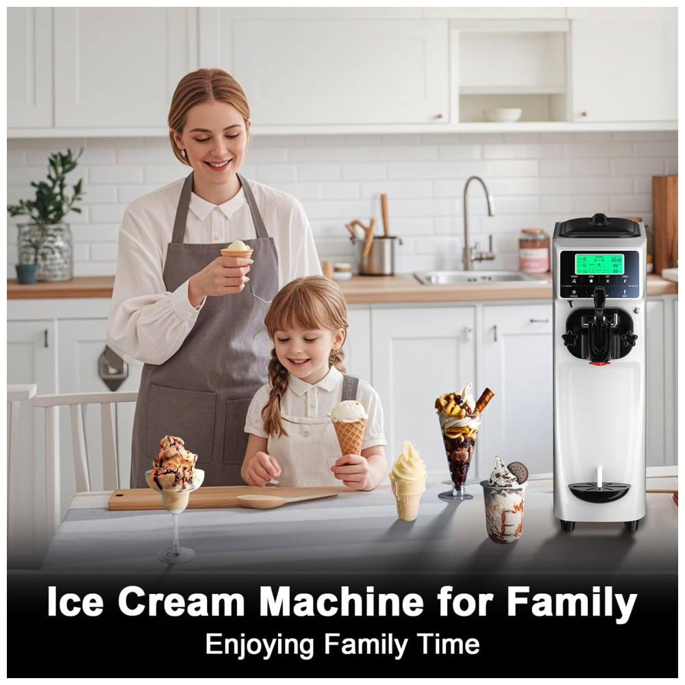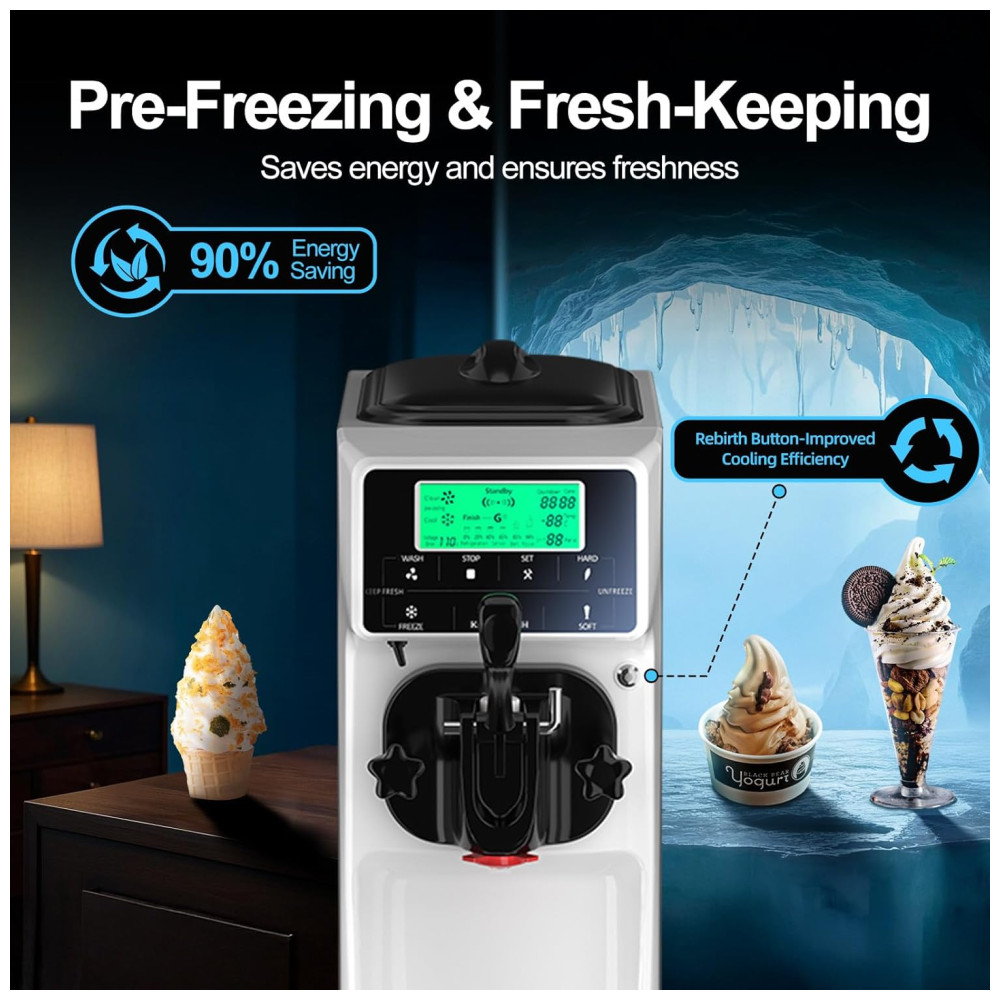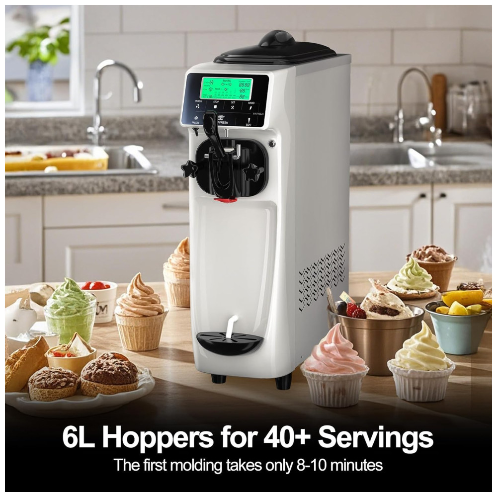 Pré resfriamento Esta máquina de fazer sorvete é equipada com um funil de capacidade de 6L para necessidades domésticas e comerciais, que também é equipada com um agitador para que a pasta de sorvete possa ser misturada mais completamente. também é equipado com função de pré resfriamento e manutenção de frescor tanque do freezer para manter o resfriamento do funil para fazer a pasta de sorvete fresca e não se deteriorar, coloque as matérias primas no funil durante a noite, garantindo a segurança alimentar.