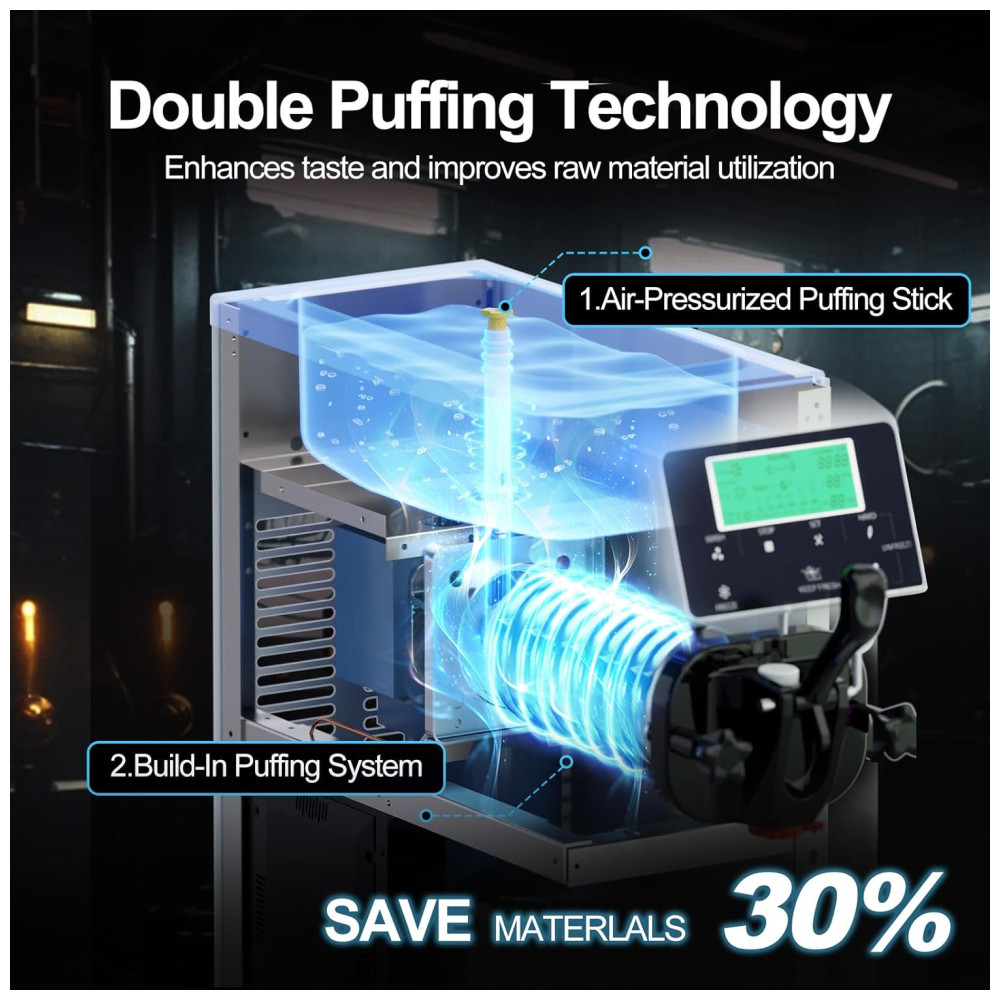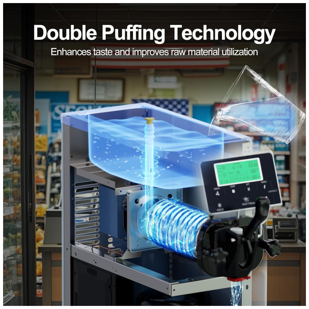 Conversão silenciosa e de frequência Adotando compressores de marca de renome mundial e redutores de engrenagem helicoidal, equipados com refrigerante sem flúor R290, resfriando mais rápido e economizando energia. O redutor de engrenagem helicoidal faz com que a máquina de sorvete funcione mais silenciosamente, até 68 decibéis. A avançada tecnologia de conversão de frequência protege o motor e controla a velocidade do batedor, reduz a conta de eletricidade em 2, 3 em comparação com a máquina de sorvete comum, não precisa se preocupar com a alta conta de eletricidade.