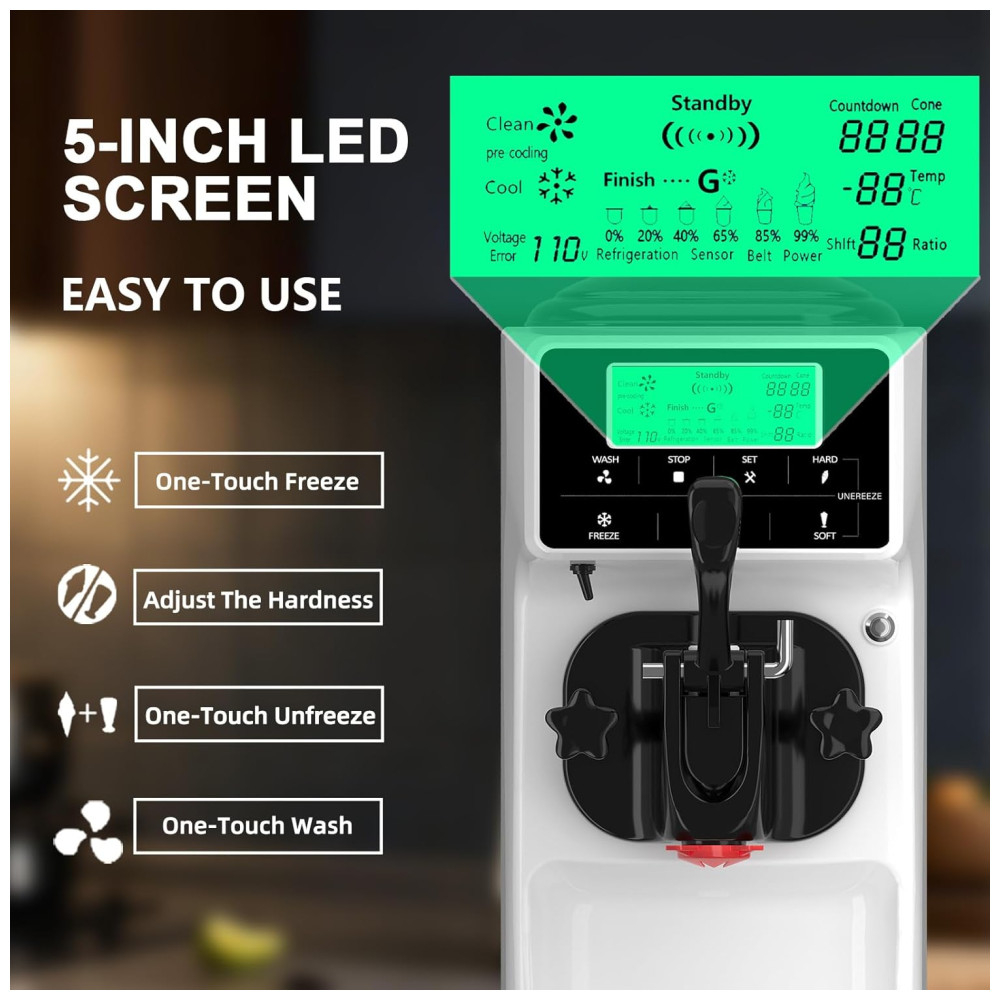 Tela sensível ao toque Esta máquina de sorvete soft serve uma tela LCD sensível ao toque de e o painel da tela é inclinado para cima em 42. Você pode observar e controlar diretamente a quantidade, dureza e temperatura do sorvete sem se curvar. Você ficará surpreso ao ver que o corpo é tão largo quanto uma folha de papel A4 e a sorveteira é compacta e flexível. O corpo é projetado com tamanho de painel côncavo, permitindo que você tenha mais espaço e faça facilmente uma xícara grande de sundae para crianças.