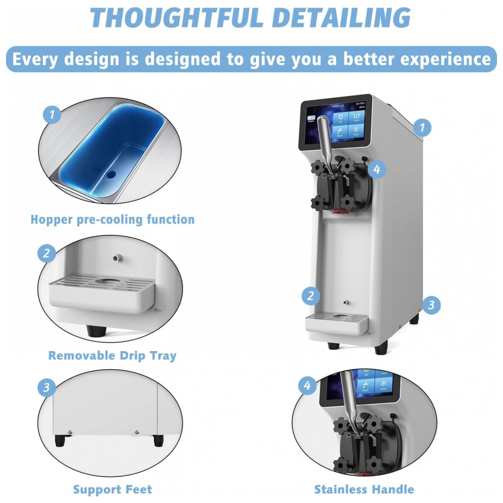 A máquina de sorvete soft comercial AnyDoor dispõe de compressor de 1000W, proporcionando refrigeração rápida e eficiente em diferentes climas, com operação em temperatura ambiente de 5°C a 33°C. Equipado com recipiente de 4,5 litros e cilindro congelador de 1,6 litro fabricados em aço inoxidável grau alimentício 304, atende a demandas de até 20 litros por hora, ideal para restaurantes, bares e cafés.
