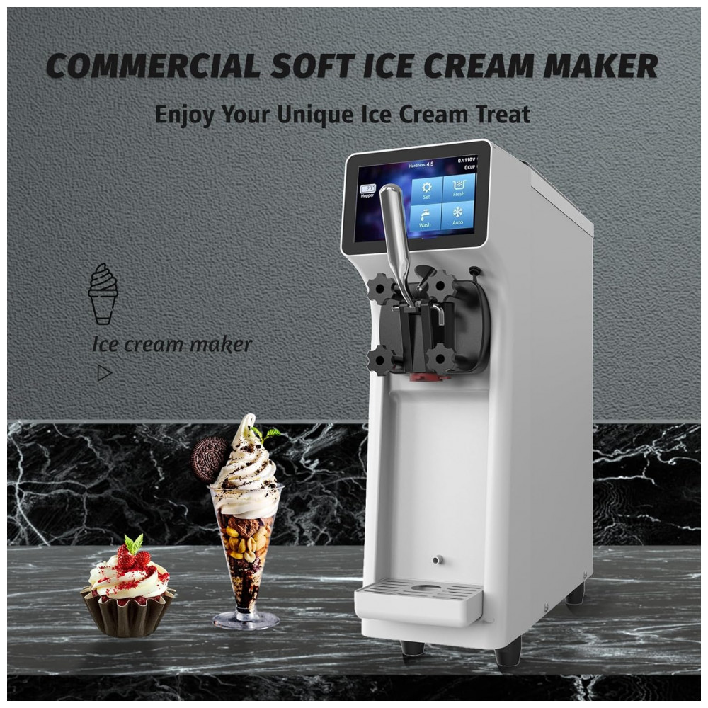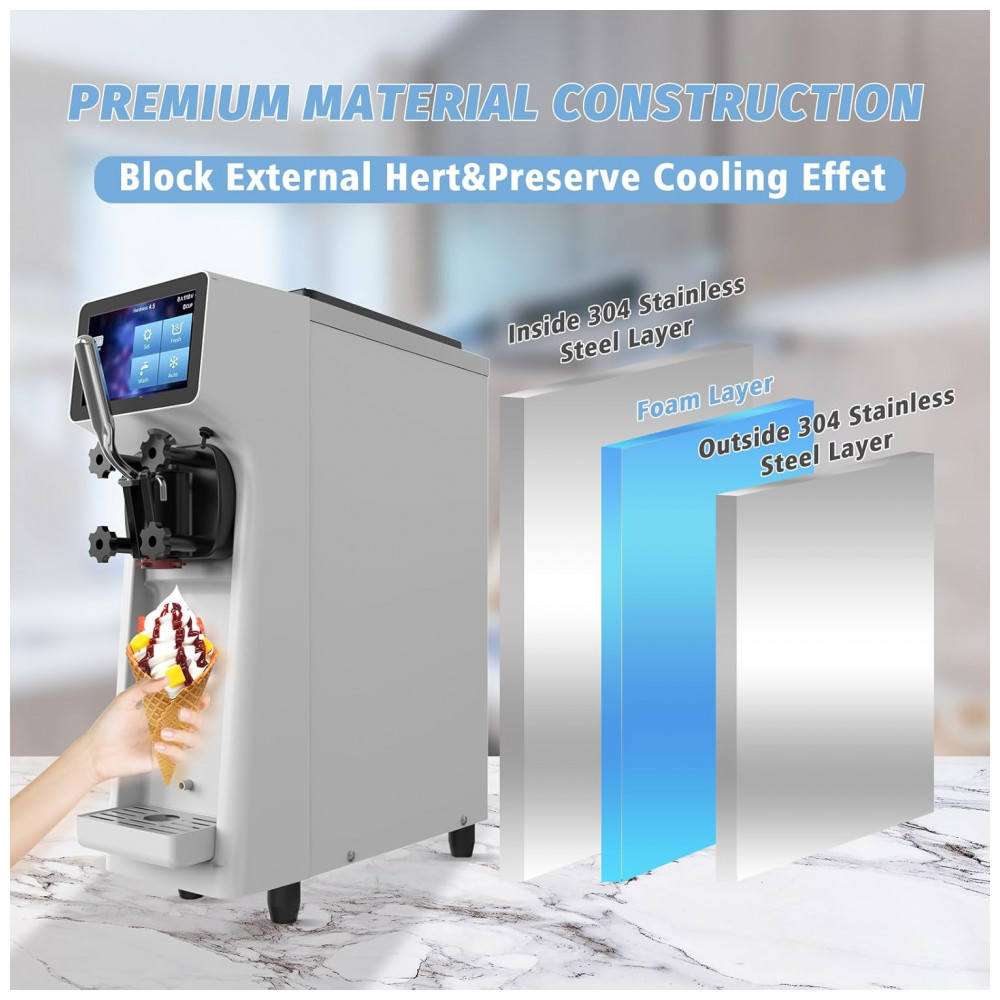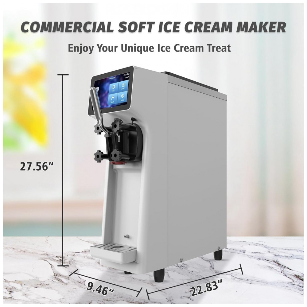 A máquina de sorvete soft comercial AnyDoor dispõe de compressor de 1000W, proporcionando refrigeração rápida e eficiente em diferentes climas, com operação em temperatura ambiente de 5°C a 33°C. Equipado com recipiente de 4,5 litros e cilindro congelador de 1,6 litro fabricados em aço inoxidável grau alimentício 304, atende a demandas de até 20 litros por hora, ideal para restaurantes, bares e cafés.