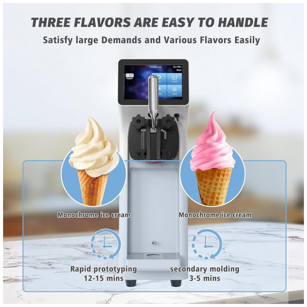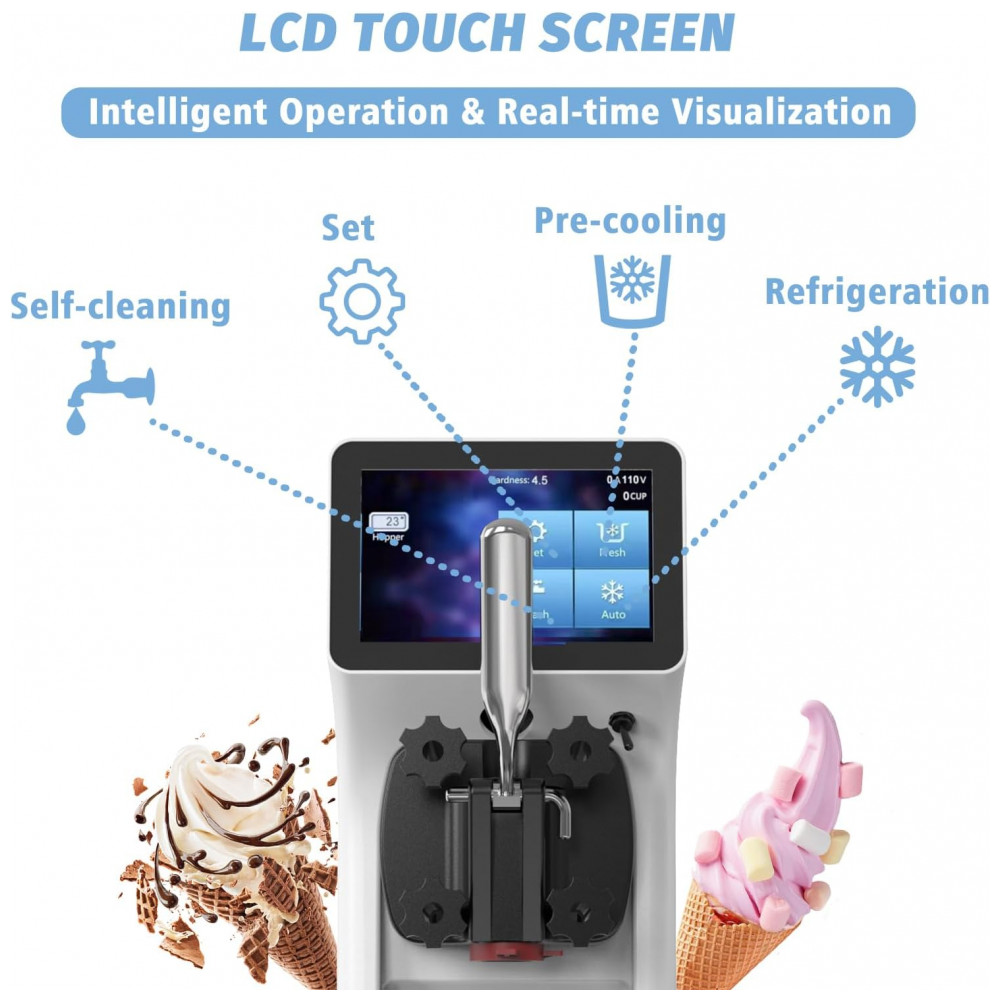 Apresenta painel touch LCD de 7 polegadas para fácil monitoramento e controle de temperatura, dureza e quantidade do sorvete, com alertas automáticos para baixo estoque de ingredientes. A função de pré-resfriamento acelera a moldagem do sorvete durante o funcionamento, enquanto o modo frescor permite manter ingredientes prontos para uso no dia seguinte. Conta também com sistema de limpeza automática por toque único e dreno para condensados, prevenindo danos internos.