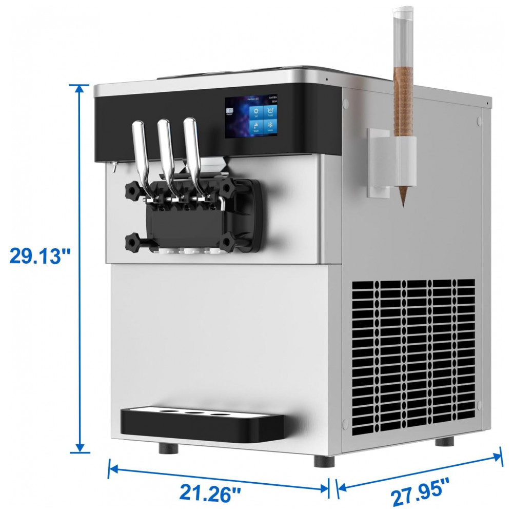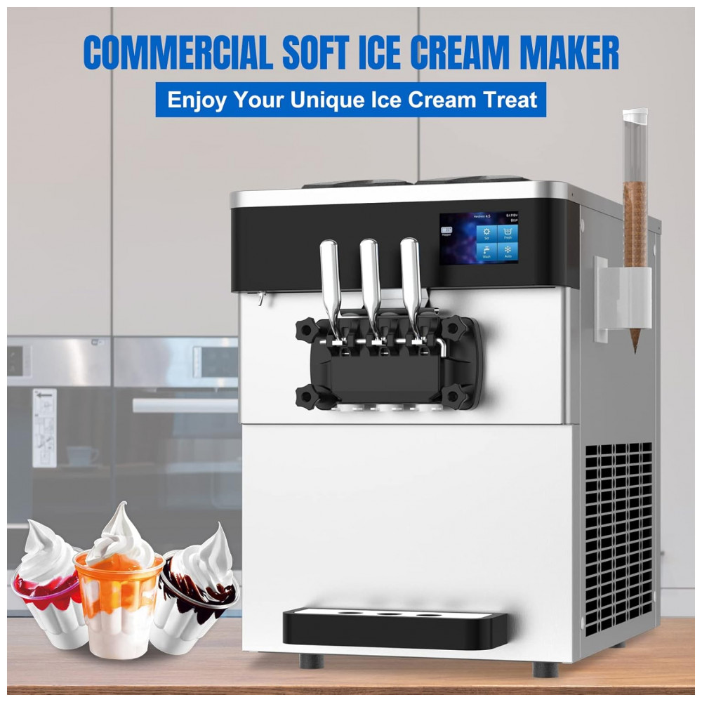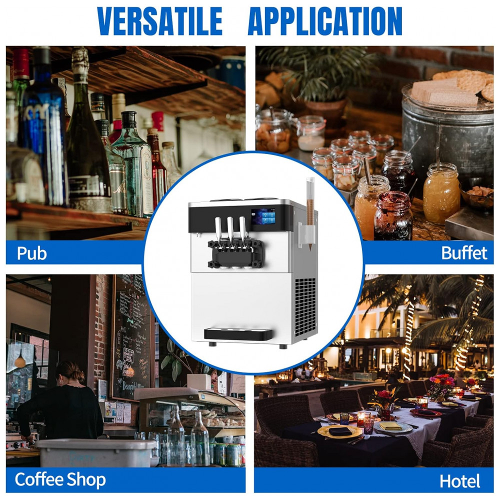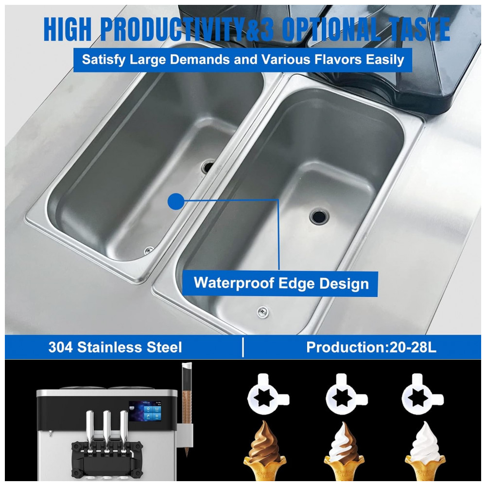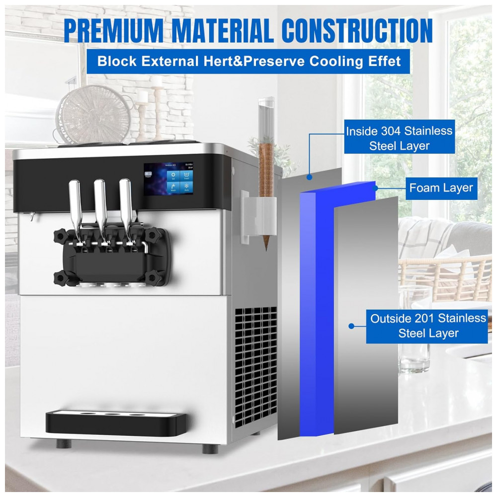 A máquina de sorvete soft comercial XPW oferece potência total de 2450W, sendo equipada com compressor de 1200W que garante resfriamento rápido e operação silenciosa, com nível de ruído em torno de 68 dB. Conta com dois recipientes em aço inox 304, cada um com capacidade de 6 litros, suportando produção de dois sabores individuais e um sabor mixado simultaneamente. O sistema de pré-resfriamento com compressor dedicado de 170W e camada de espuma integrada mantém os ingredientes frescos e evita a perda de qualidade durante períodos de espera.
