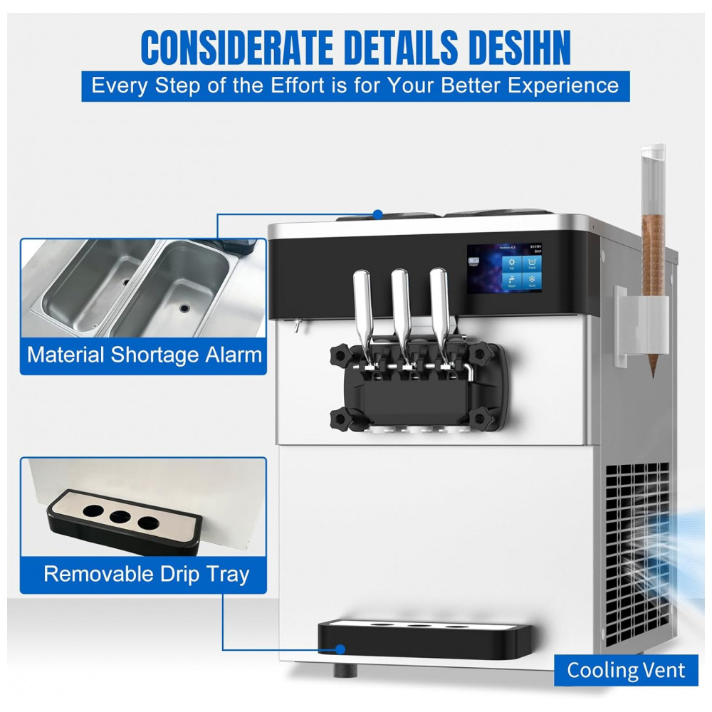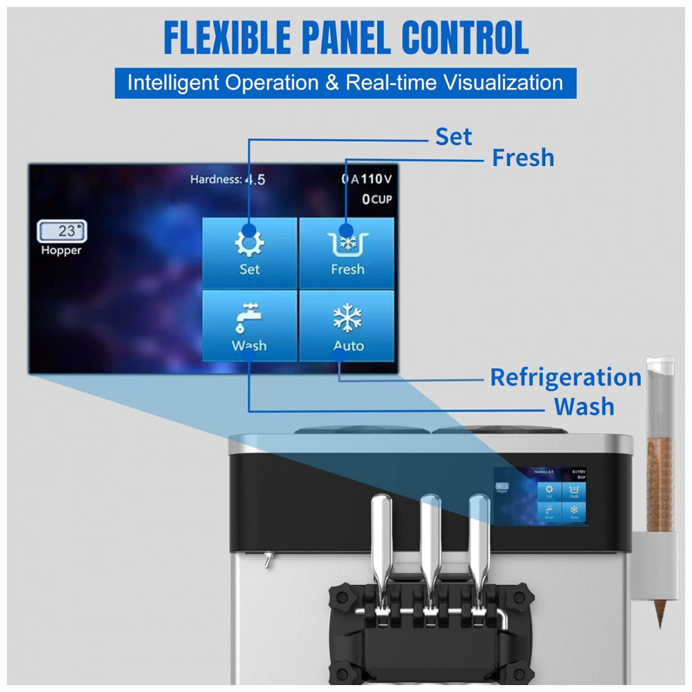 O painel touch digital LCD permite o ajuste personalizado da dureza do sorvete, visualização da quantidade produzida e ativação da função “puffing”, que oferece textura mais cremosa e visual atrativo. O modo de frescor preserva os ingredientes no recipiente durante a noite, facilitando a retomada da produção no dia seguinte. O alarme de baixo volume alerta para reabastecimento do mix. A limpeza automática por toque simplifica a manutenção, enquanto o dreno para condensados previne danos internos.