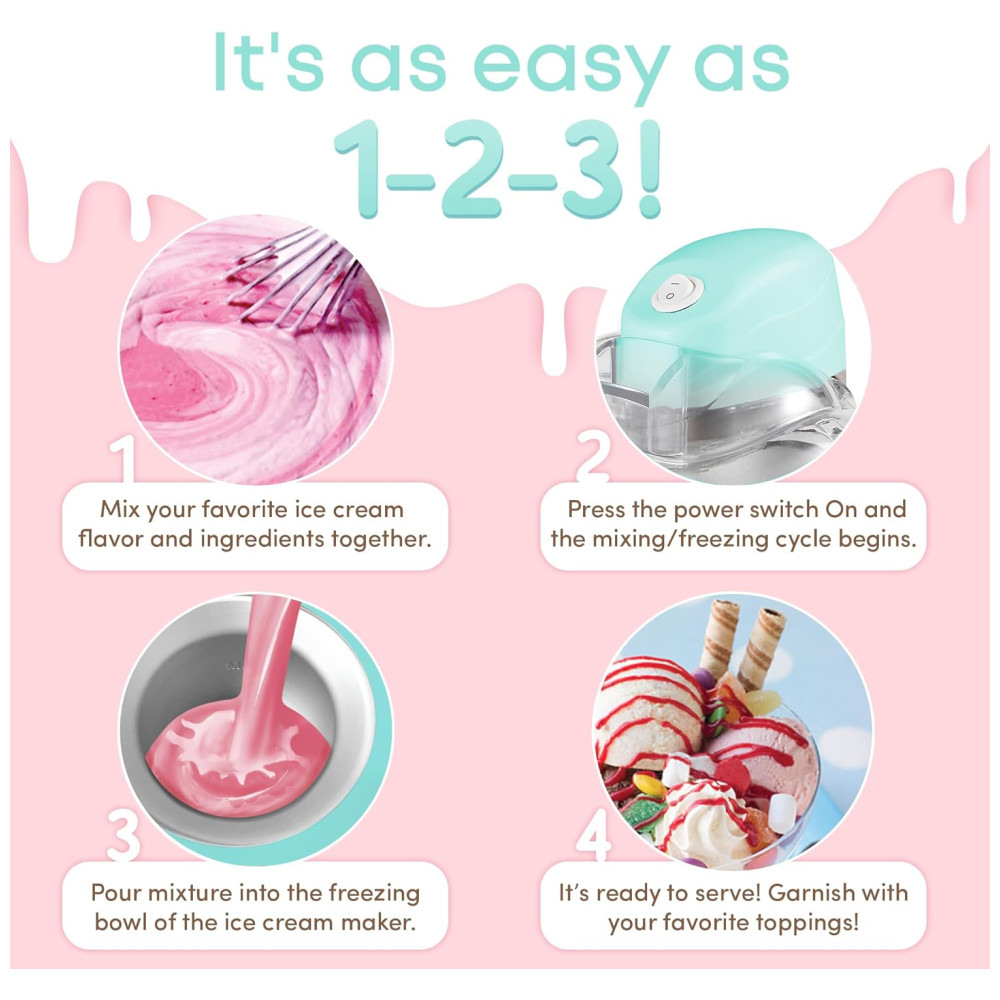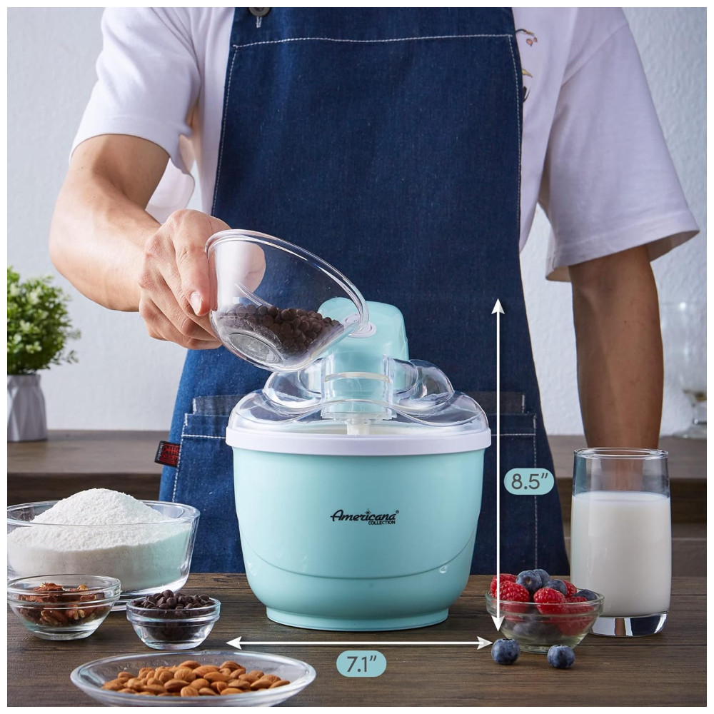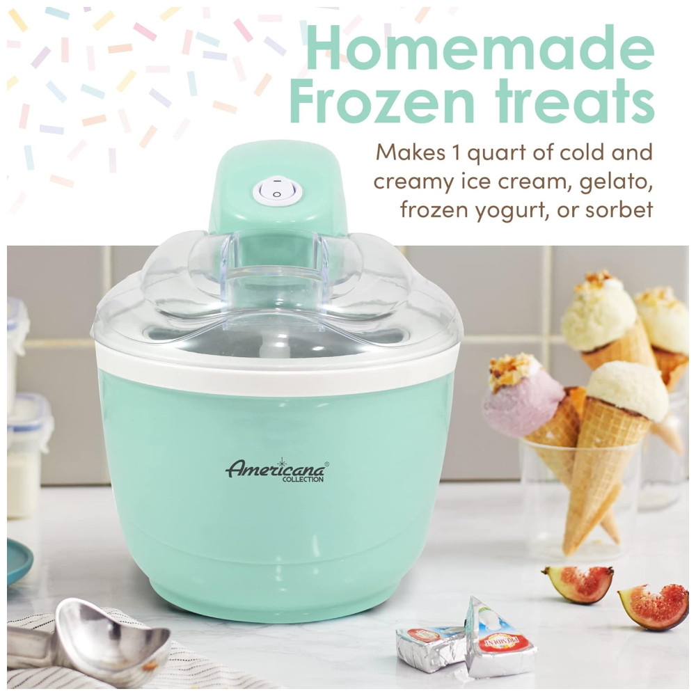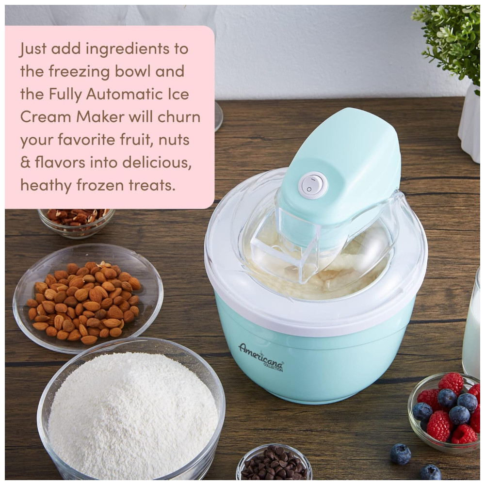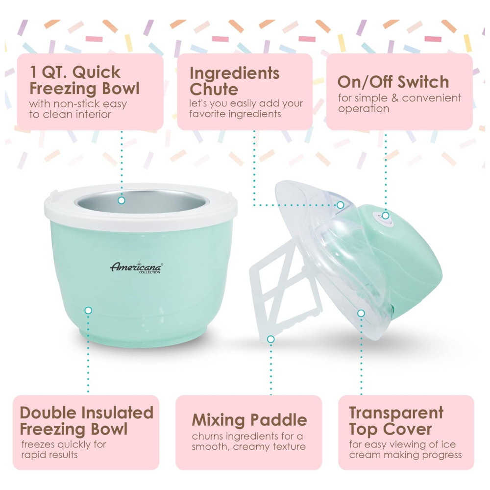 SUPER DIVERTIDO E FÁCIL para toda a família curtir as delícias do verão com sorvete caseiro, iogurte gelado, sorvete ou gelato. TACA DE CONGELAÇÃO SIMPLES A sorveteira automática Americana vem com uma cômoda tigela de congelamento que permite fazer sorvete rapidamente diretamente na unidade. TAMANHO DE PORÇÃO PERFEITO A capacidade de 1 quarto fornece a quantidade perfeita de porções para a família e amigos. RÁPIDO E FÁCIL DE USAR O fabricante de sorvetes e sobremesas é simples de usar. Basta congelar a tigela durante a noite, adicionar a mistura de ingredientes na máquina, apertar um botão e você terá uma sobremesa saborosa em pouco tempo. Sem produtos químicos, álcool ou sal necessários. CALDA DE INGREDIENTES CONVENIENTE Adicione e misture ingredientes adicionais durante o processo de batedura, como nozes, frutas vermelhas ou sabores extras. INCLUI RECEITAS Prepare iogurte congelado caseiro, gelato, sorvete ou sorvete de uma variedade de receitas incluídas em sua compra.