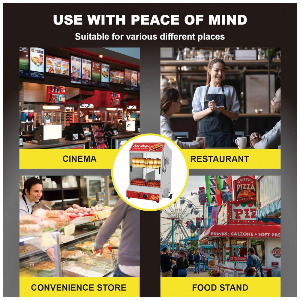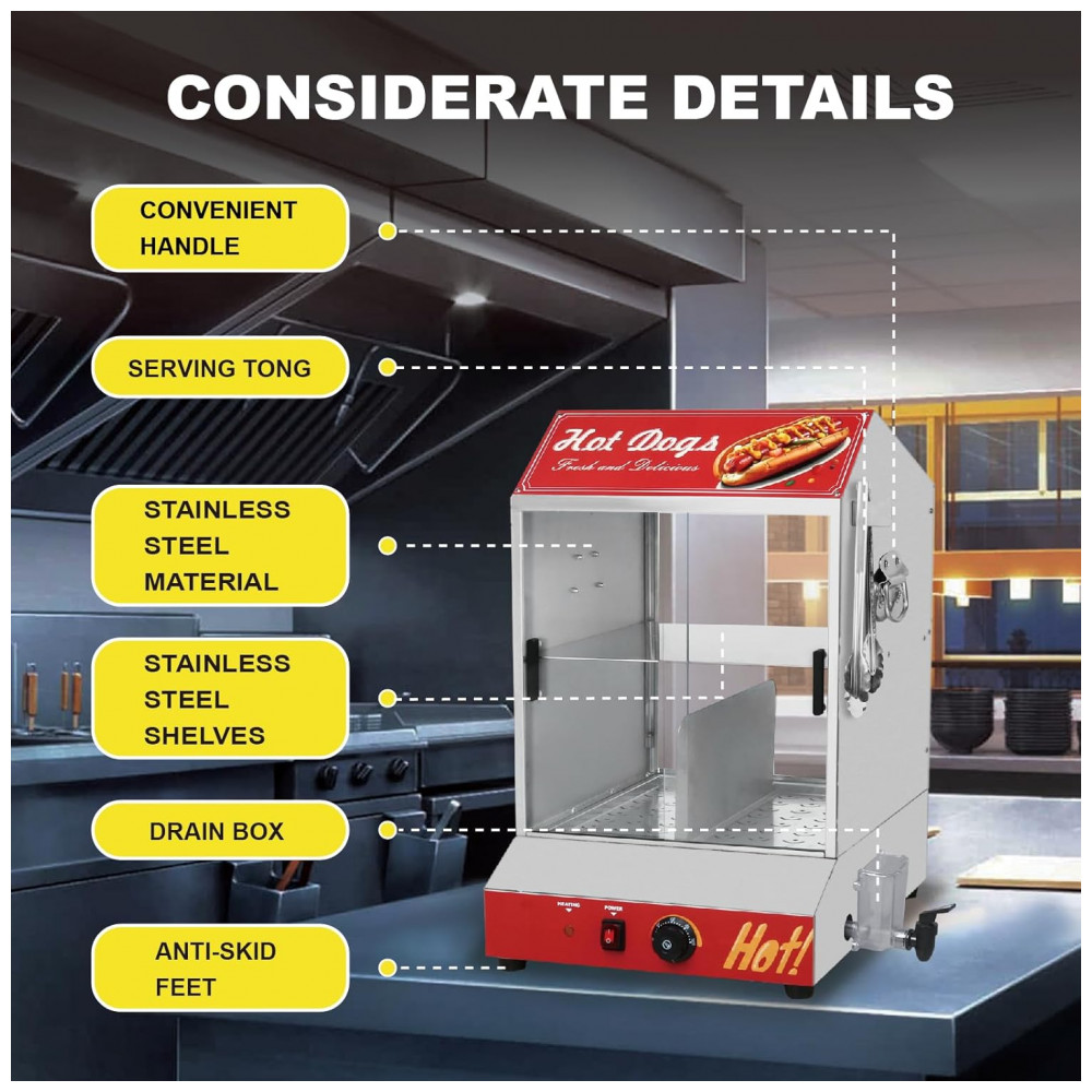 A Máquina de Vapor para Cachorro-Quente Nessxa de 40 litros possui uma grande capacidade que permite controlar facilmente festas ou clientes na loja. Perfeita para uso diário e comercial, é feita de aço inoxidável para garantir a segurança alimentar. Seu design com bandeja removível facilita a organização e limpeza. A temperatura pode ser ajustada entre 30°C a 85°C para manter os cachorros-quentes quentes e suculentos conforme necessário. Ajuste de temperatura rápido e aquecimento eficiente. Feita de aço inoxidável de alta qualidade, suporta grandes quantidades de comida sem deformar. Capacidade para 235 cachorros-quentes e 50 pães simultaneamente. Ideal para cafeterias, padarias, restaurantes, e lojas de conveniência. Display de alimentos com vidro temperado espesso, isolante e transparente. A porta deslizante facilita a visualização e manuseio dos alimentos. Uma adição necessária para qualquer estabelecimento de alimentos.