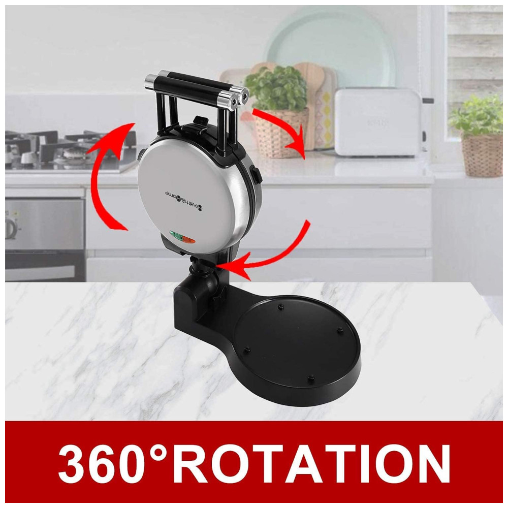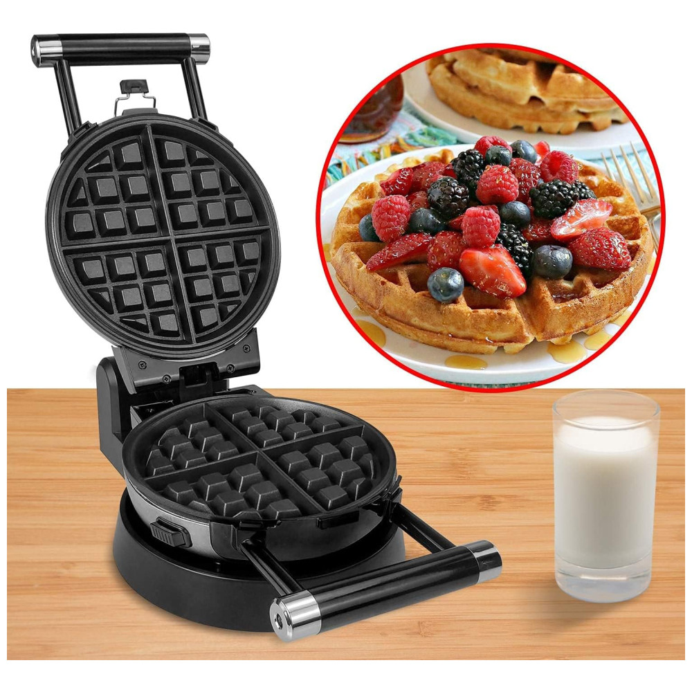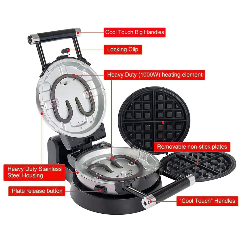 A base de função garante uma rotação conveniente para assar. Alças Cool Touch para torneamento fácil e e um design exclusivo de Cliping Clip garante distribuição uniforme da massa e menos vazamento Placa de cozimento removível 3 placas de cozimento podem ser facilmente desmontadas, fáceis de usar e limpar. Cada placa tem um revestimento antiaderente e pode ser lavada com água. Fazer comida é mais e conveniente. Indicador luminoso de ligar e pronto, instruções incluídas. Uma luz indicadora dirá quando sua grelha está energizada e a outra mostrará quando a grelha estiver pré aquecida e pronta para cozinhar um saboroso waffle. É mais e fácil de usar. 120 V, 1000 Watts A assadeira antiaderente antiaderente multifuncional rotativa de 360 graus é muito adequada para fazer waffles, donuts, omeletes belgas e os waffles consistem em quatro partes fáceis de cortar. Exterior de aço inoxidável escovado. Pés antiderrapantes. Design rotativo de estilo profissional.