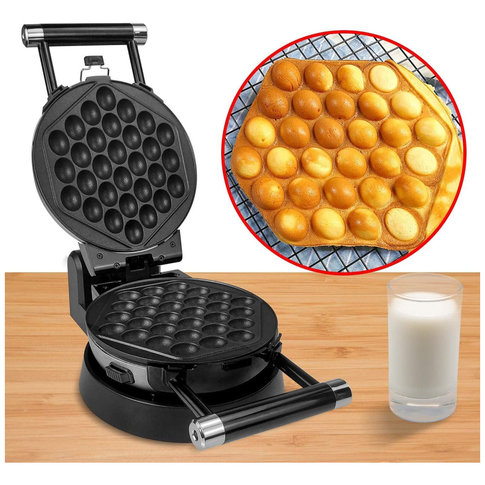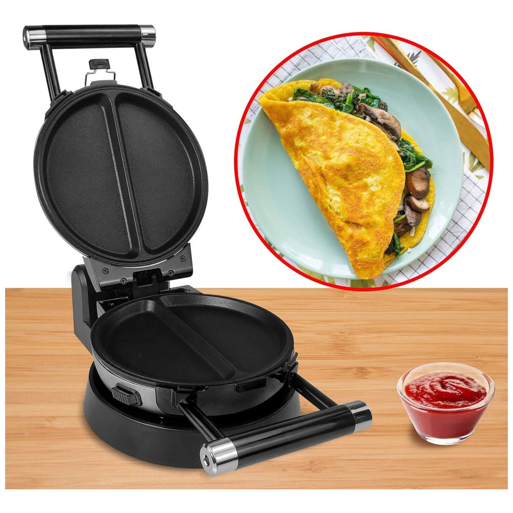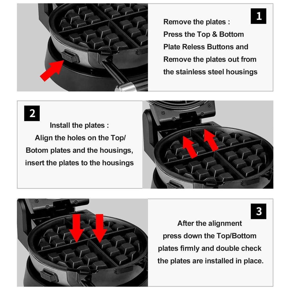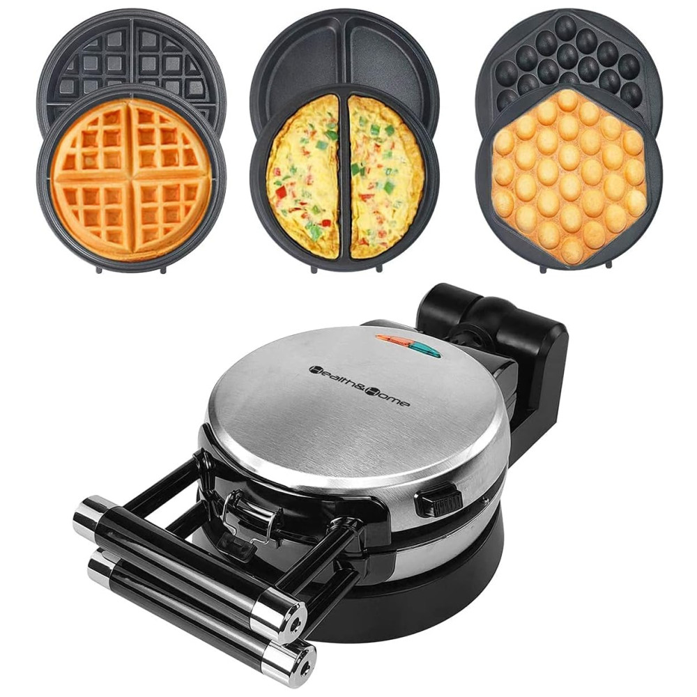 A base de função garante uma rotação conveniente para assar. Alças Cool Touch para torneamento fácil e e um design exclusivo de Cliping Clip garante distribuição uniforme da massa e menos vazamento Placa de cozimento removível 3 placas de cozimento podem ser facilmente desmontadas, fáceis de usar e limpar. Cada placa tem um revestimento antiaderente e pode ser lavada com água. Fazer comida é mais e conveniente. Indicador luminoso de ligar e pronto, instruções incluídas. Uma luz indicadora dirá quando sua grelha está energizada e a outra mostrará quando a grelha estiver pré aquecida e pronta para cozinhar um saboroso waffle. É mais e fácil de usar. 120 V, 1000 Watts A assadeira antiaderente antiaderente multifuncional rotativa de 360 graus é muito adequada para fazer waffles, donuts, omeletes belgas e os waffles consistem em quatro partes fáceis de cortar. Exterior de aço inoxidável escovado. Pés antiderrapantes. Design rotativo de estilo profissional.