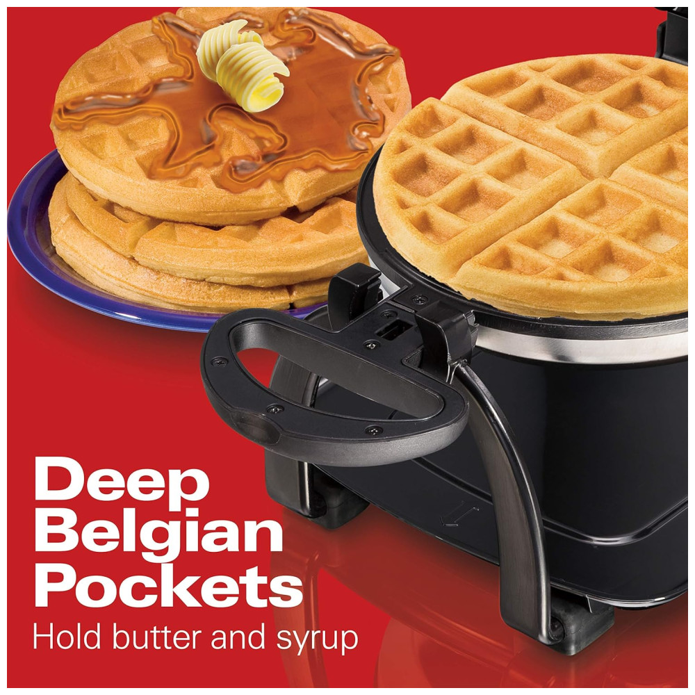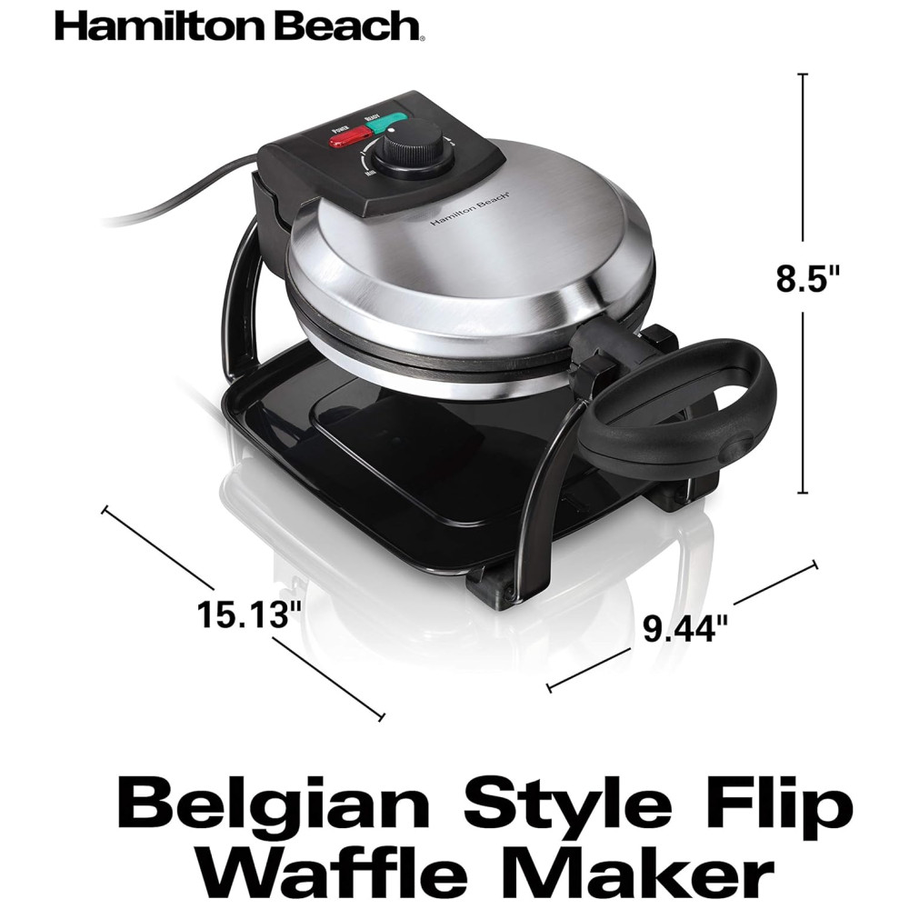 Estilo Flip Desfrute de deliciosos waffles belgas com o Criador de waffles estilo Hamilton Beach estilo belga. Feito com grades antiaderentes fáceis de limpar para assar o waffle perfeito com bolsos profundos para segurar manteiga e calda. As luzes indicadoras informam quando colocar a massa e a bandeja e as grades removíveis facilitam a limpeza. Bandeja removível para limpeza fácil. A bandeja removível refere se à peça prateada inferior, não às grades
