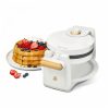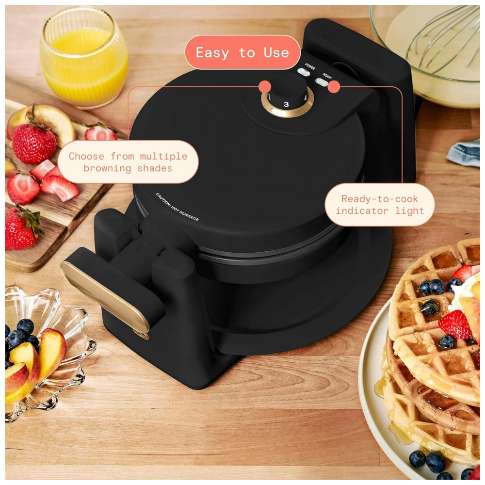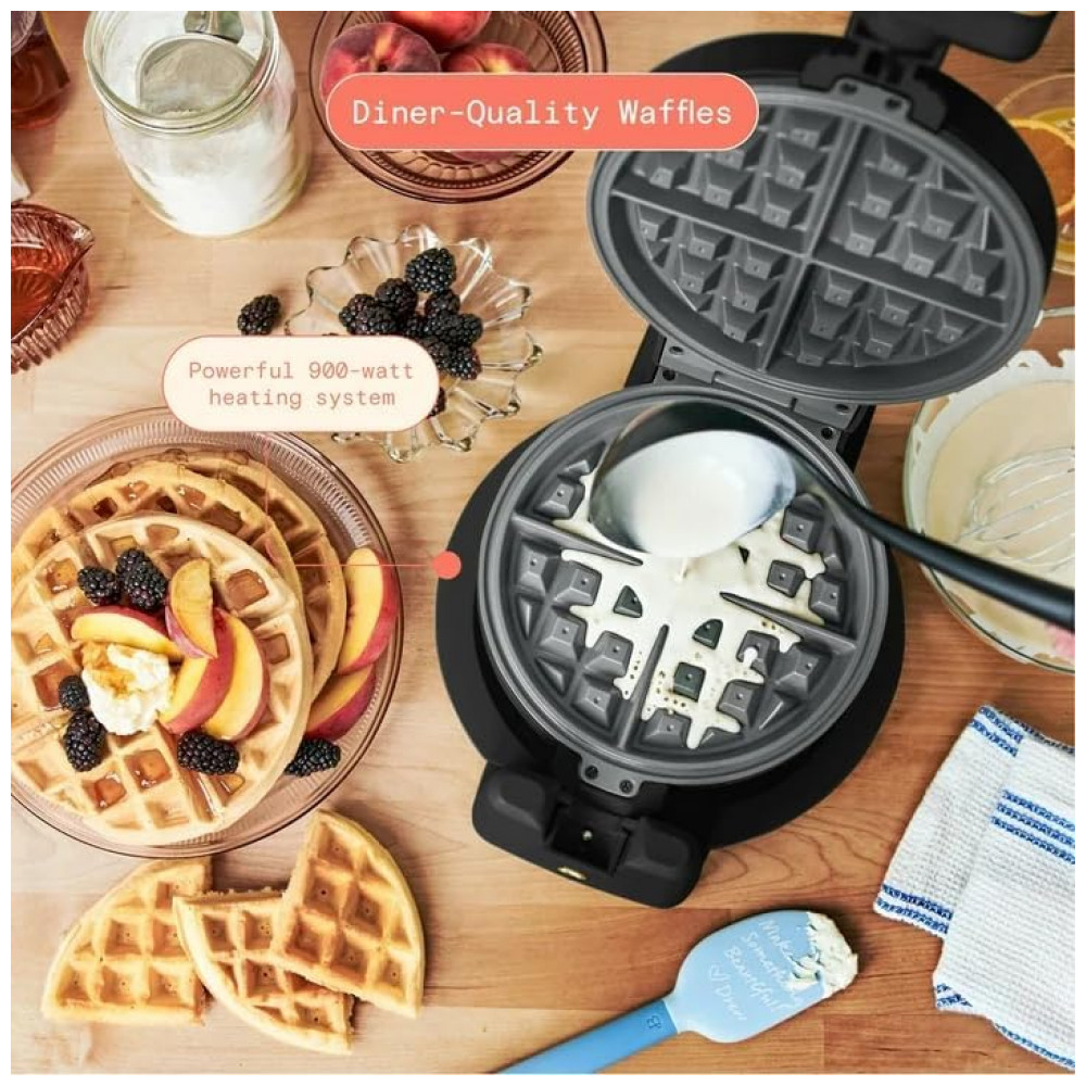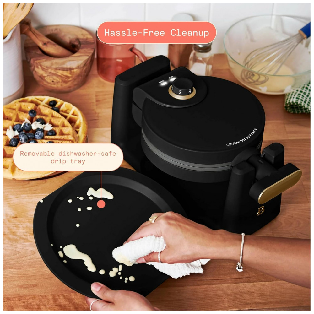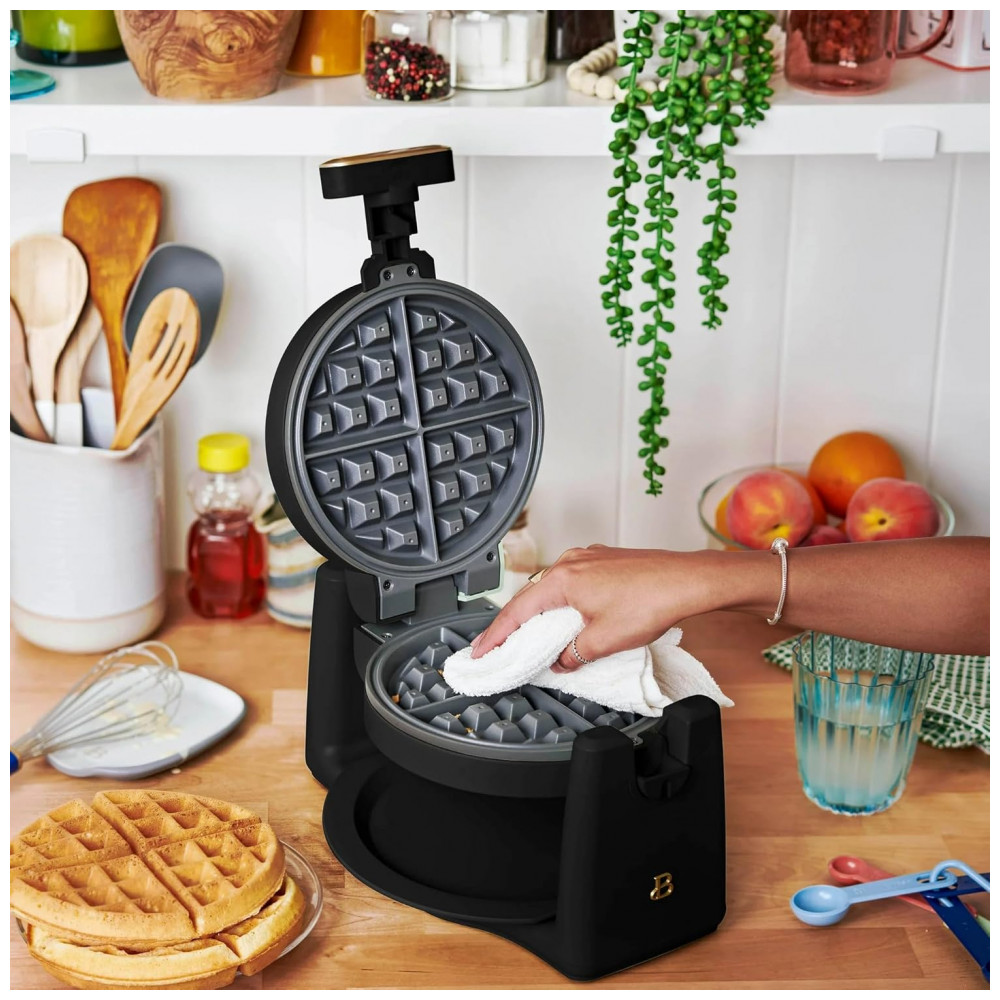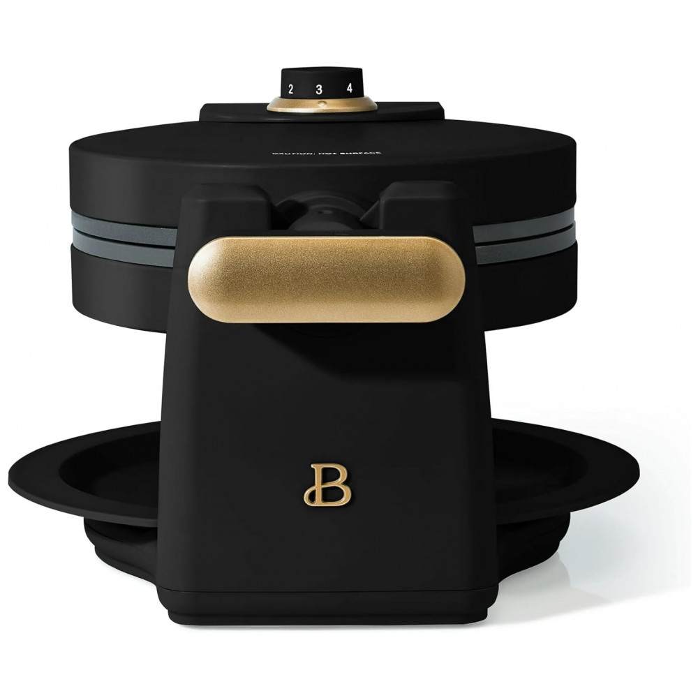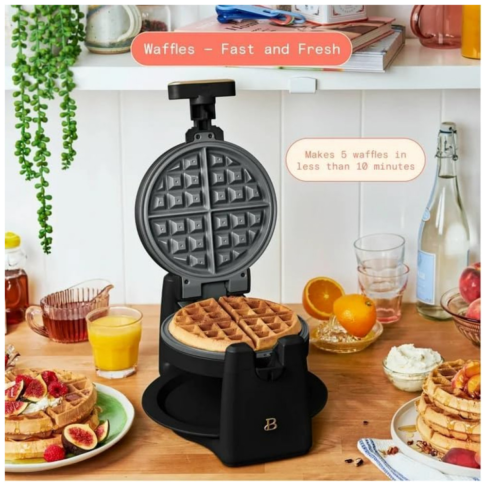 A máquina de waffle belga giratória Beautiful Rotating Belgian Waffle Maker 19451 foi projetada para preparar waffles redondos com cerca de 2,5 cm de espessura, utilizando um sistema de rotação que distribui a massa de forma uniforme sobre as chapas. O conjunto trabalha com potência de 1000W, possui carcaça metálica com acabamento fosco na cor white icing e chapas internas com revestimento antiaderente sem PFOA e PFOS, além de bandeja coletora removível que auxilia na retenção de excesso de massa.