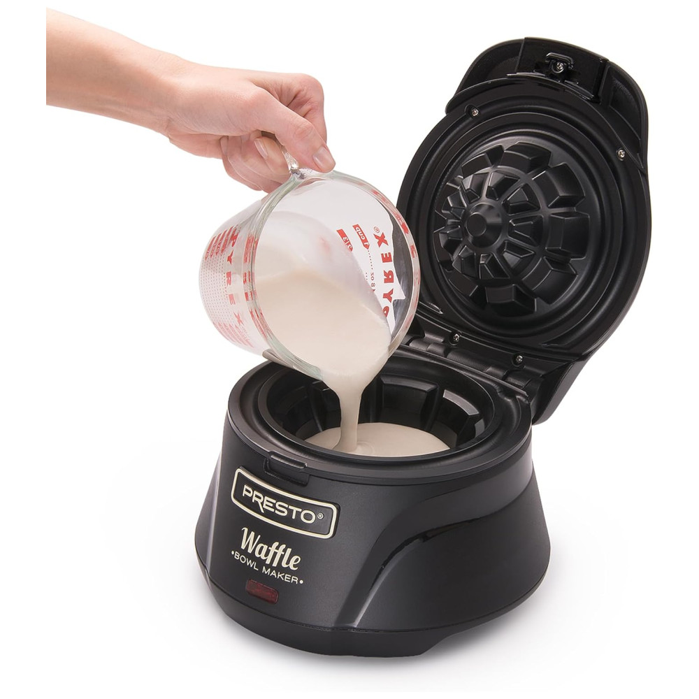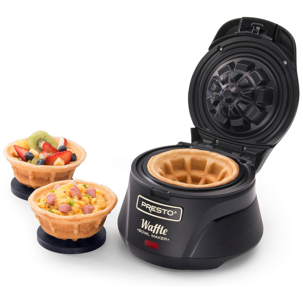 O Presto Belgian Waffle Bowl Maker é um tipo deliciosamente diferente de tigela de waffle. Faz um waffle de que é espesso, fofo e macio porque é um waffle de verdade Encha o com os seus chapéus de coco favoritos manteiga e xarope ou fruta fresca e iogurte. Faça um café da manhã farto recheando o com ovos mexidos, presunto, salsicha, batatas fritas e muito mais. Nenhuma massa especial é necessária. Use misturas de waffles compradas em lojas ou caseiras. Receitas de waffles tradicionais e muito mais estão incluídas. Torne o café da manhã emocionante, a sobremesa extraordinária e leve, o almoço a um nível com tacos de waffle de frango. As possibilidades de enchimento são infinitas