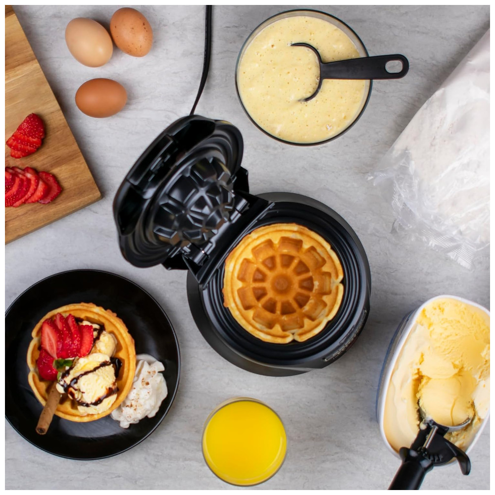 Faz um waffle de que é espesso, fofo e macio porque é um waffle de verdade Encha com seus toppers favoritos manteiga e xarope, frutas frescas, ovos mexidos, presunto, salsicha, batatas fritas e muito mais Não é necessária uma massa especial Use misturas de waffles compradas em lojas ou caseiras Receitas de waffles tradicionais e muito mais incluídas Torne o café da manhã emocionante, a sobremesa extraordinária e leve o almoço a um nível com tacos de waffle de frango Existem infinitas possibilidades de enchimento Fácil de usar Basta colocar a massa do waffle, fechar a tampa e levar ao forno Grades antiaderentes para fácil remoção da tigela de waffle e limpeza rápida.