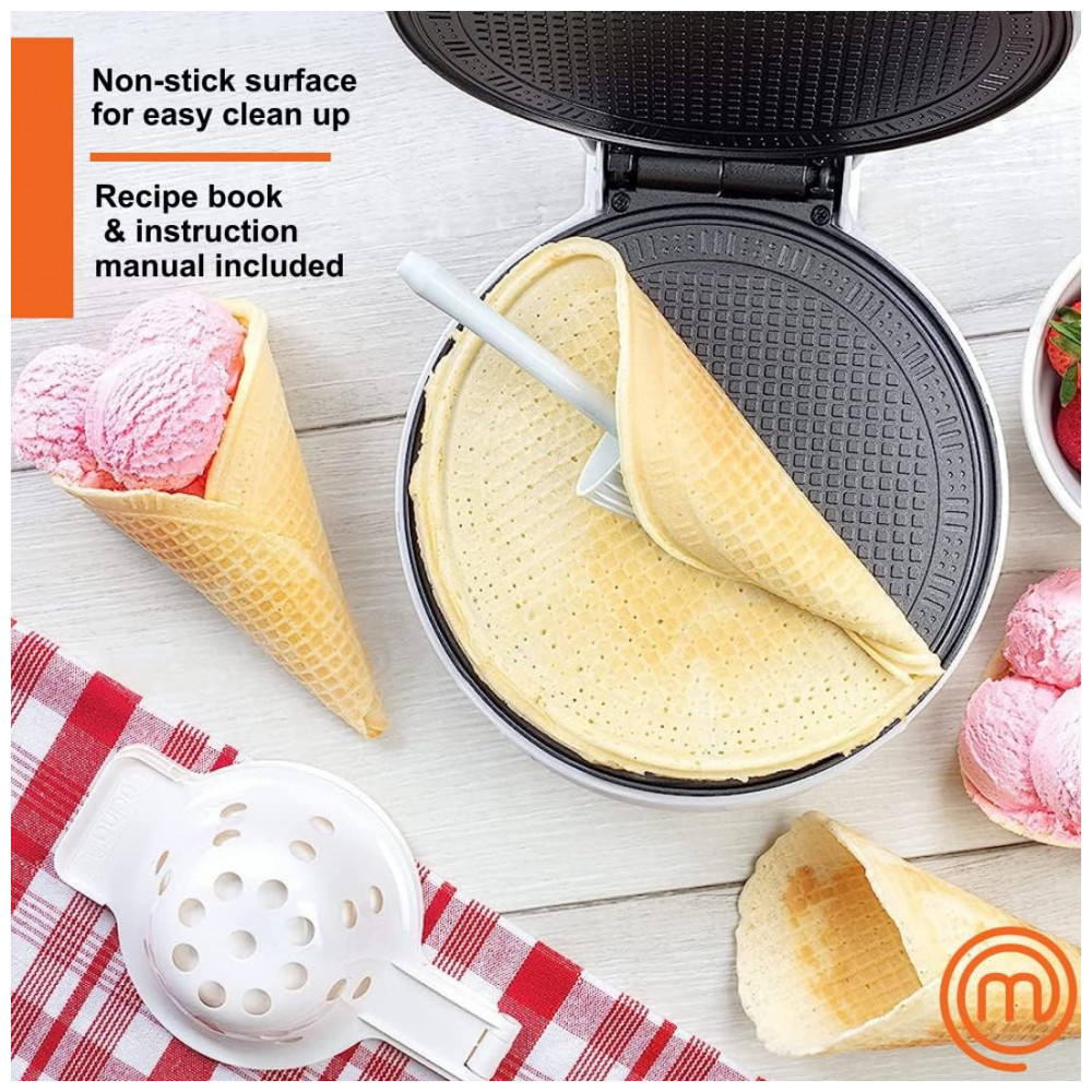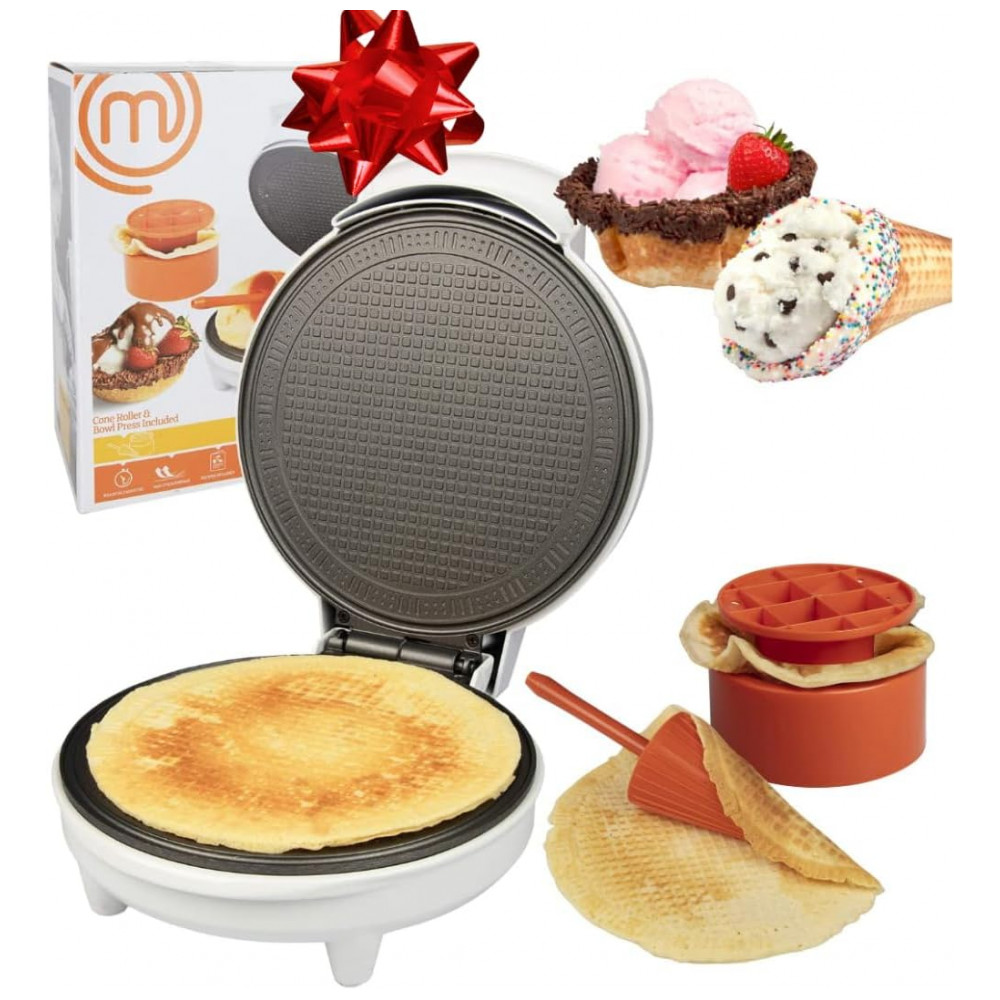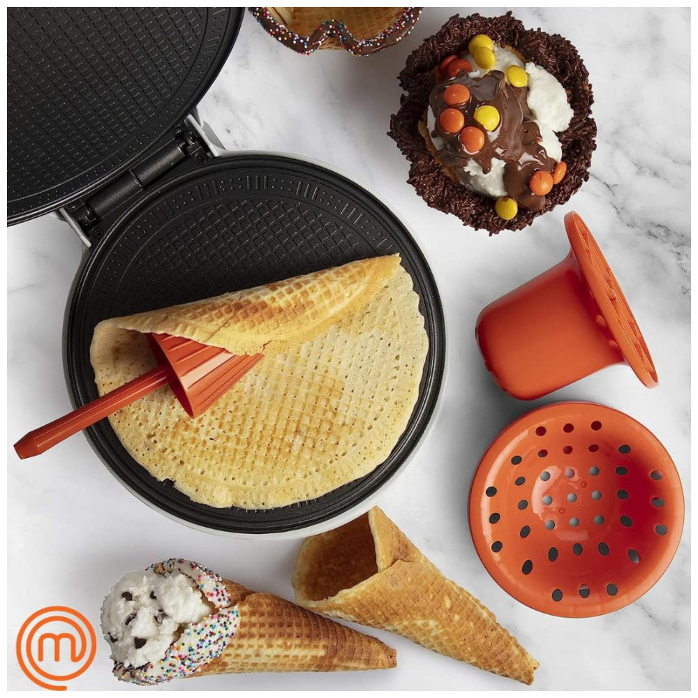 Cone de waffle e tigela Maker inclui Shaper Roller e Bowl Press Caseira sorvete máquina de ferro também produz Stroopwafels É fácil fazer deliciosos cones de sorvete waffle e taças de waffle em minutos com o Waffle Cone e Bowl Maker por MasterChef. Fácil de usar e fácil de limpar, você pode fazer deliciosos sorvetes caseiros em minutos. Este é um produto licenciado oficialmente da MasterChef.
