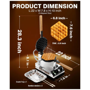 Desfrute de deliciosos waffles de bolhas de ovo hexagonais dourados em apenas 3 minutos com a potente máquina de waffle de bolhas PYY de 1500W. Com placas duplas giratórias de 180 graus, cada waffle é uniformemente aquecido e colorido, garantindo uma cor dourada e aroma irresistível. Controle preciso de temperatura e tempo ajustável de 50 a 250 graus Celsius permite a personalização do grau de crocância. As placas antiaderentes aquecem rapidamente, evitando que a massa grude ou queime, facilitando a limpeza pós-uso. Design ergonômico com alças de madeira, bandeja de migalhas removível e base de aço inoxidável resistente. Ideal para uso comercial e doméstico em padarias, cafeterias, food trucks e mais. Transforme seus waffles com frutas, sorvetes e diversos acompanhamentos. Aproveite a praticidade e qualidade da marca PYY!