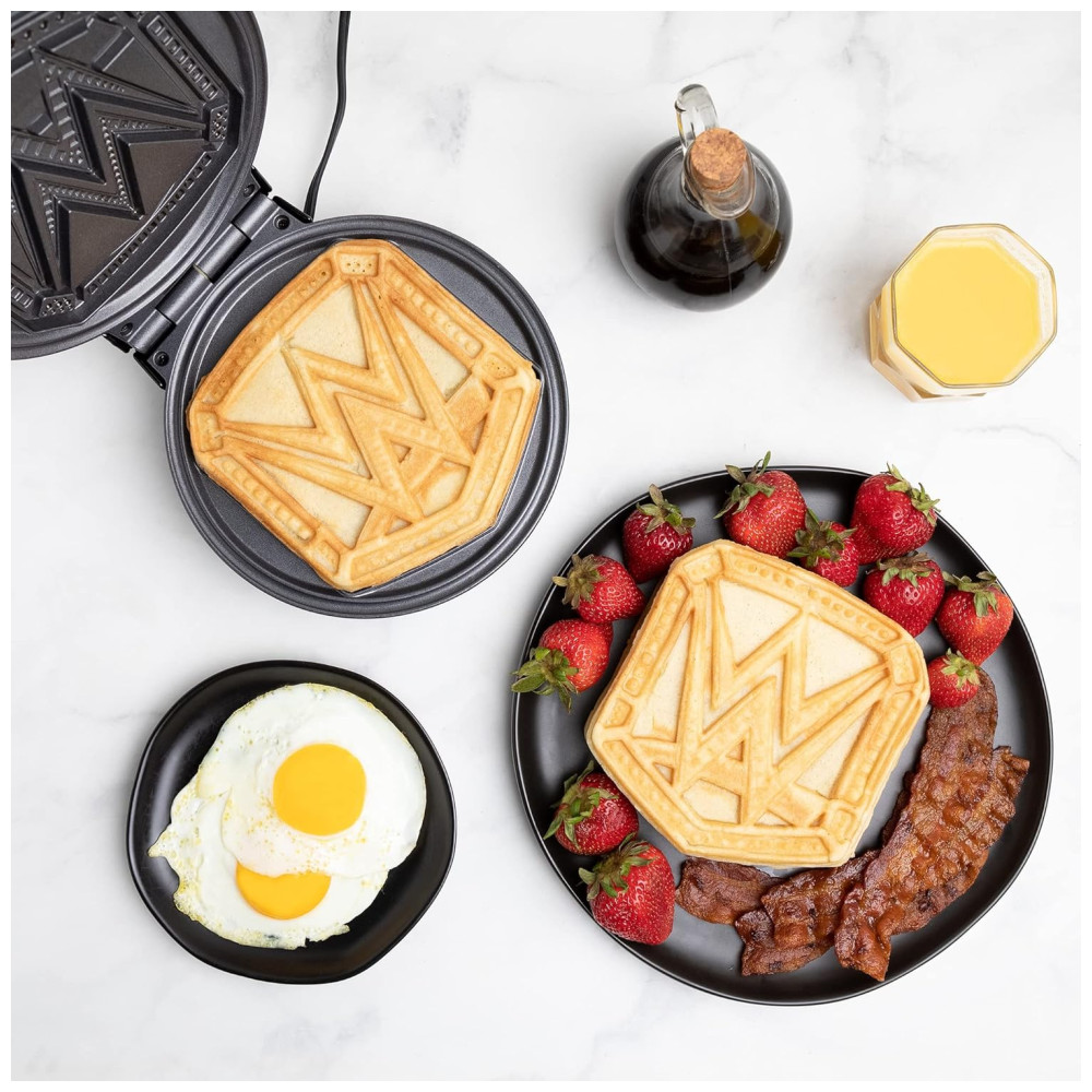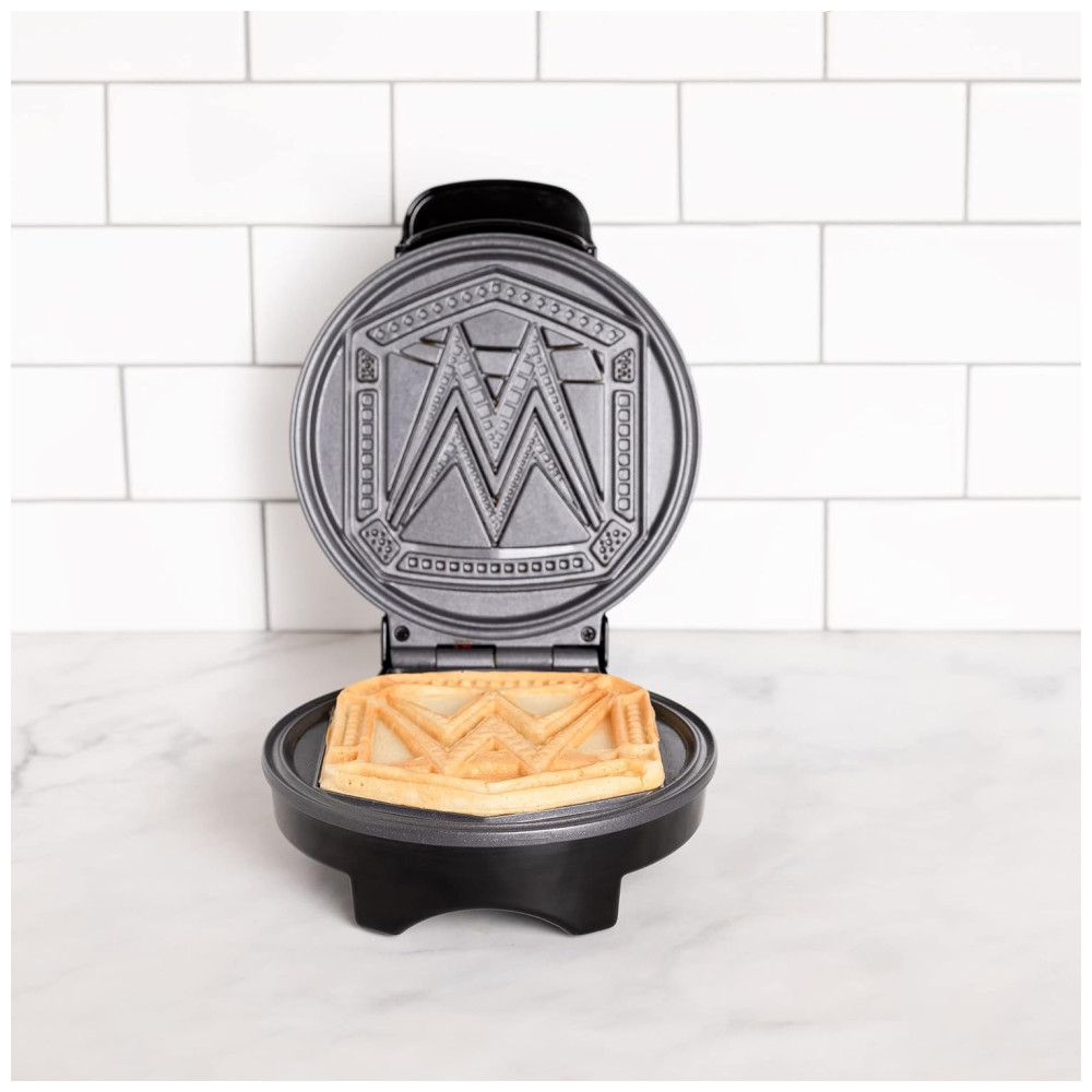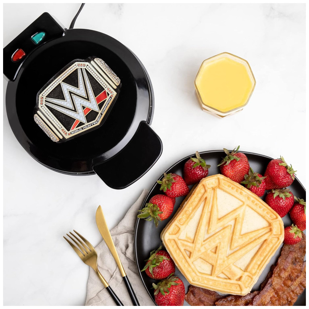 A Máquina de Waffle WWE Championship Belt permite criar dois tipos de waffles: o logotipo do Campeonato da WWE em 10 cm ou um waffle redondo de 17 cm ao despejar a massa em toda a placa. Seu design elegante e preto, com o logotipo da WWE na tampa, adiciona um toque especial à decoração da sua cozinha, tornando-a um presente perfeito para qualquer fã da cultura pop.