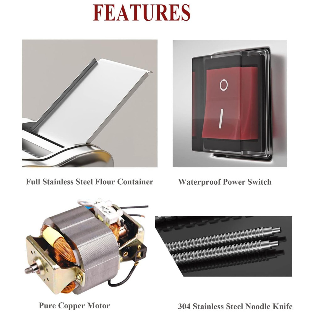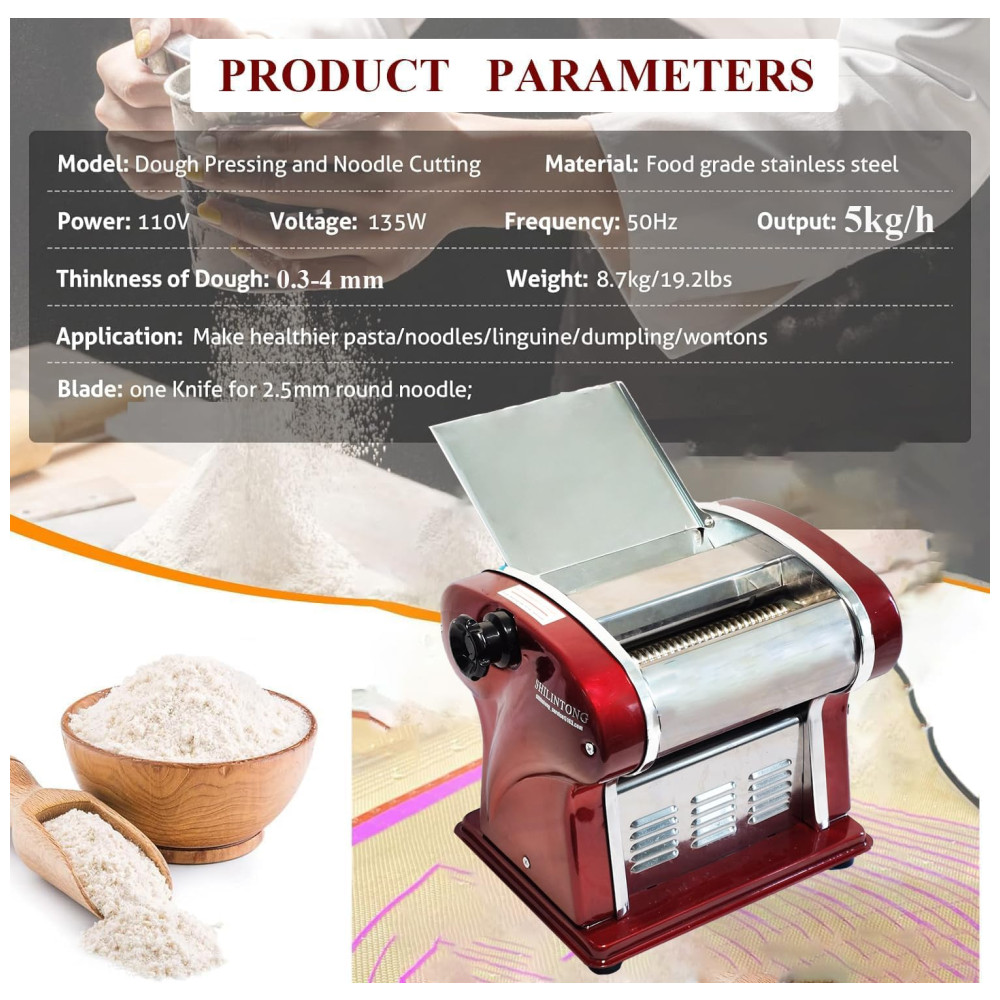 Design Multifuncional 2 em 1: A máquina elétrica de fazer macarrão SHILINTONG combina as funções de pressionar a massa e cortar o macarrão em um só aparelho. Alterne facilmente entre os modos para criar massa com espessura ajustável de 0,34 mm e cortar macarrão de 2,5 mm. Fácil de operar e limpar, perfeito tanto para uso doméstico quanto comercial. Seguro e Eficiente, em Aço Inoxidável de Grau Alimentício: Alimentado por 110V 135W com um plugue triangular padrão dos EUA para segurança. O corpo totalmente em aço inoxidável possui uma lâmina embutida para cortar dois tipos de macarrão – 34 dentes para macarrão redondo de 2,5 mm e 56 dentes para linguine de 2,5 mm. Também faz massas para dumplings e wontons sem esforço. Personalize seu Macarrão Saudável: Adicione ovos, suco de vegetais ou especiarias à massa para noodles, peles de dumplings ou wrappers de wonton personalizados e saudáveis. Sovar a massa manualmente, cortá-la em pedaços pequenos, pressionar repetidamente até obter a textura desejada. Certifique-se de que a massa esteja ligeiramente seca para obter os melhores resultados. Compacta e Leve para Uso Versátil: Com um tamanho compacto de 22 x 18 x 19 cm e design leve de 7,98 kg, esta máquina é fácil de mover e armazenar. Ideal para cozinhas domésticas, restaurantes de macarrão, cafés da manhã e até barracas de comida de rua. Economize Tempo e Seja Eficiente: Produza até 5 kg de macarrão fresco por hora, tornando rápido e fácil criar macarrão caseiro saudável. Seja para macarrão, peles de dumplings ou wrappers de wonton, esta máquina simplifica o processo, permitindo que você desfrute de refeições deliciosas e frescas com a família e amigos.