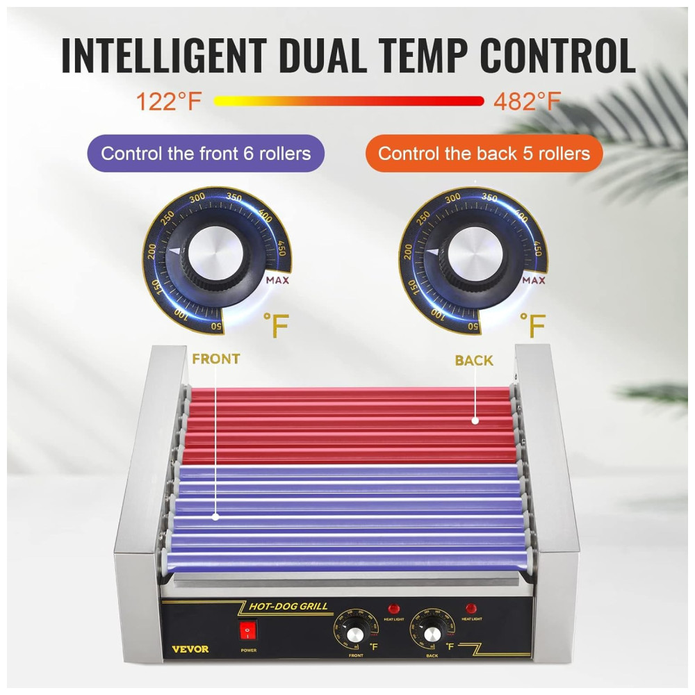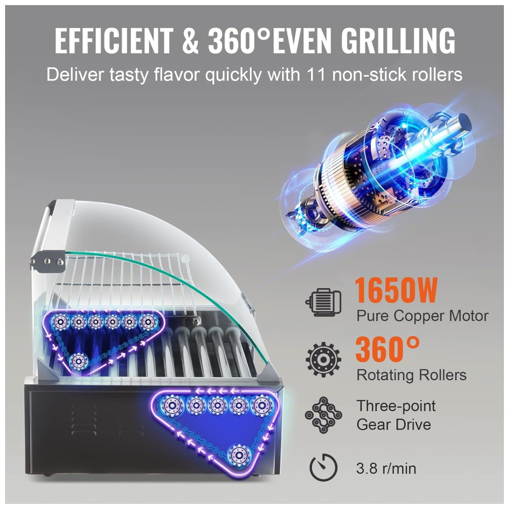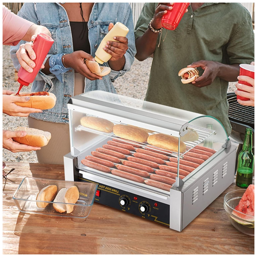 Máquina para Cachorro Quente 11 Rolos até 30 Salsichas com Controle de Temperatura Duplo Capa de Vidro e Bandeja de Gotejamento Removível 110V 1650W VEVOR Prata