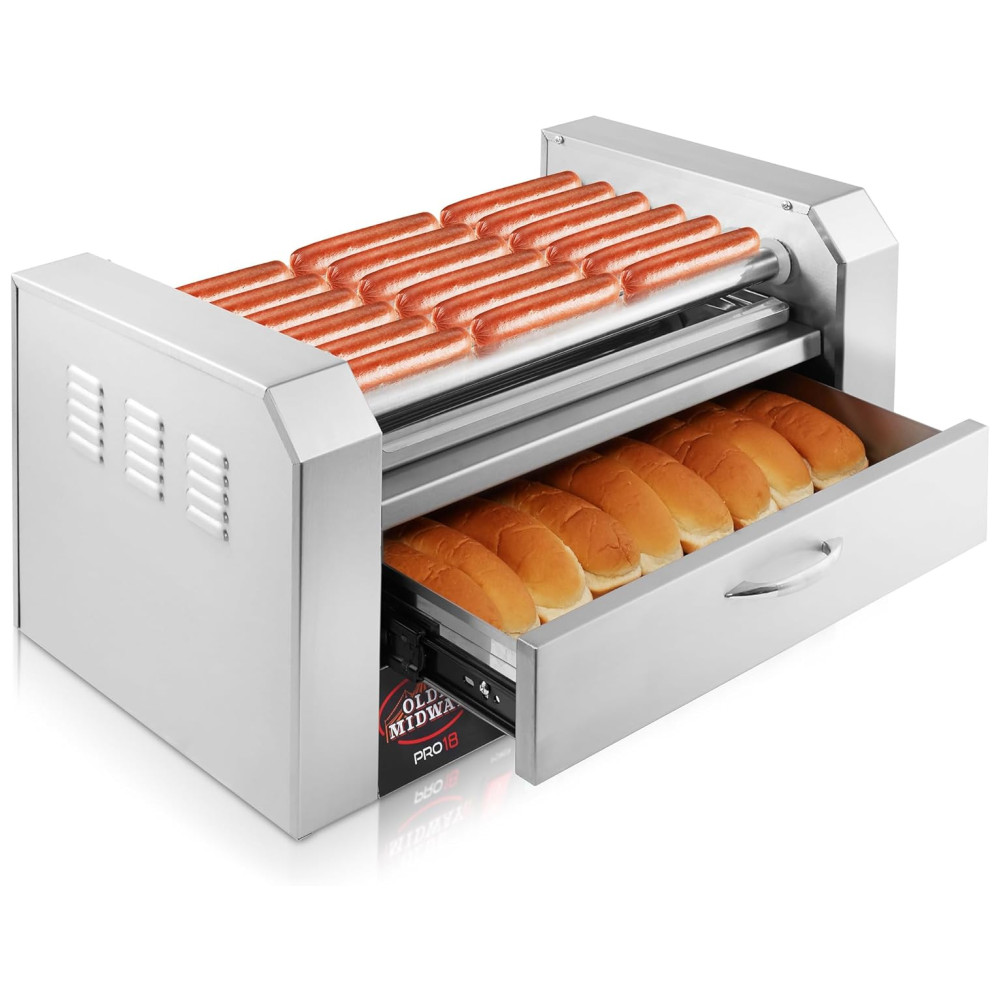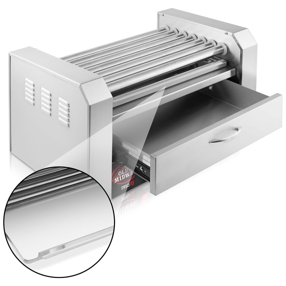 Máquina para Cachorro Quente 7 Rolos até 18 Salsichas com Gaveta de Aquecimento 110V 1100W OLDE MIDWAY Prata