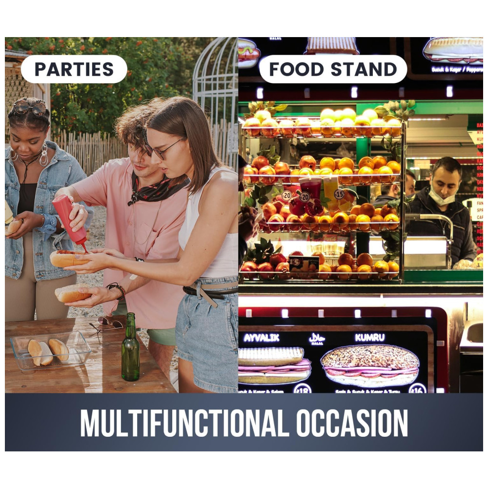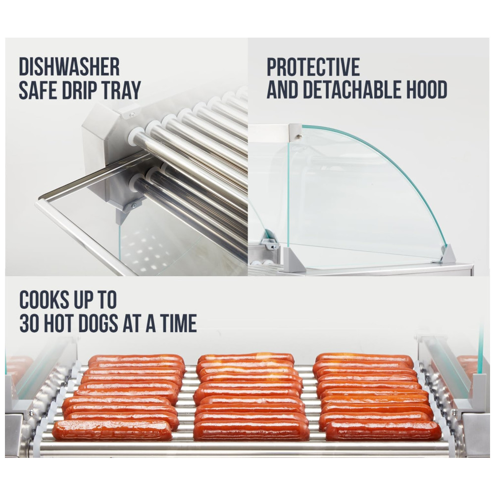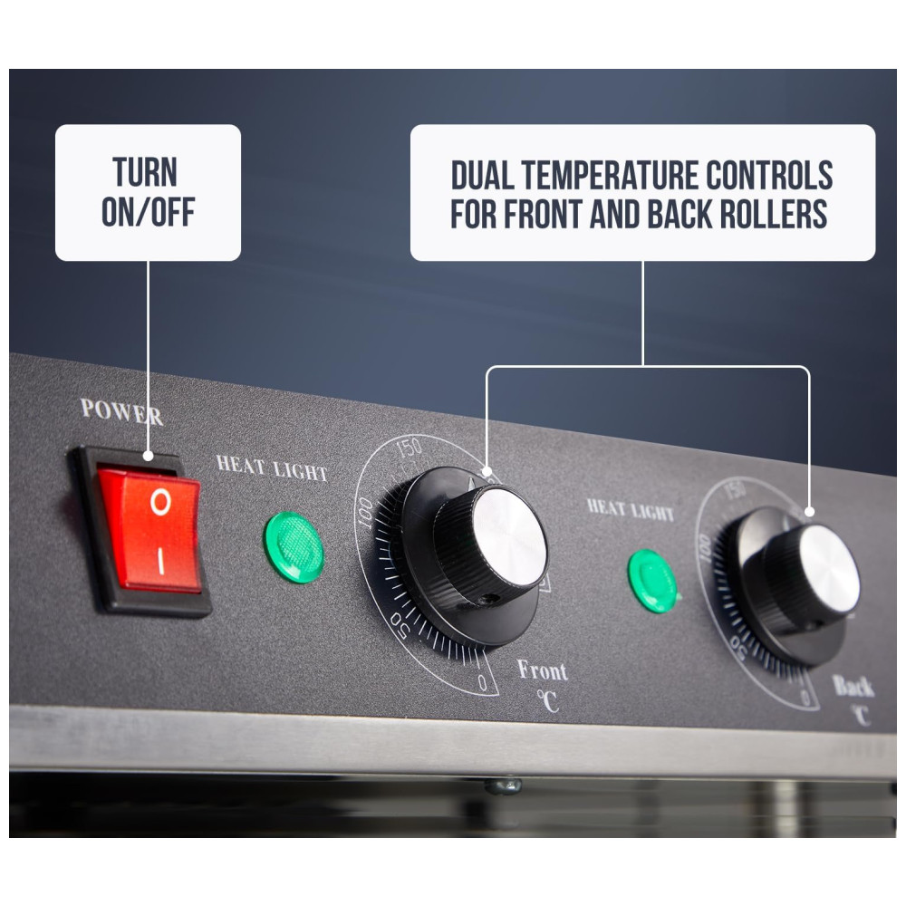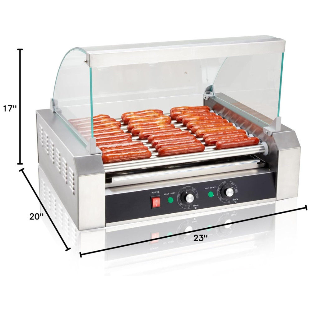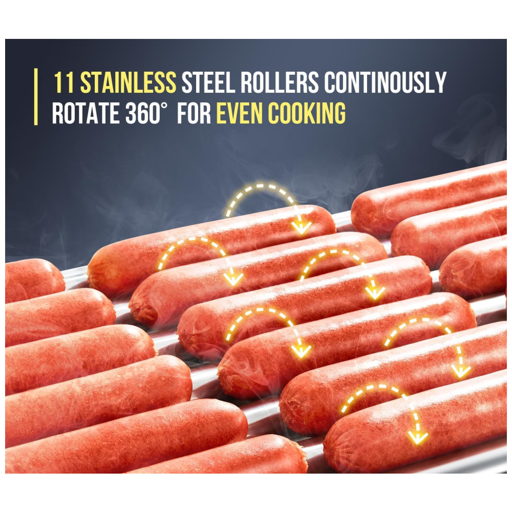 Este grelhador de cachorro quente é construído com aço inoxidável de grau comercial durável e possui 11 rolos antiaderentes de alta qualidade que podem cozinhar até 30 cachorros quentes simultaneamente. A máquina é projetada para grelhar uma variedade de alimentos, incluindo salsichas, taquitos e rolinhos de ovo. Possui controle duplo de temperatura, permitindo ajustar a temperatura de cozimento separadamente para os rolos dianteiro e traseiro.