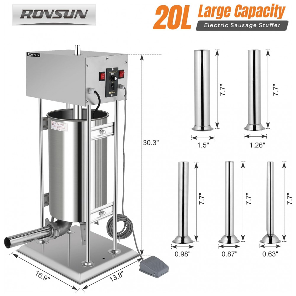 Máquina para Encher Linguiça Elétrica ROVSUN 20L/9kg Aço Inoxidável com Velocidade Ajustável e 5 Tubos de Enchimento Ideal para Uso Comercial