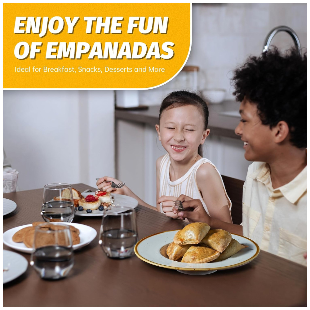EMPANADA DE TAMANHO PERFEITO: O fabricante de empanada é combinado com um molde de prensa de empanada. Isso o ajudará a rechear e cortar a massa no tamanho exato para caber na máquina e a fazer empanadas perfeitas.