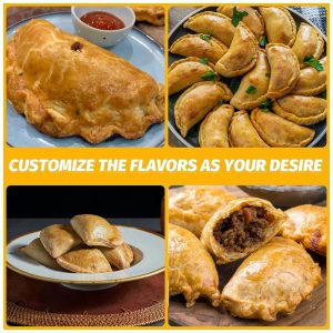 MAIS QUE EMPANDAS: A máquina também pode ser usada para fazer bolinhos, pierogi, momos, gyozas, adesivos de panela, hambúrgueres de carne jamaicanos, calzones ou tortas de bolso.