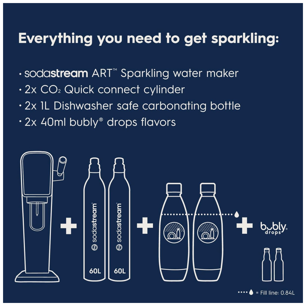 Inclui: máquina de água com gás, 2 cilindros de Co2 60L, 1 Botle para máquina de lavar louça Twin Pack e 2 sabores de gotas borbulhantes de 40 ml