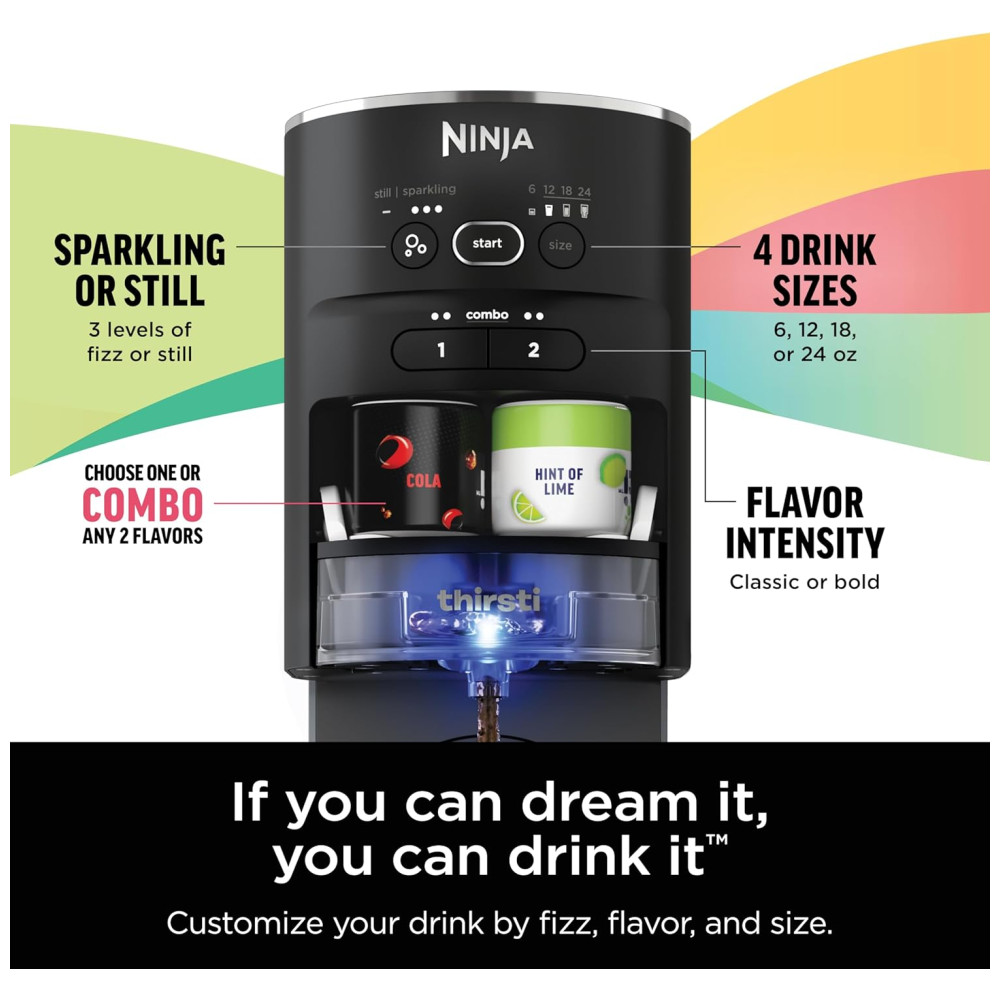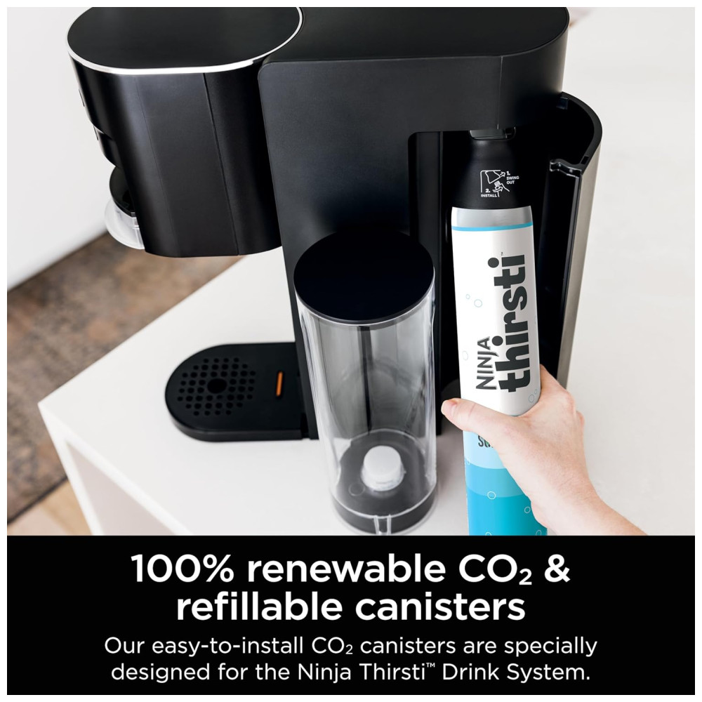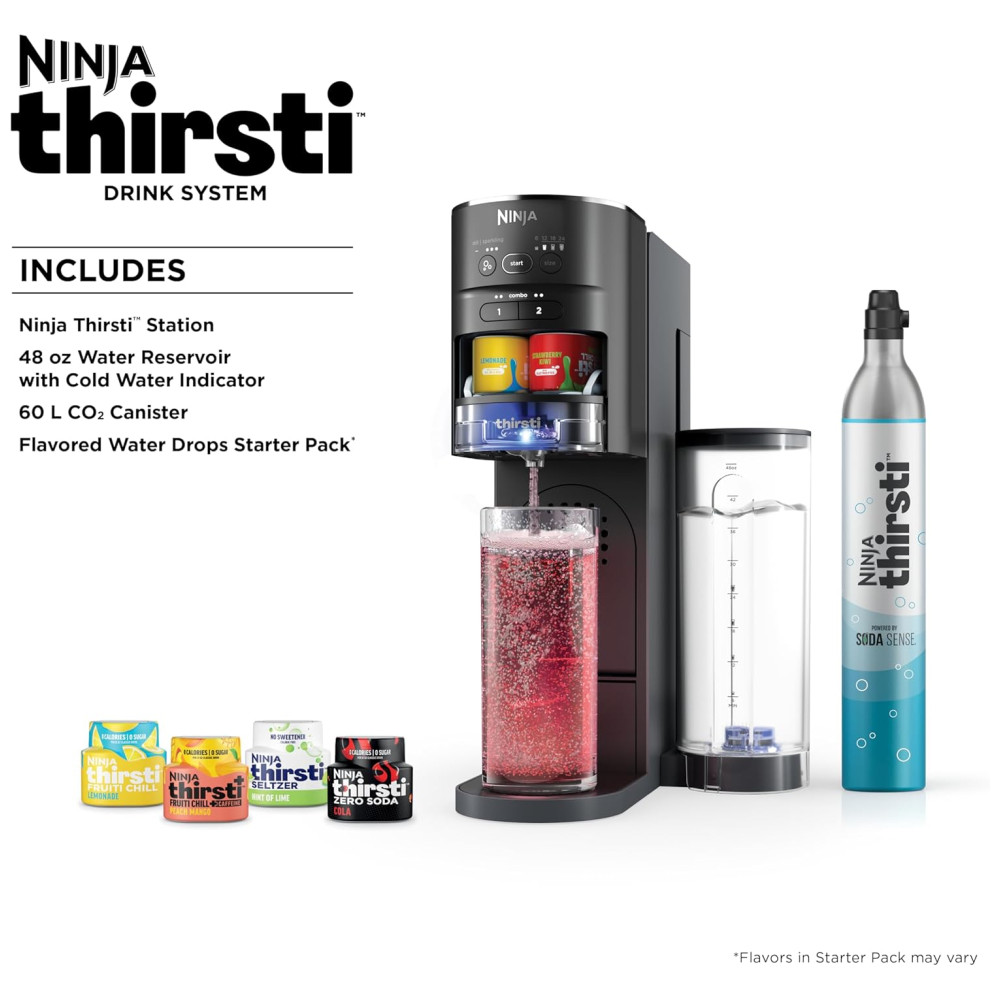 INCLUI: Máquina Ninja Thirsti, reservatório de água removível sensível à temperatura de 1,4 L, cilindro de CO2 de 60 litros, variedade de gotas de água com sabor.