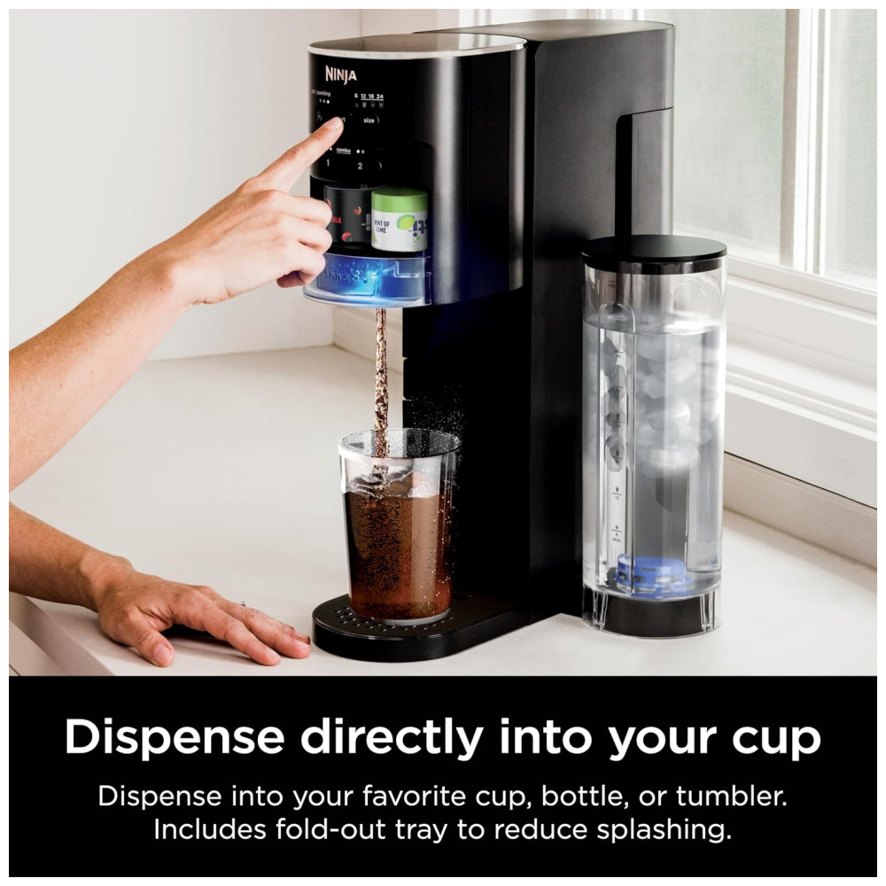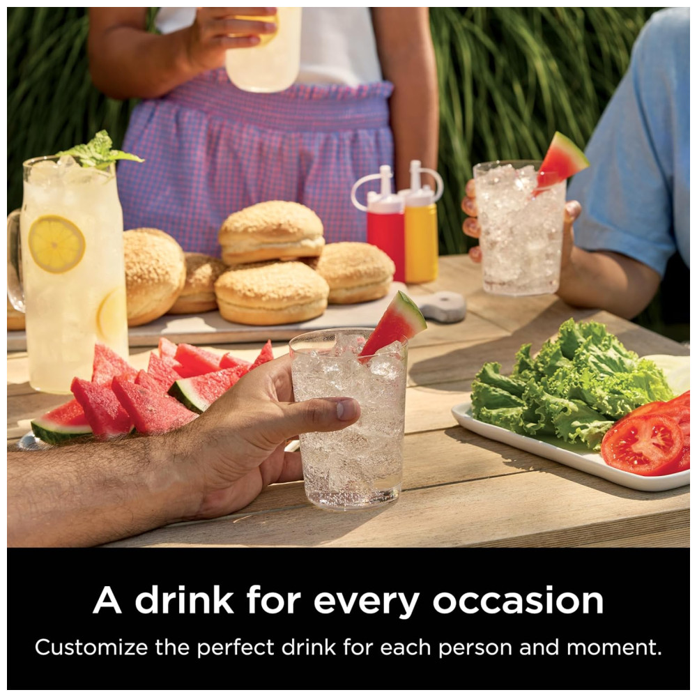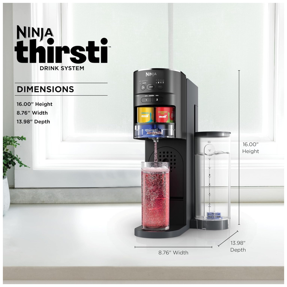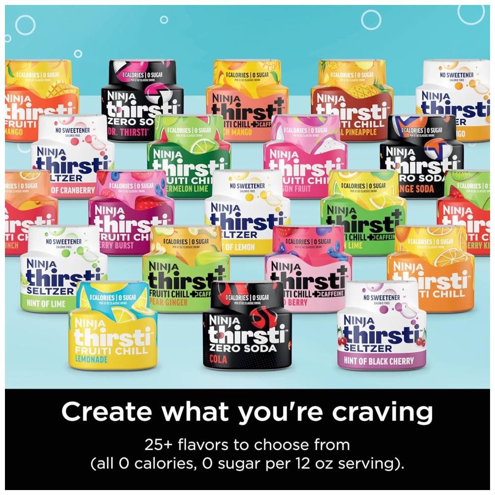 INCLUI: Máquina Ninja Thirsti, reservatório de água removível sensível à temperatura de 1,4 L, cilindro de CO2 de 60 litros, variedade de gotas de água com sabor.