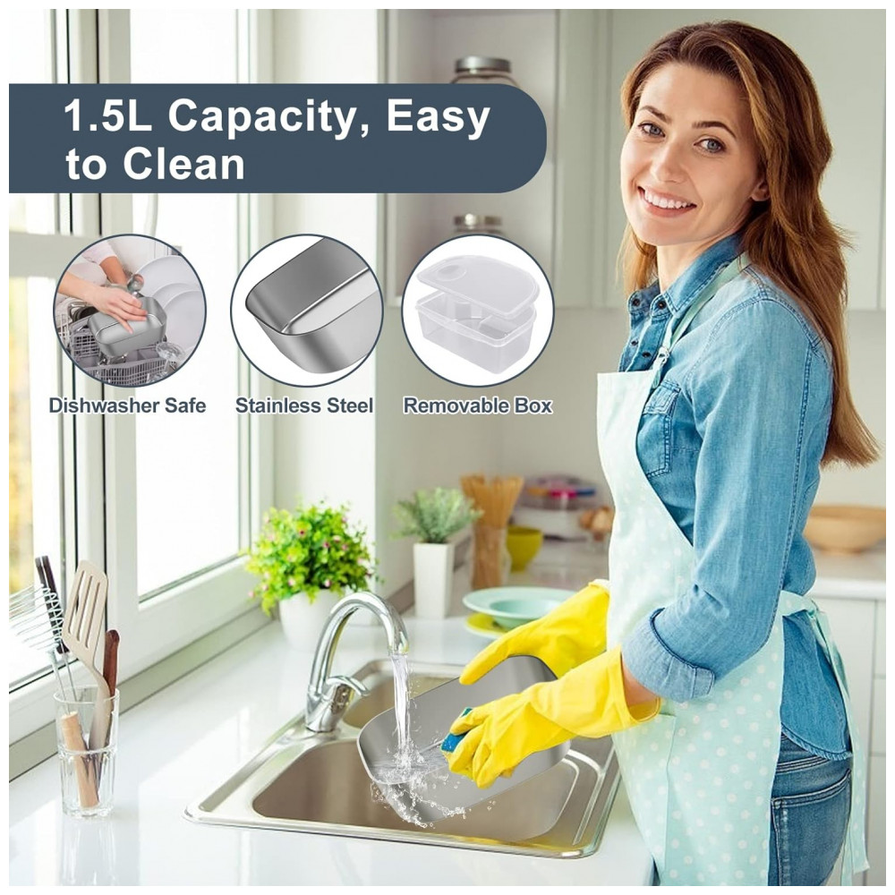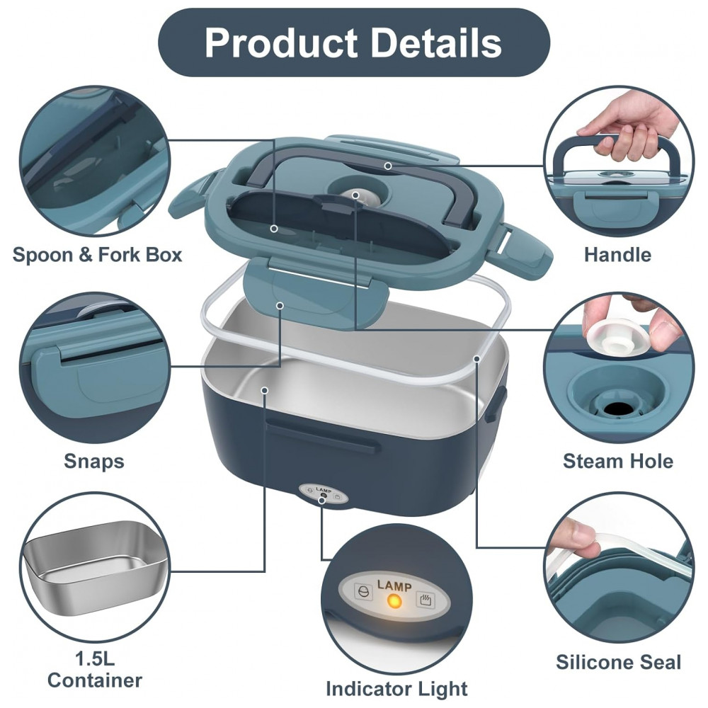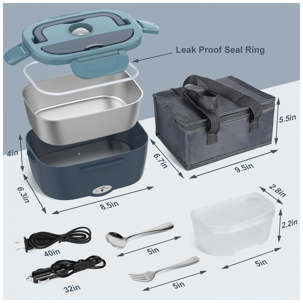 Material e fácil de limpar Lancheira aquecida portátil feita de plástico PP premium e aço inoxidável 304, que é e durável. Contém um recipiente de aço inoxidável removível de 1,5L e uma caixa de plástico de 0,45L para zenamento, podem ser lavados na máquina de lavar louça. Dicas quentes não limpe a base de aquecimento com água, não adicione água à base de aquecimento para evitar curtos circuitos