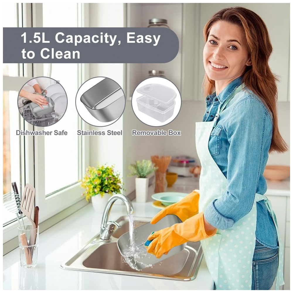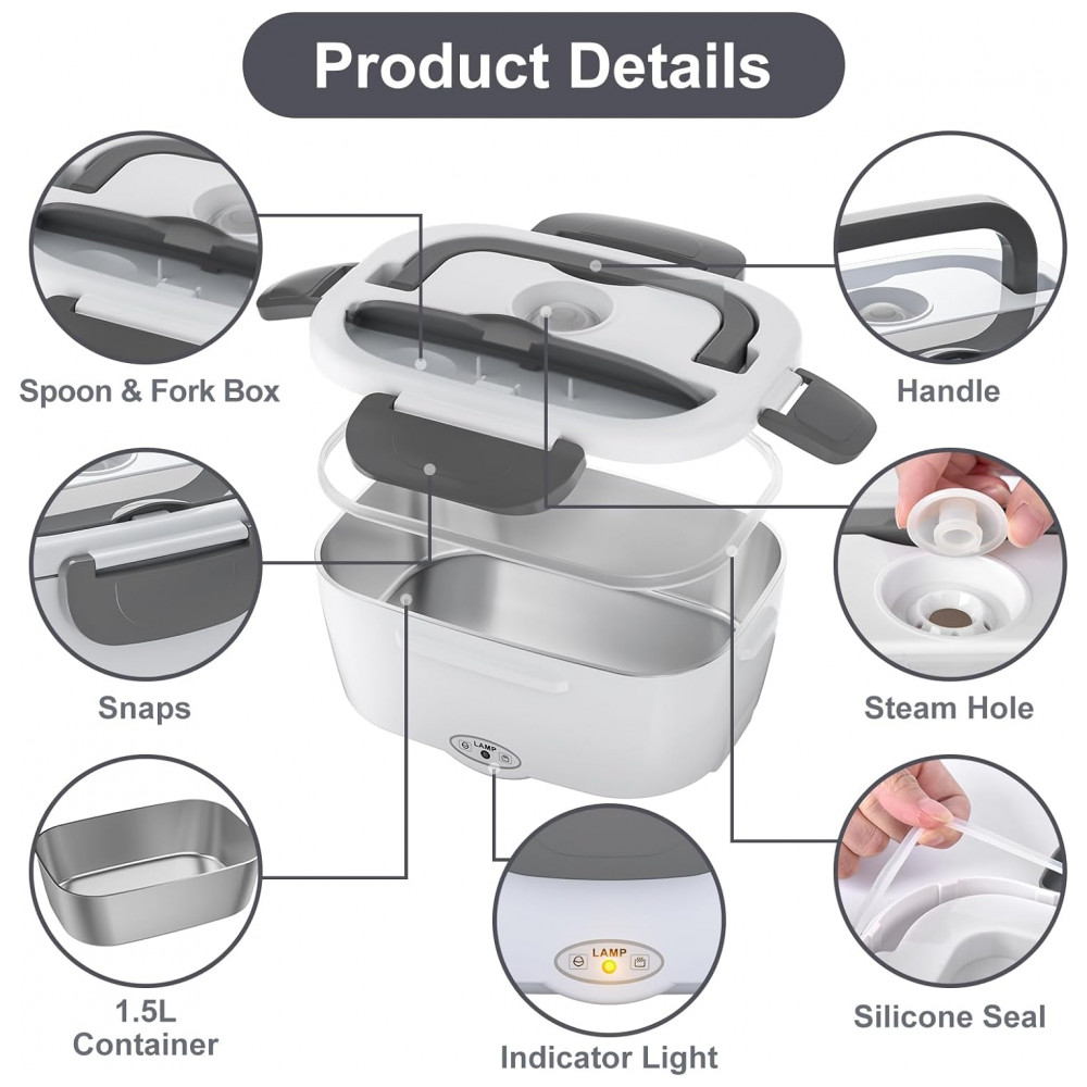 Material e fácil de limpar Lancheira aquecida portátil feita de plástico PP premium e aço inoxidável 304, que é e durável. Contém um recipiente de aço inoxidável removível de 1,5L e uma caixa de plástico de 0,45L para zenamento, podem ser lavados na máquina de lavar louça. Dicas quentes não limpe a base de aquecimento com água, não adicione água à base de aquecimento para evitar curtos circuitos