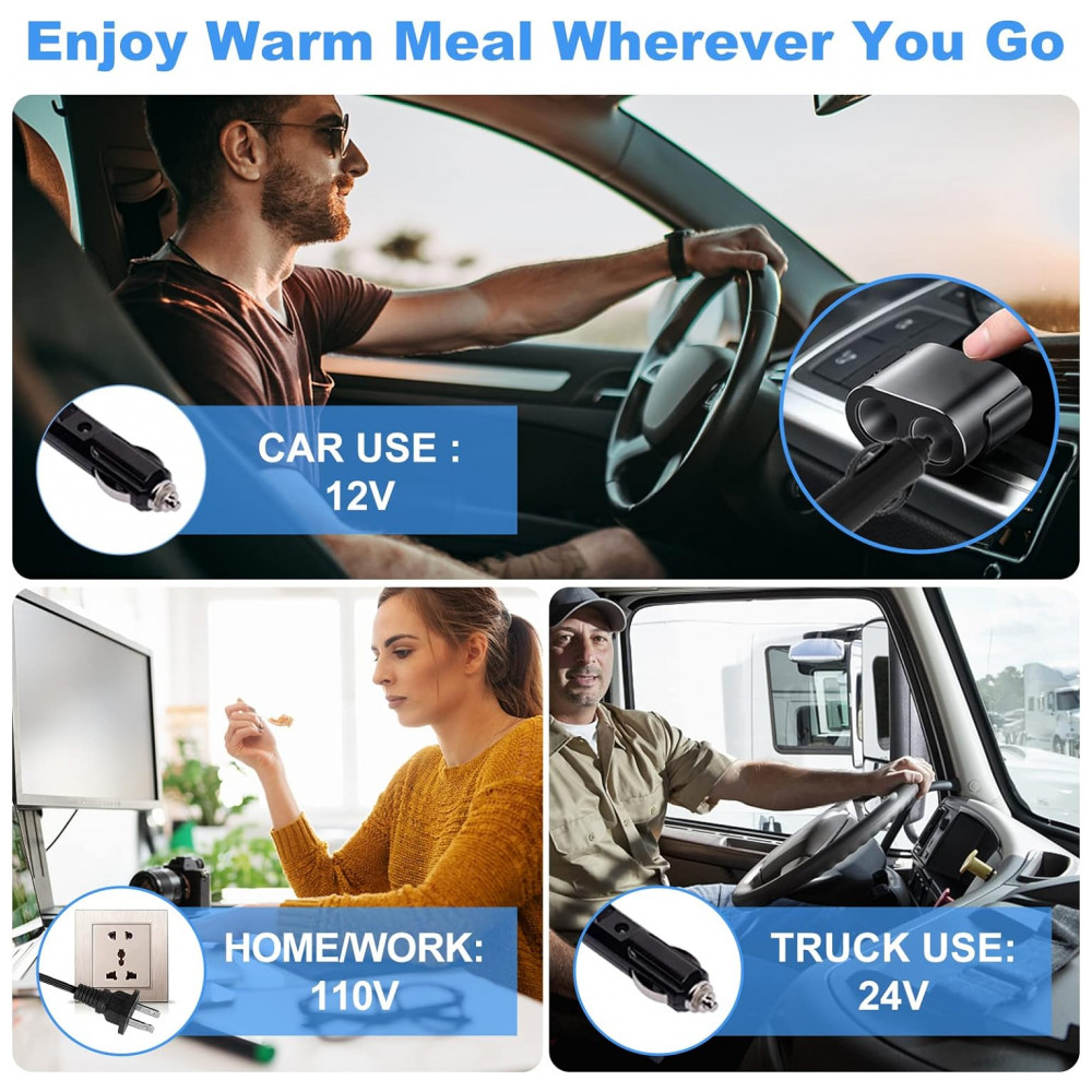 Carro, caminhão portátil e uso doméstico O aquecedor elétrico portátil para almoço contém um adaptador de uso de carro, caminhão de 12V, 24V e um plugue de uso doméstico, trabalho de 110V, para que você aqueça a comida em movimento. Chega de comida fria e de perder tempo procurando ou esperando muito tempo por um micro ondas.