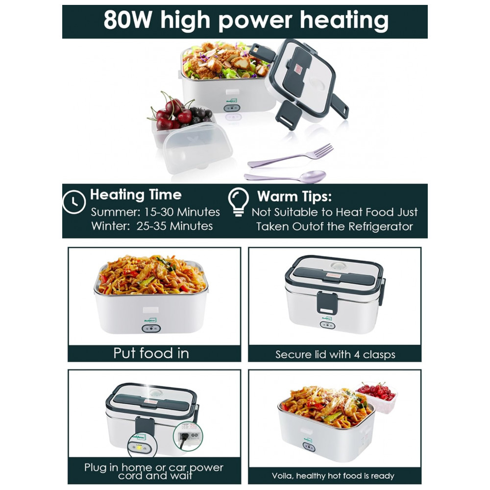Aquecimento rápido de 70W Adota o mais recente aquecimento de temperatura constante PTC projetado e usa alta potência de 70W. Ciclo térmico de baixo consumo e alta eficiência, aquecendo seu almoço na velocidade mais rápida, mantendo a umidade e o frescor dos alimentos . Não há mais necessidade de comer sanduíches pouco saudáveis e fast food. Você pode comer comida caseira fresca e quente no menor tempo possível no escritório e no canteiro de obras Uma forma saudável de comer