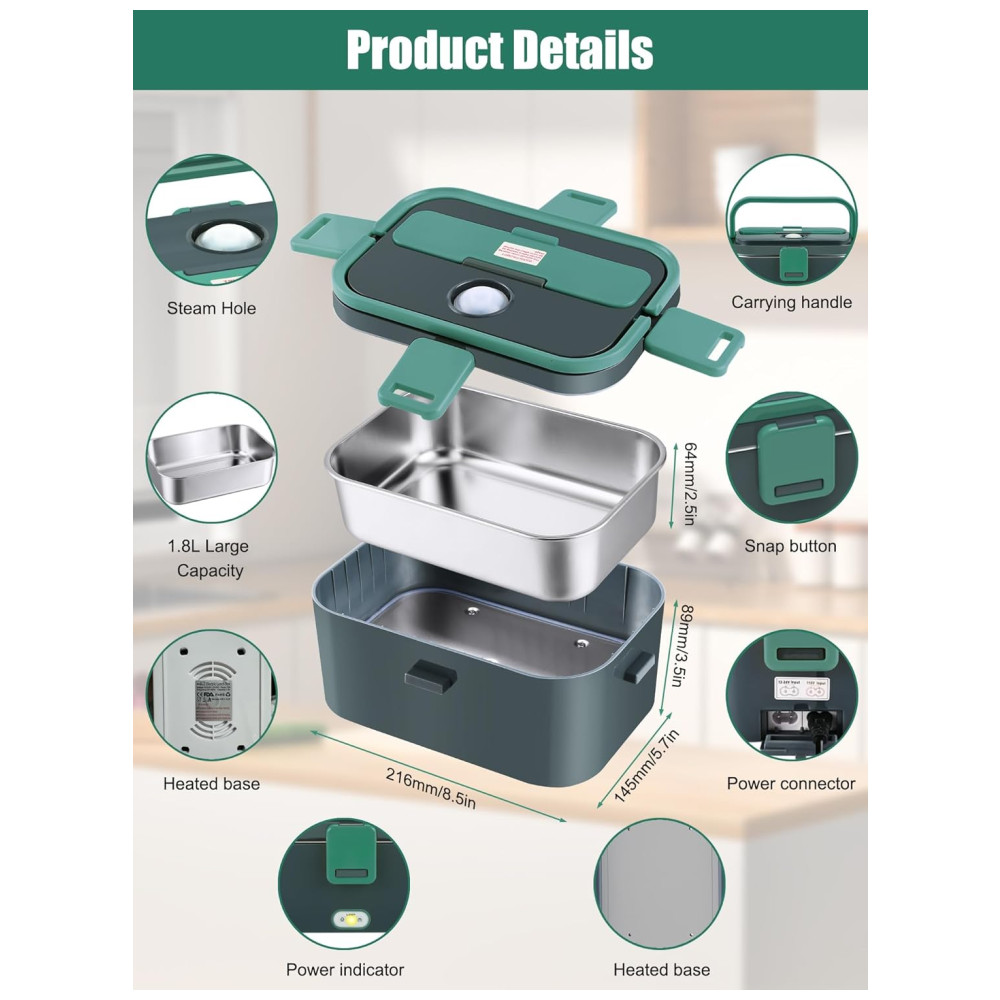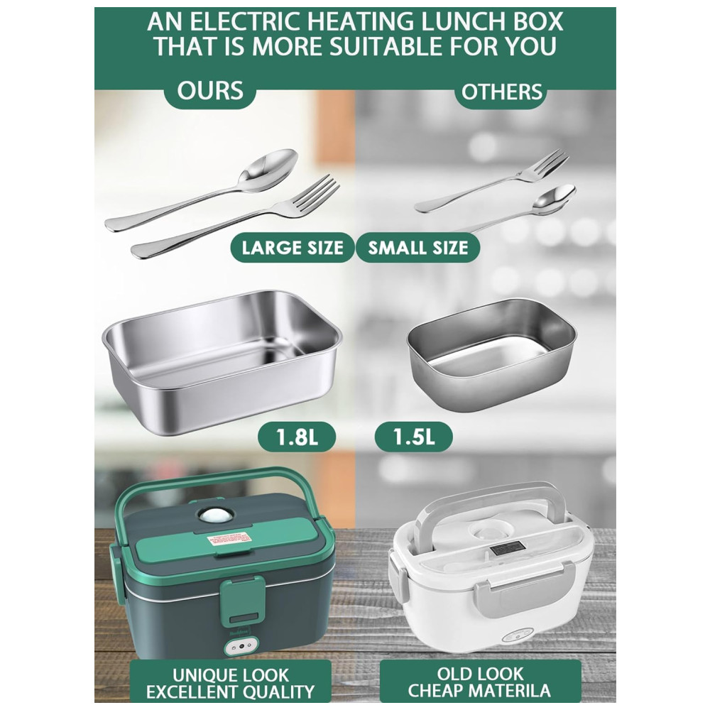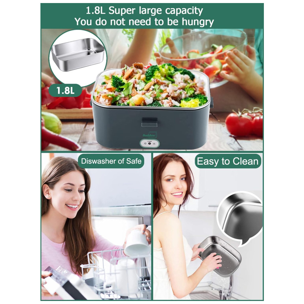 Design de grande capacidade de 1,8 L Não se preocupe em não ter mais comida suficiente, a lancheira de aquecimento elétrico Buddew projetou a mais recente lancheira de grande capacidade. A capacidade da nossa lancheira aquecedora de alimentos portátil atingiu 1,8L 20 a mais do que nossos pares. Especialmente projetada para grandes comedores e trabalhadores da construção, permitindo que as pessoas que usam lancheiras com aquecimento elétrico desfrutem de sua comida caseira quente e saudável. Você Estamos a poucos minutos de Super satisfeito.