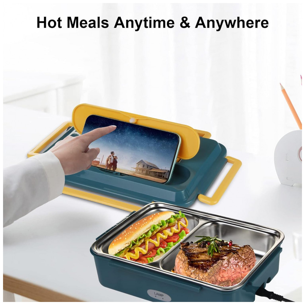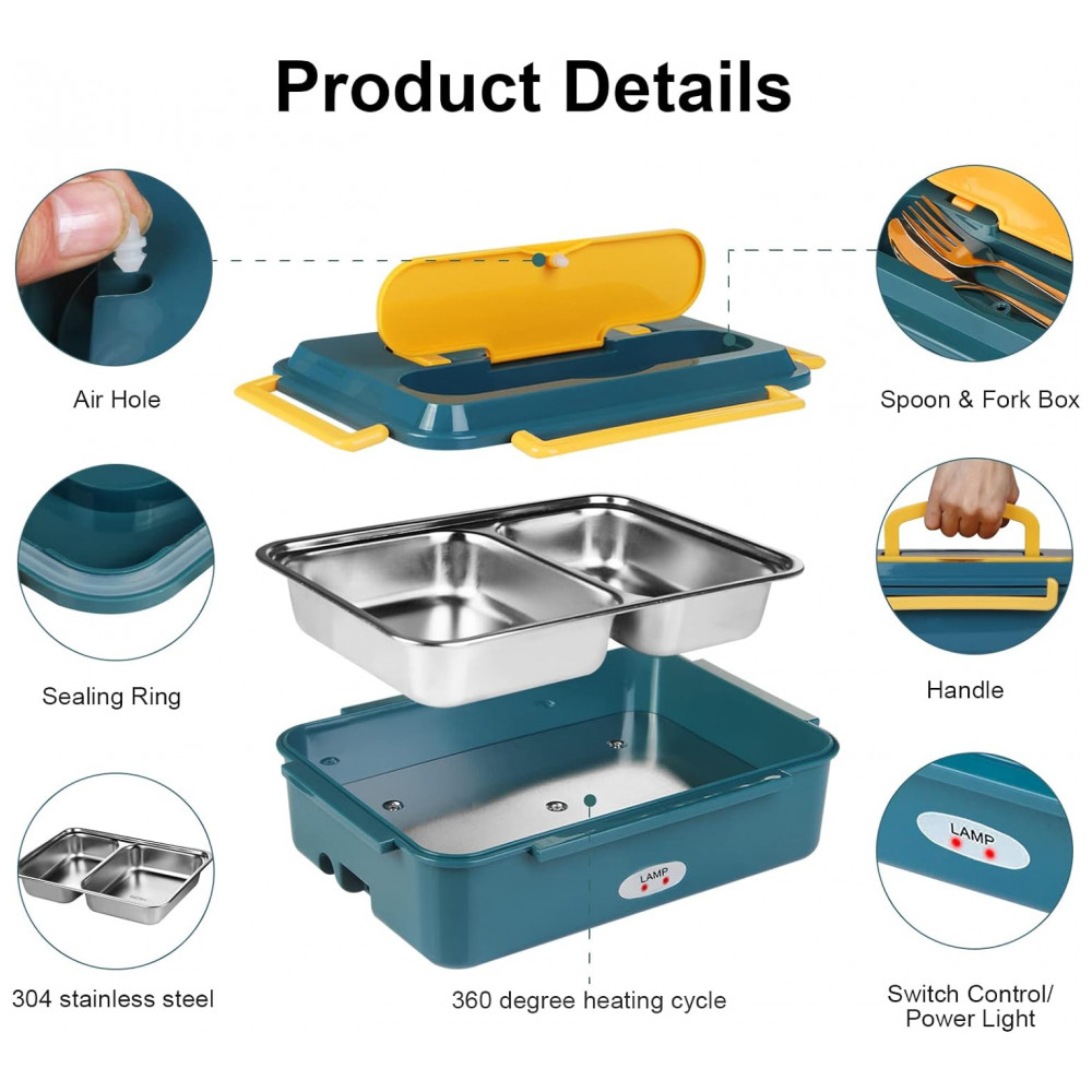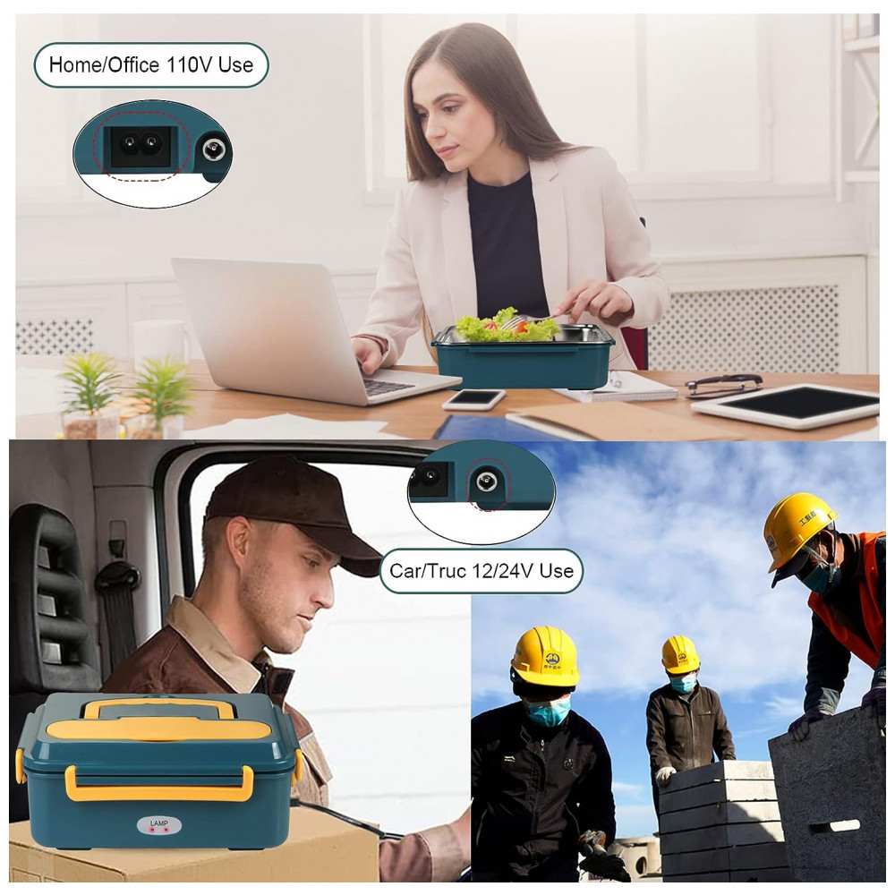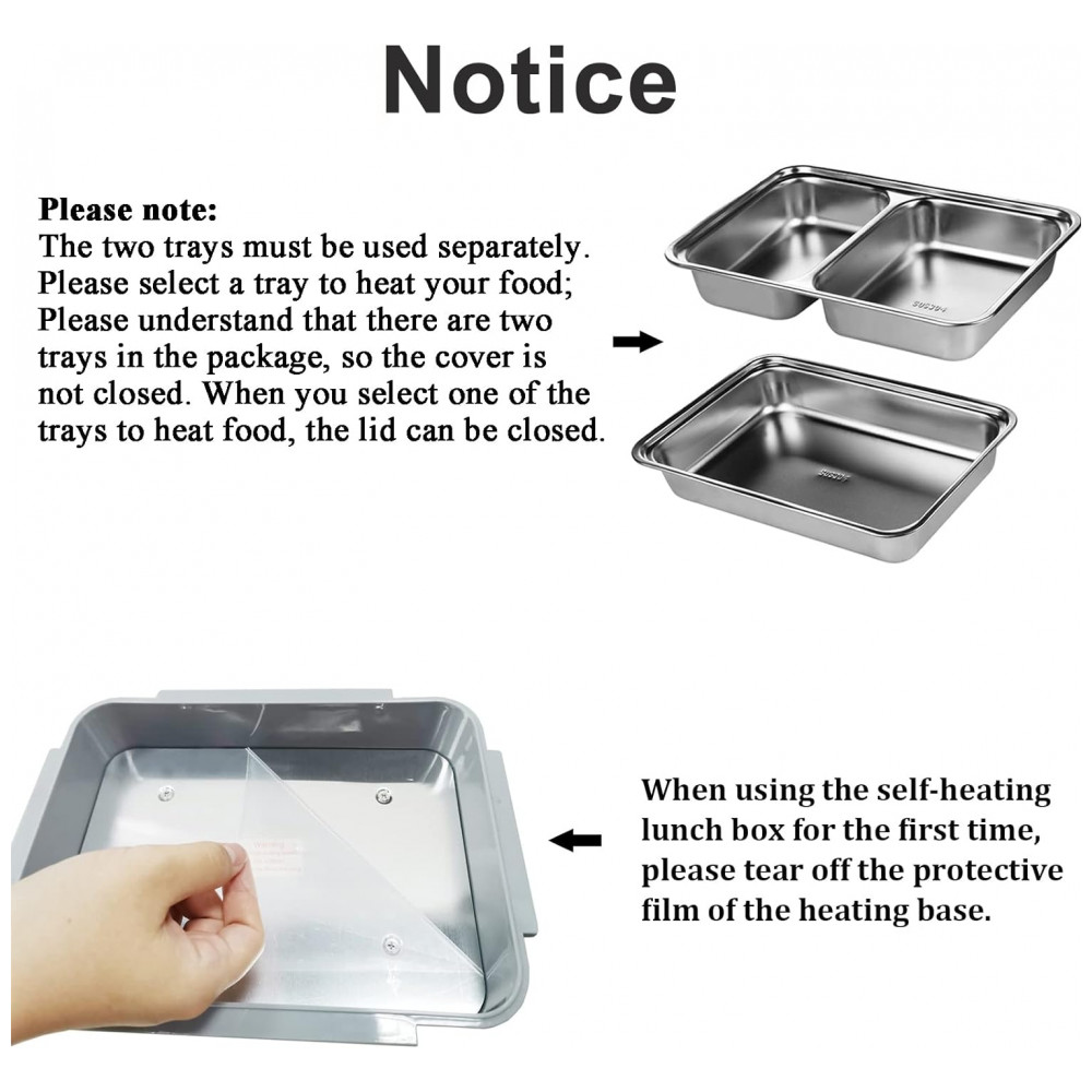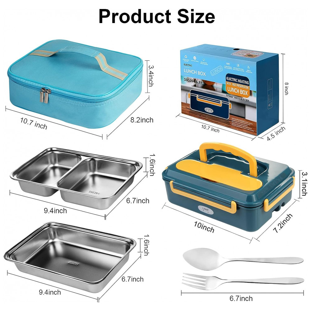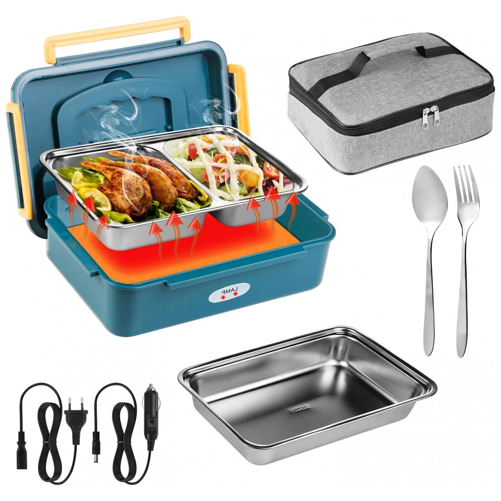 A lancheira elétrica é feita de materiais premium, com plástico PP de qualidade alimentar e recipiente de aço inoxidável 304, que garantem forte resistência ao calor e segurança no uso. O aquecimento é rápido, graças à placa de alumínio na parte inferior da lancheira e à tecnologia de aquecimento PTC de temperatura constante, que proporciona um ciclo de aquecimento de 360 graus. Com dois plugues diferentes um para uso em casa e outro para uso em carros e caminhões, é possível preparar refeições saudáveis e quentes em qualquer lugar. A tampa de vedação aprimorada e o anel de vedação de borracha embutido evitam vazamentos, mantendo os alimentos frescos e quentes. A bandeja de aço inoxidável 304 é facilmente removível para limpeza e pode ser colocada na máquina de lavar louça. É importante lembrar de retirar a película protetora da base de aquecimento antes do primeiro uso da lancheira com autoaquecimento.