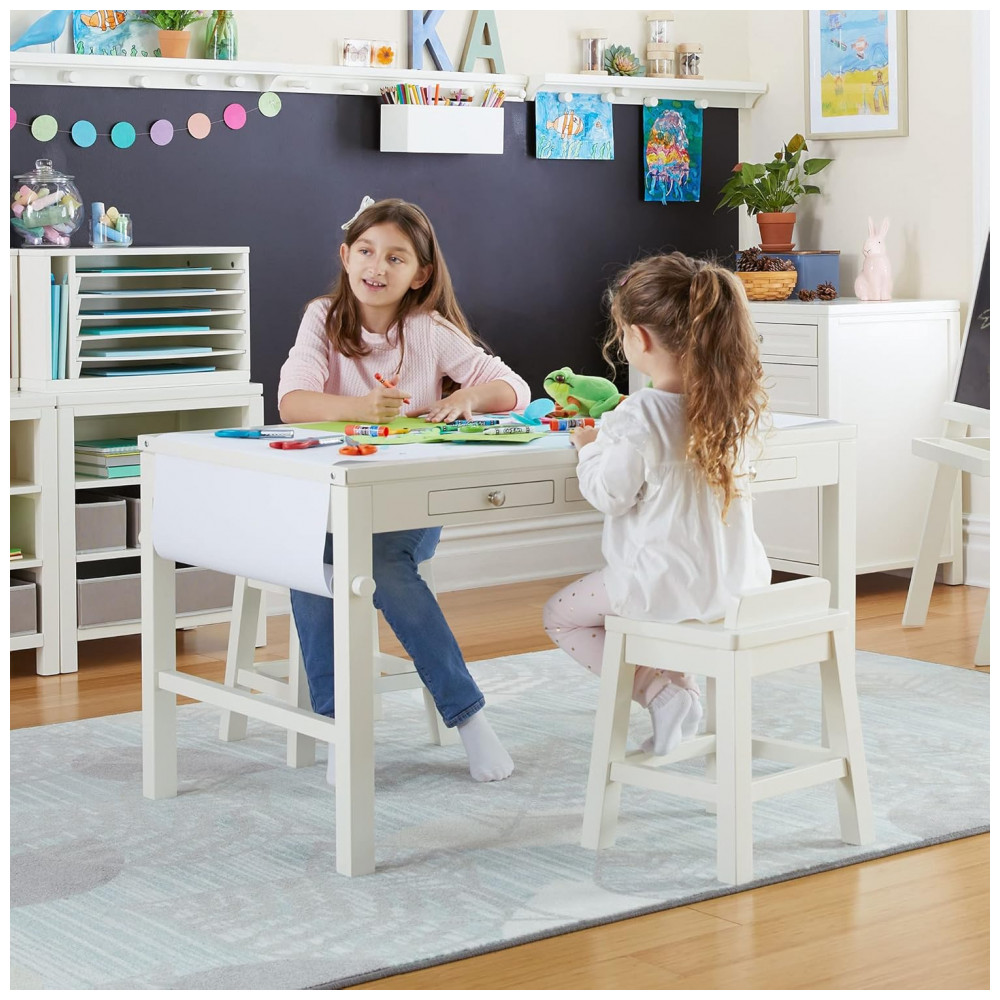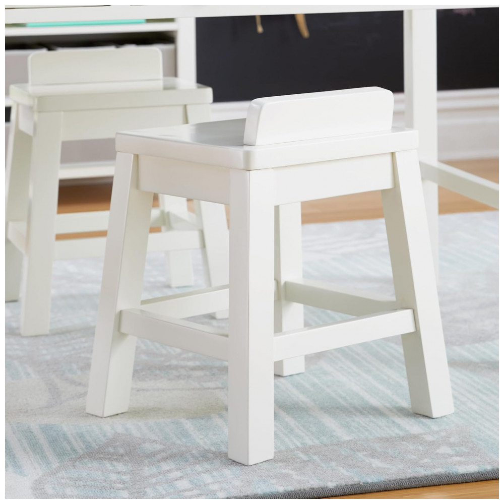 O conjunto Martha Stewart Crafting 2-Piece Kids’ Stool Set Linen White é formado por duas banquetas infantis em madeira, projetadas para uso com mesas de atividades, mesas de artes e escrivaninhas infantis. Cada banqueta possui pernas levemente abertas e encosto baixo que ajudam a reduzir o risco de tombamento, oferecendo área estável de assento para crianças a partir de 3 anos.