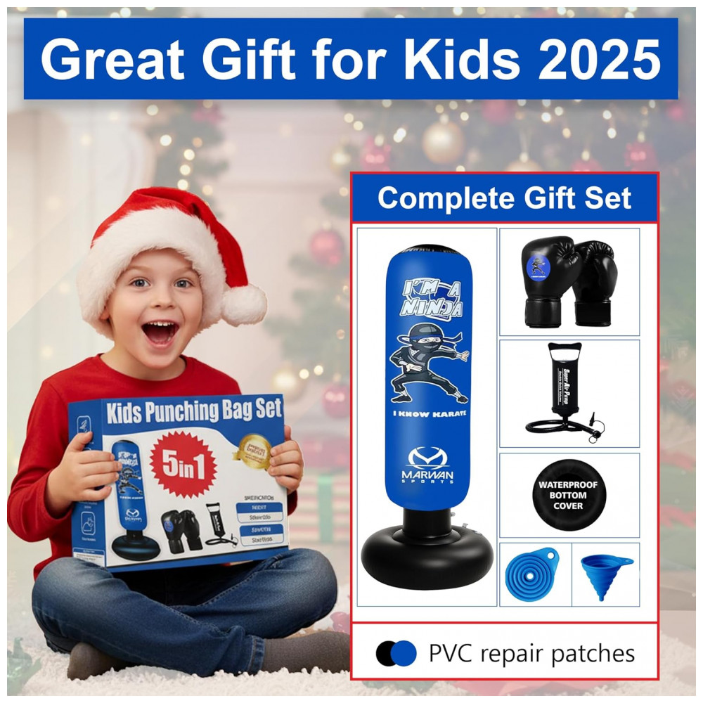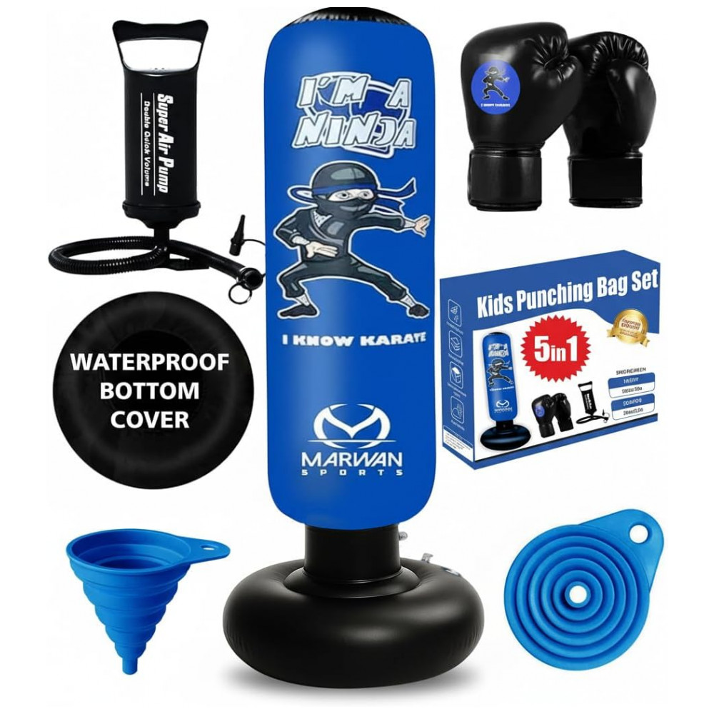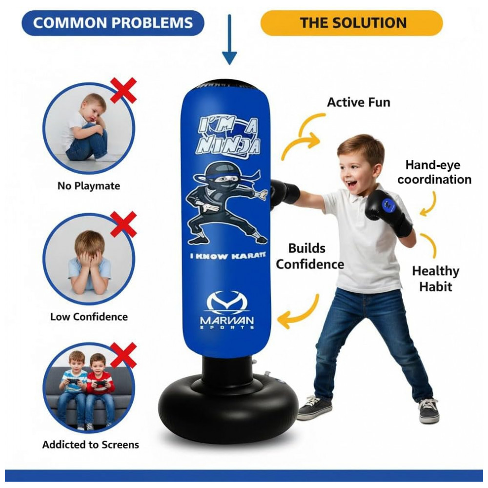 Estimule a energia e a confiança do seu filho com o conjunto de bolsa de pancada Marwan Sports – o presente perfeito para crianças ativas que desejam liberar toda sua energia de forma saudável e divertida.