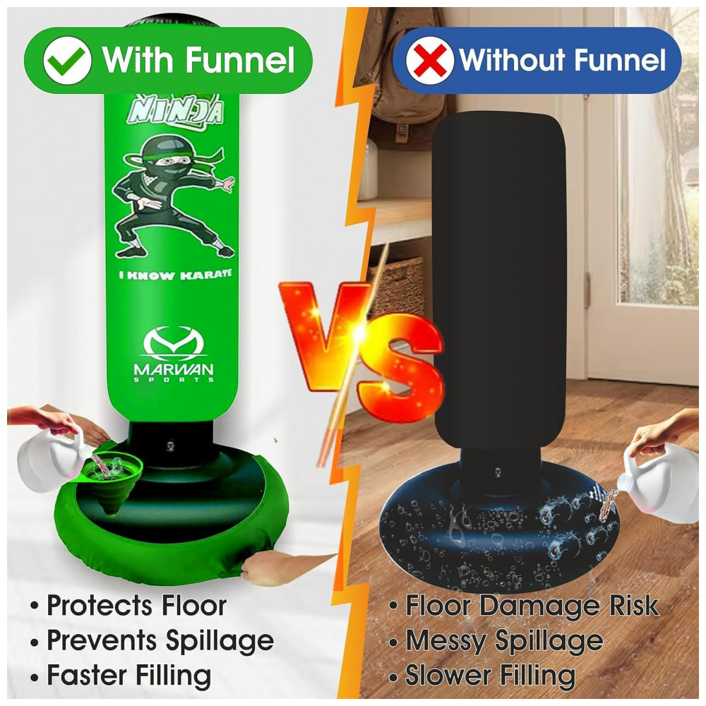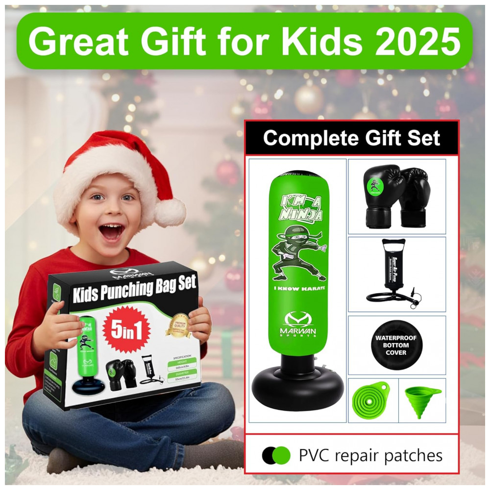 Desperte o ninja que existe em seu filho com o conjunto de saco de pancadas inflável Marwan Sports, o brinquedo esportivo definitivo para crianças ativas! Ideal para meninos e meninas de 4 a 12 anos, este saco de pancadas divertido e interativo promove o desenvolvimento da concentração, coordenação, força e autoestima, tudo isso enquanto mantém as crianças longe das telas e cheias de energia. Com 160 cm de altura e 61 cm de largura, possui tamanho perfeito para crianças, garantindo segurança e conforto durante o uso. Construído em PVC resistente de 0,5 mm, o saco é testado para suportar até 10.000 golpes sem apresentar vazamentos ou perda de ar, oferecendo horas de diversão ininterrupta. Seu design inovador com três câmaras de ar proporciona um retorno rápido a cada golpe, incentivando a prática contínua dos movimentos e o desenvolvimento da agilidade. A base mais larga oferece estabilidade extra, mantendo o saco firme mesmo diante de socos e chutes potentes. Este conjunto completo inclui luvas de boxe de 170g que se ajustam perfeitamente às mãos das crianças, bomba de ar para enchimento rápido e fácil, além de capa inferior e funil para montagem sem complicações. Perfeito para crianças apaixonadas por esportes como boxe, karatê, taekwondo, MMA e outras artes marciais, esse saco ajuda no aprendizado da autodefesa, fortalecimento muscular e diversão saudável tanto em ambientes internos quanto externos. Ao adquirir este produto, você também estará apoiando projetos de conscientização sobre o autismo, pois parte das vendas é destinada a iniciativas de suporte a essa causa importante. Proporcione ao seu filho uma maneira divertida e saudável de liberar energia, melhorar habilidades motoras e aumentar a confiança com o saco de pancadas inflável Marwan Sports – o presente ideal para qualquer ocasião especial!