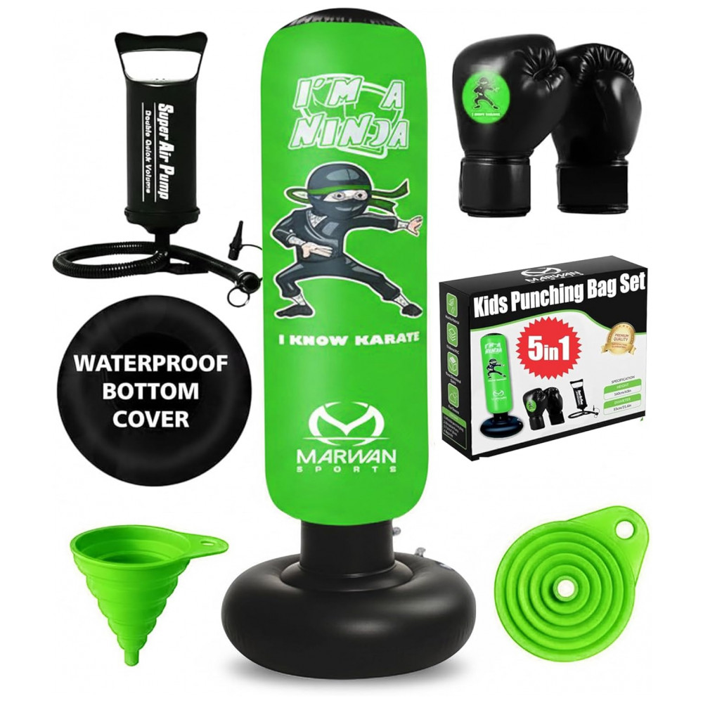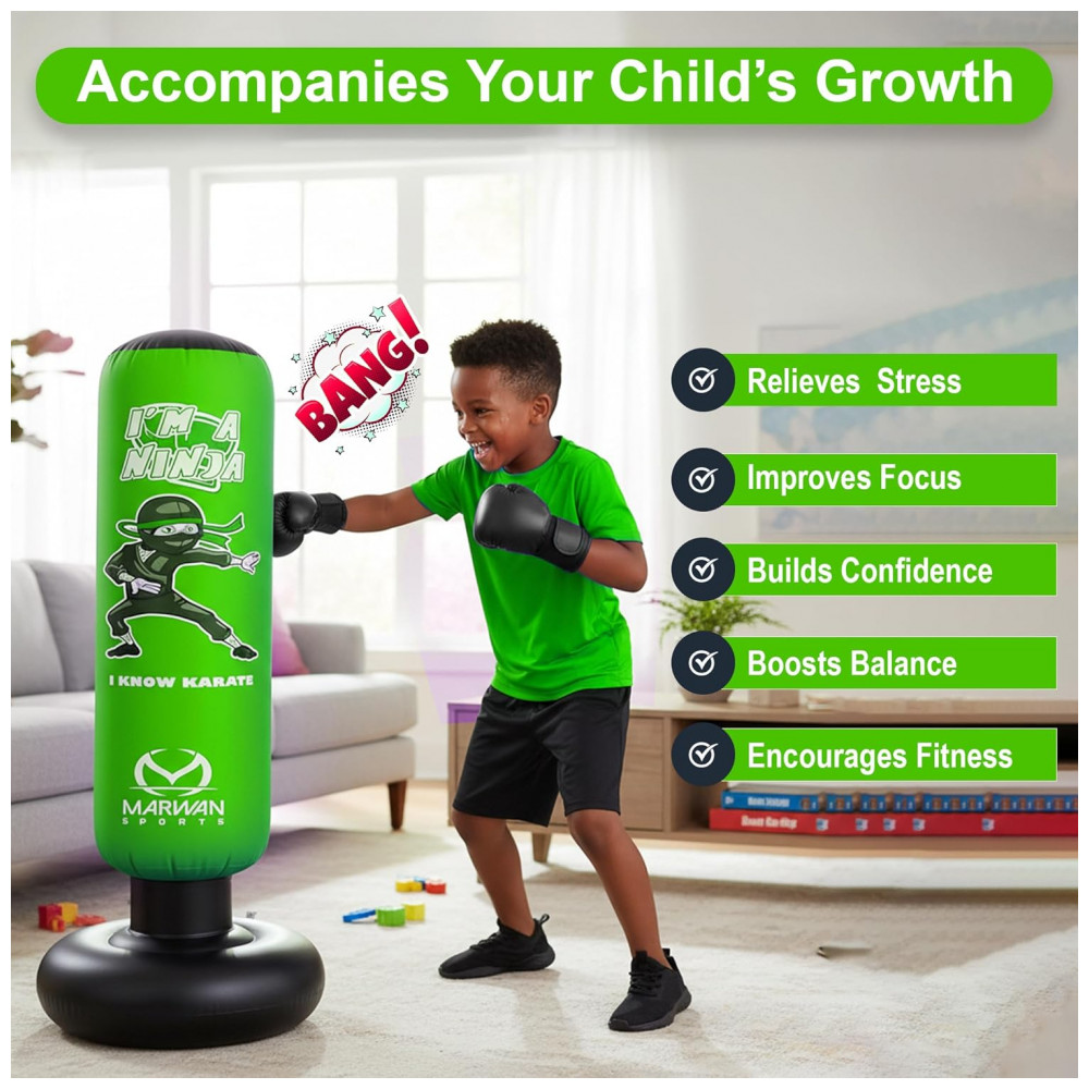 Marwan Sports Saco de Pancadas Inflável 5 em 1 para Crianças 160 cm com Luvas de Boxe Base Estável e Retorno Rápido