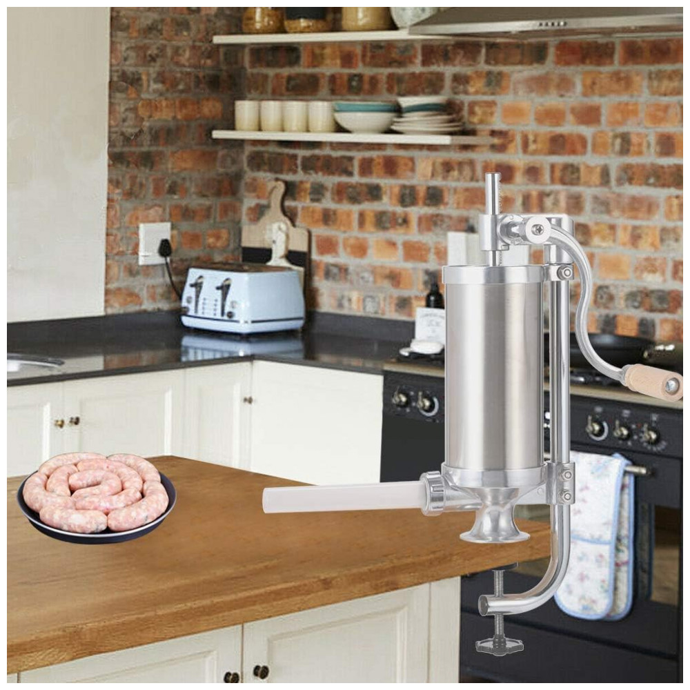 A Máquina de Fazer Linguiças da Master Feng em aço inoxidável é perfeita para preparar linguiças caseiras, salames e outros recheios de carne. Construída com aço inoxidável de alta qualidade, garante durabilidade prolongada e fácil limpeza. Seu design vertical permite um enchimento de linguiça sem esforço. Acompanha vários tubos de enchimento de tamanhos diferentes para acomodar diversos diâmetros de linguiça. Possui base resistente para estabilidade durante o uso e alça ergonômica para maior conforto.