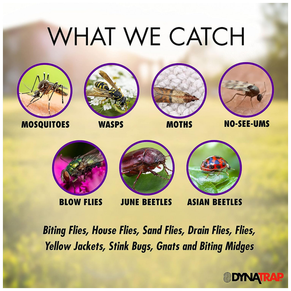 O que capturamos Atrai e captura mosquitos, moscas picadoras, moscas domésticas, mariposas, besouros juninos, vespas, jaquetas amarelas, percevejos, mosquitos e mosquitos picadores