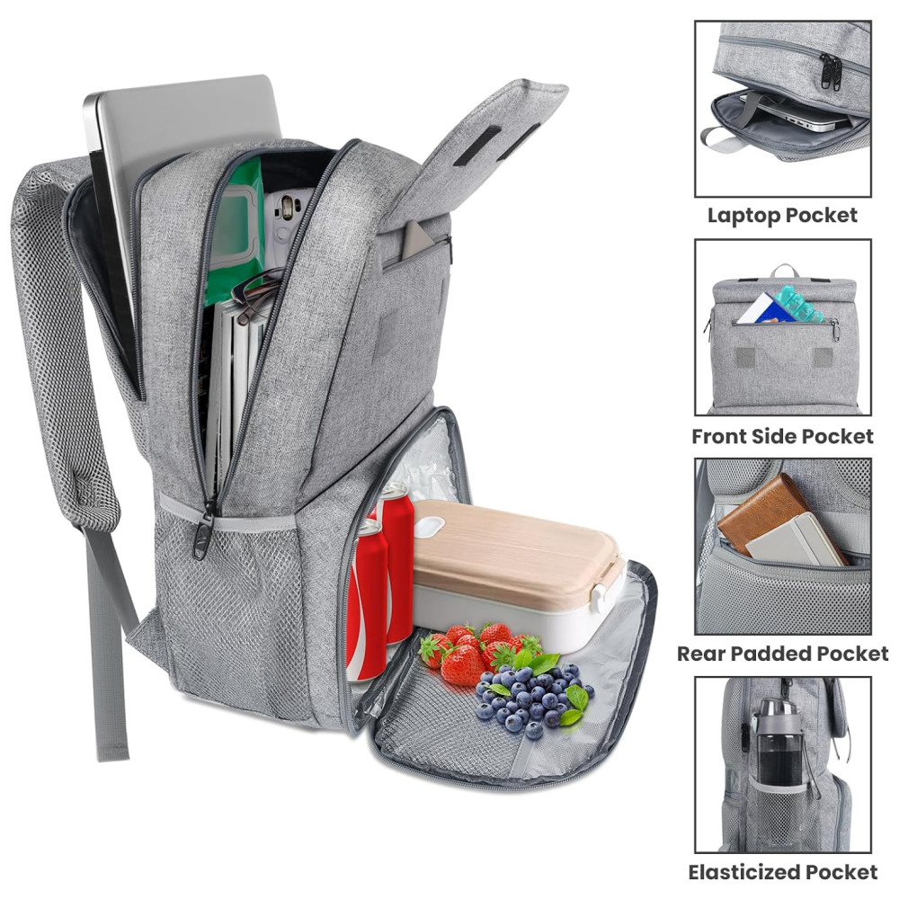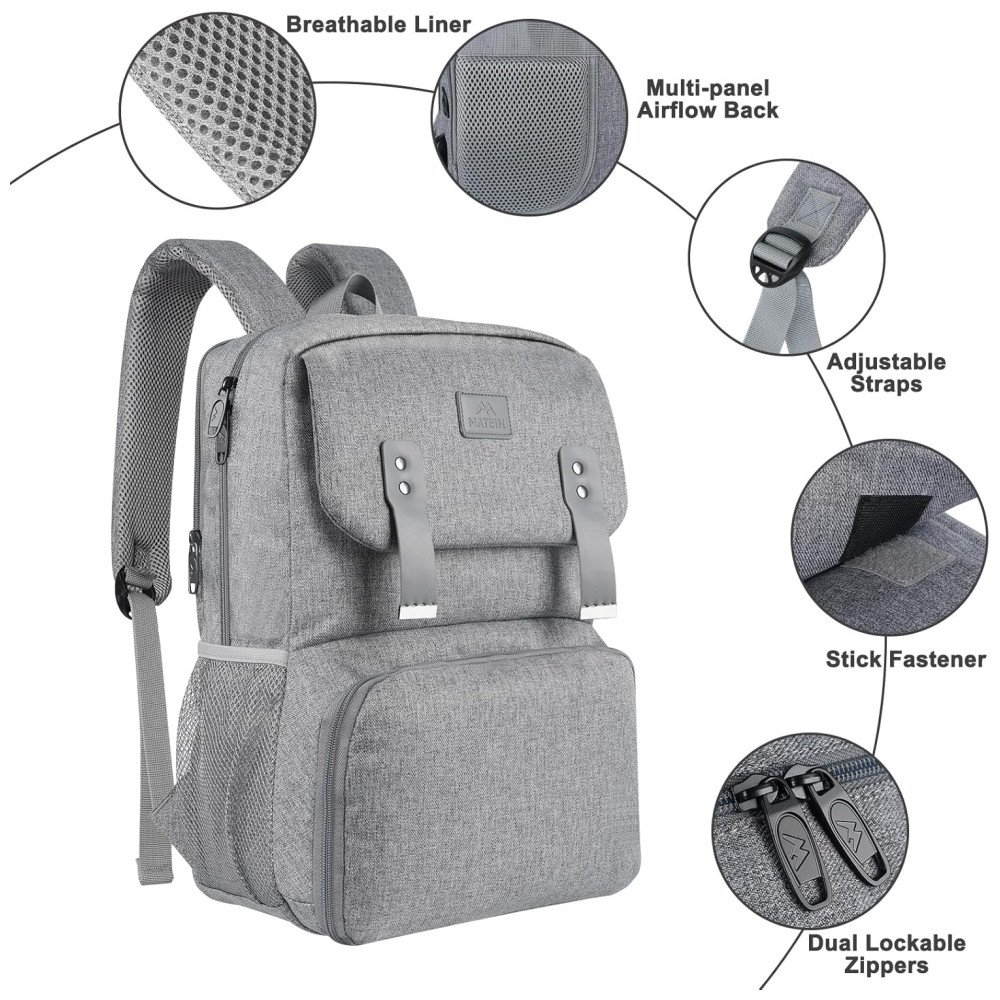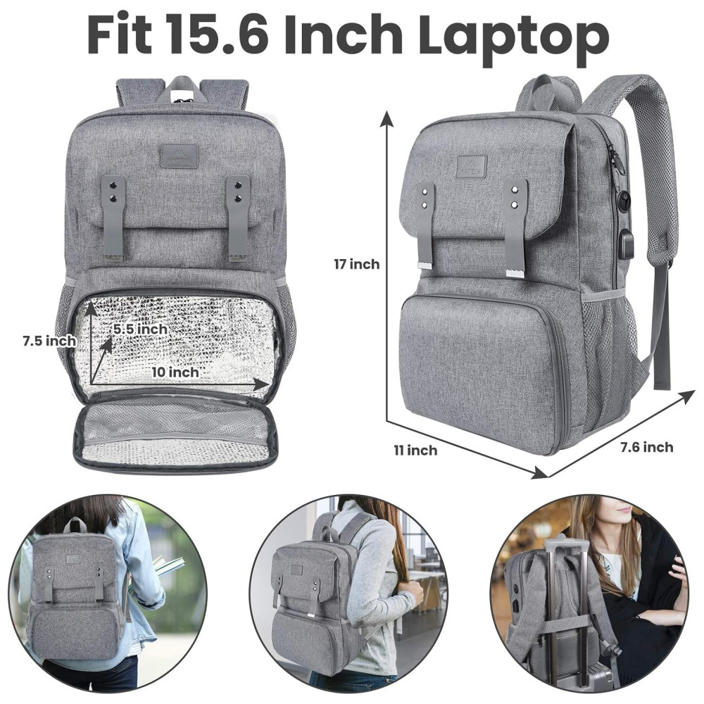 Matein Mochila Feminina Escolar com Porta Lanche Refrigerado Porta USB e Laptop Cinza