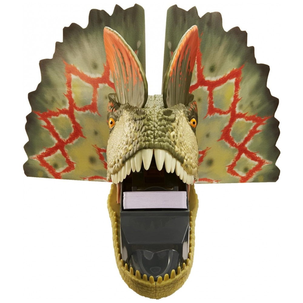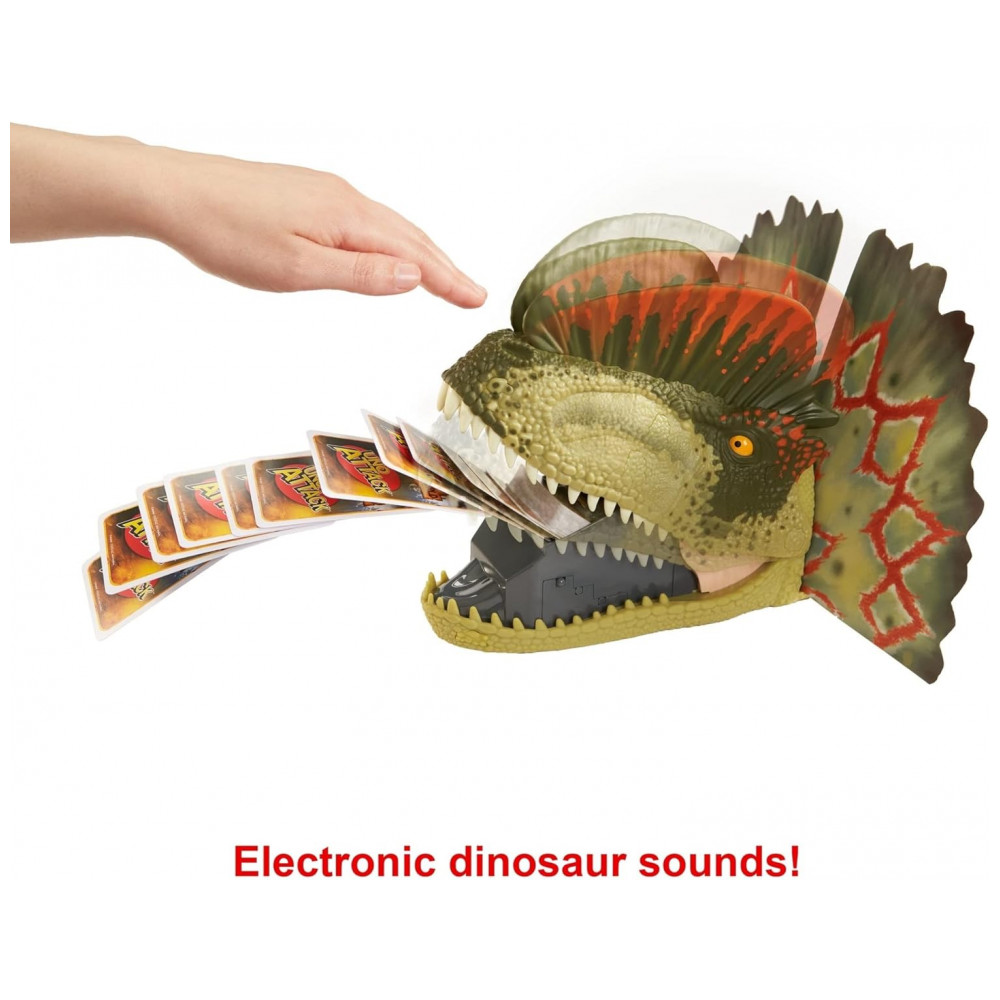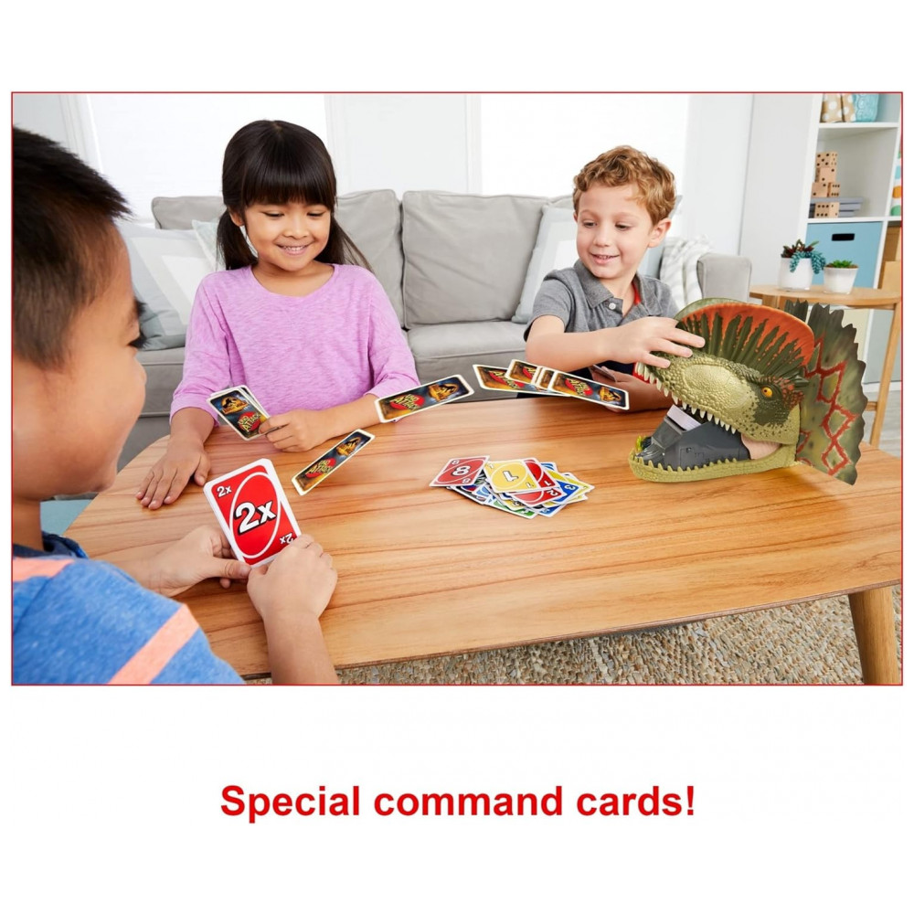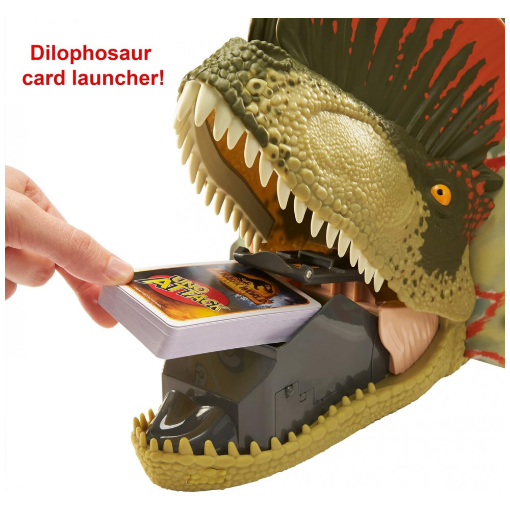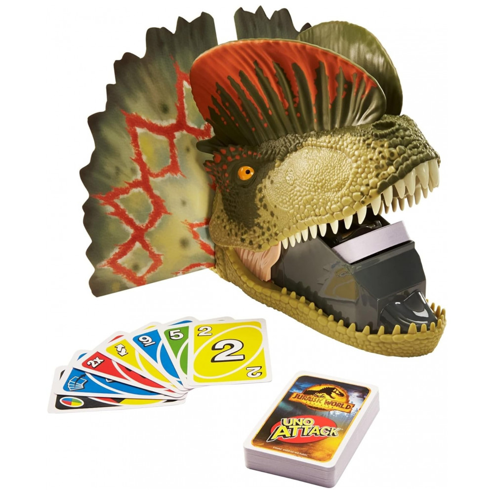 UNO Attack Jurassic World Dominion é uma versão temática do clássico jogo de cartas UNO, que inclui um lançador eletrônico em formato de cabeça de dinossauro com luzes e efeitos sonoros. As cartas são carregadas no lançador e a partida segue as regras tradicionais de combinação de cores e números até que um jogador ative o modo de disparo.