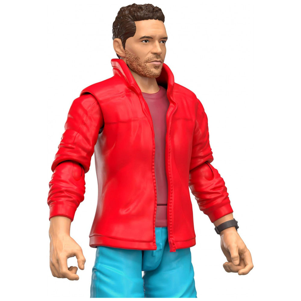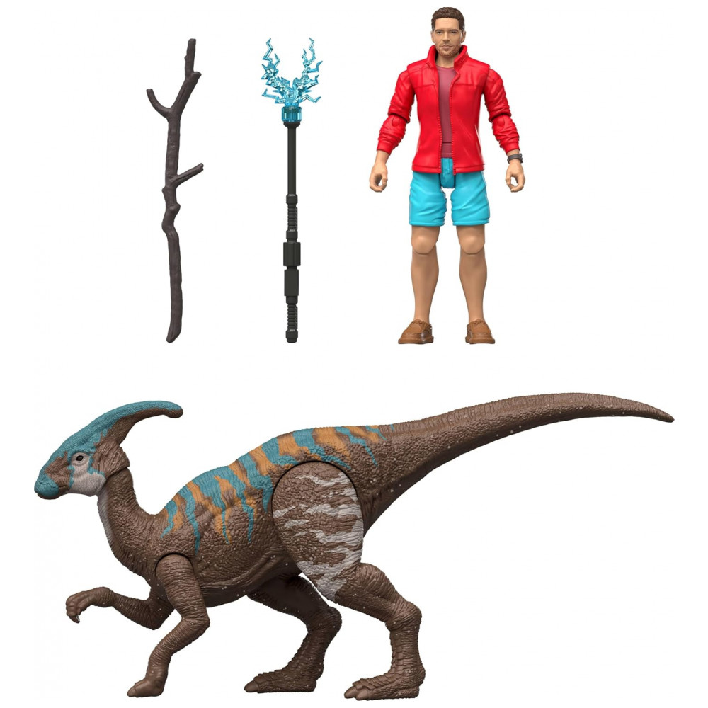 A figura de Reuben Delgado possui múltiplos pontos de articulação, permitindo poses de caminhada, ação e interação com o dinossauro. O Parasaurolophus traz textura de pele e crista detalhadas, com articulações que possibilitam ajustes de postura para uso em brincadeiras ou exposição em coleções.